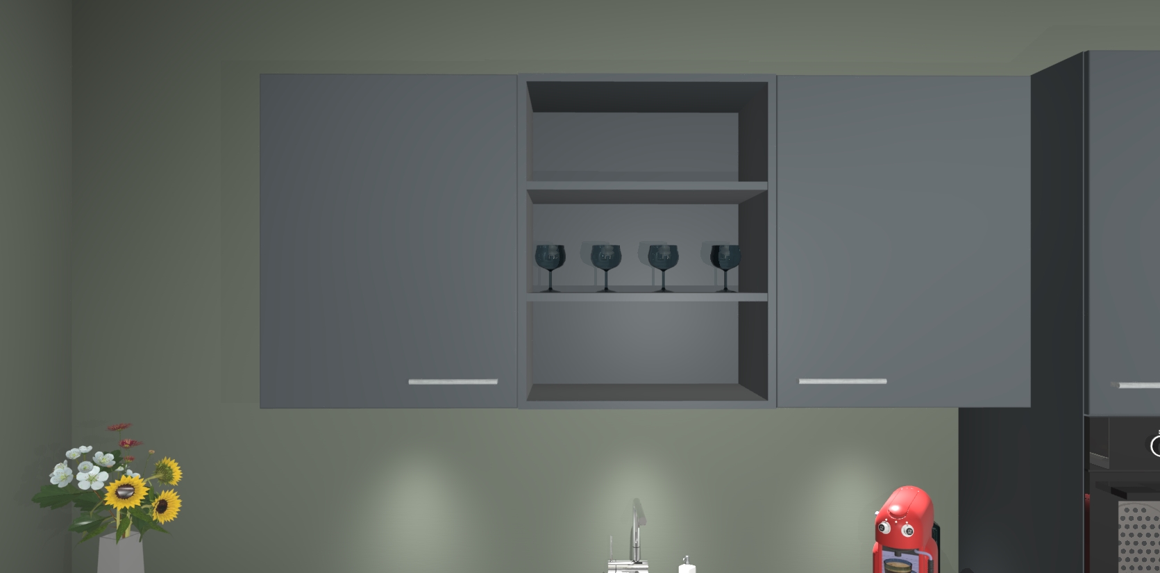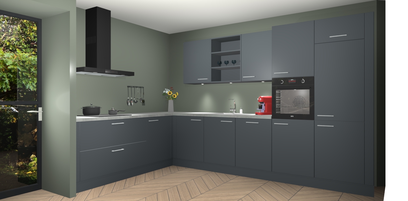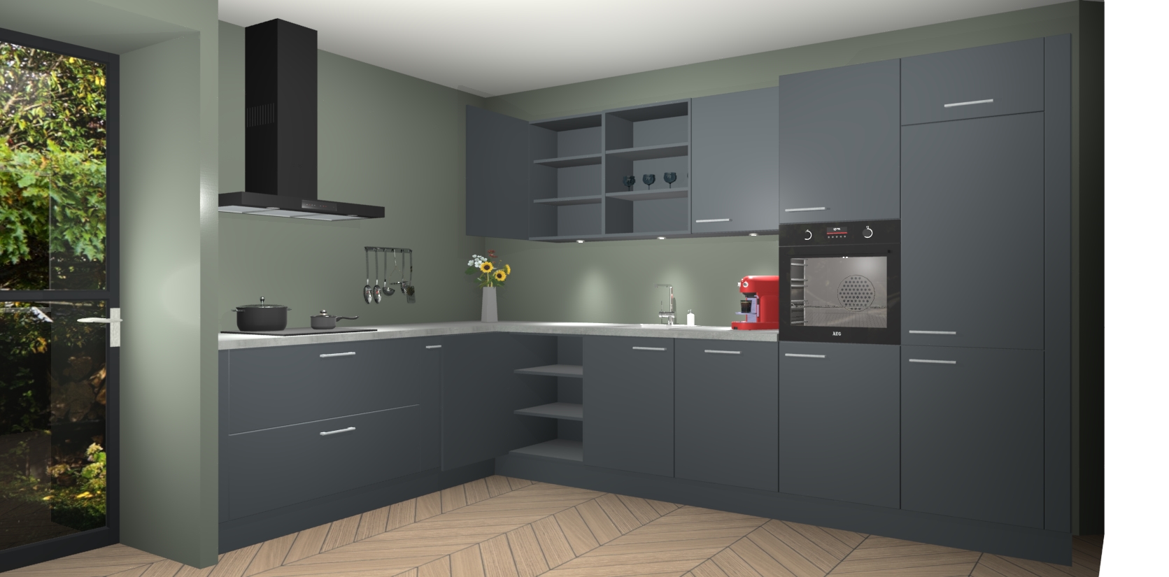 Over opbergruimte hoeft u zich ook geen zorgen te maken! Er is voldoende ruimte voor al uw culinaire behoeftes. Plus, we hebben al 5 inbouwapparaten meegeleverd die gemakkelijk na uw bestelling te upgraden zijn naar AEG: een oven, inductiekookplaat, afzuigkap, vaatwasser en koelkast. En maakt u zich geen zorgen - alle deuren sluiten zacht, dus u hoeft zich geen zorgen te maken over dichtslaande deuren of lawaai terwijl u kookt.