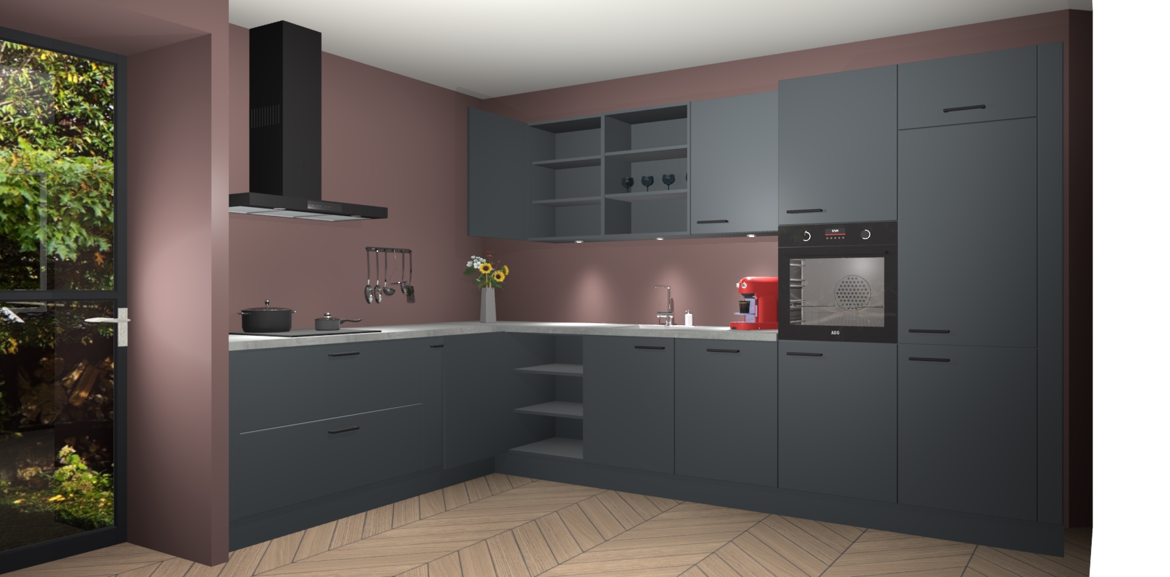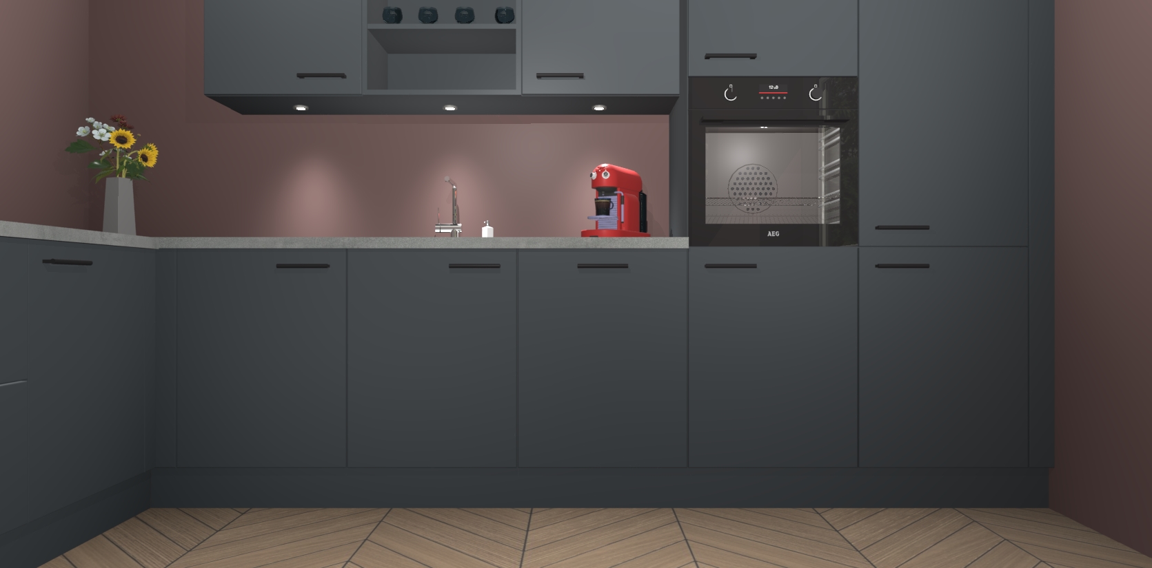 Over opbergruimte hoeft u zich ook geen zorgen te maken! Er is voldoende ruimte voor al uw culinaire behoeftes. Plus, we hebben al 5 inbouwapparaten meegeleverd die gemakkelijk na uw bestelling te upgraden zijn naar AEG: een oven, inductiekookplaat, afzuigkap, vaatwasser en koelkast. En maakt u zich geen zorgen - alle deuren sluiten zacht, dus u hoeft zich geen zorgen te maken over dichtslaande deuren of lawaai terwijl u kookt.