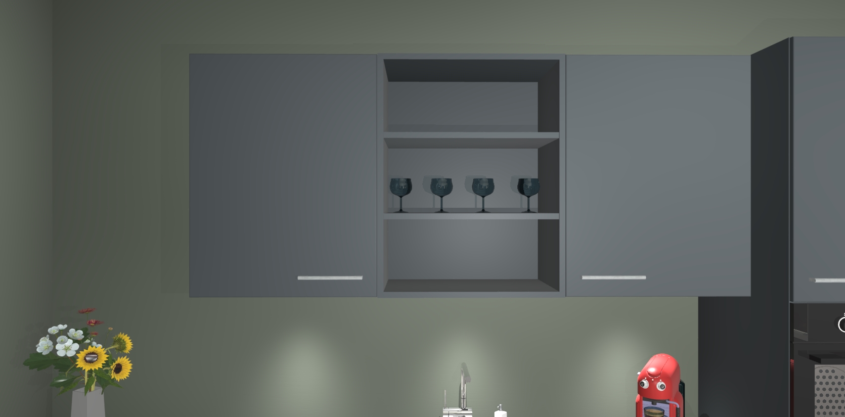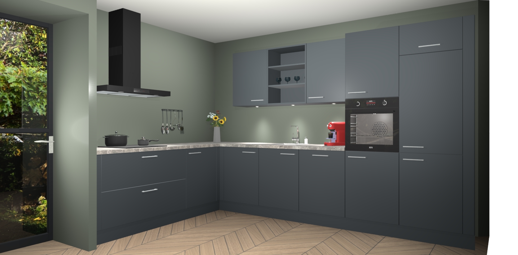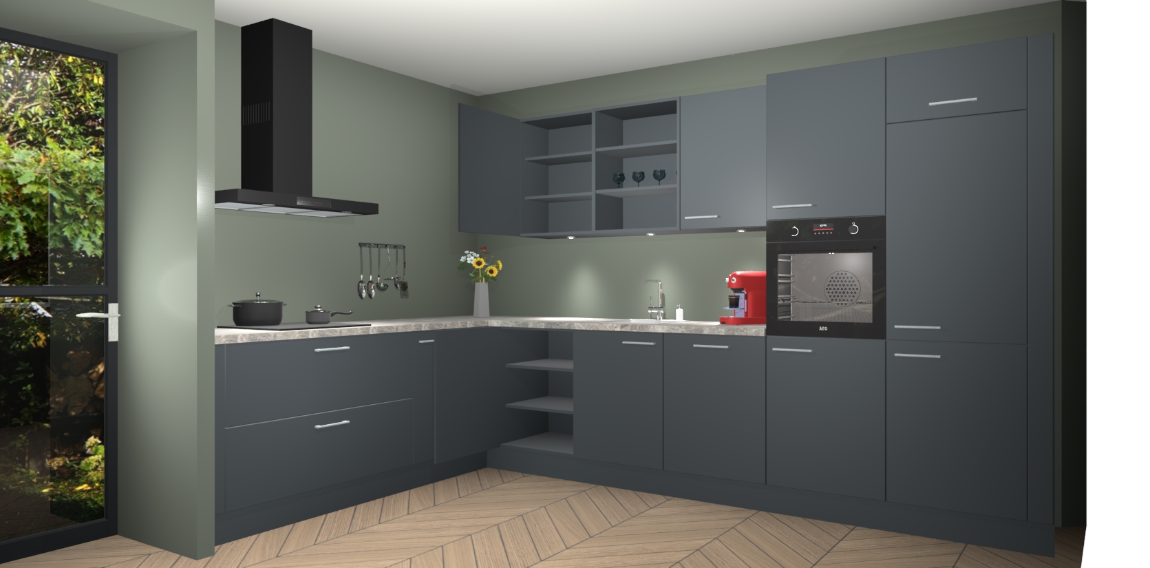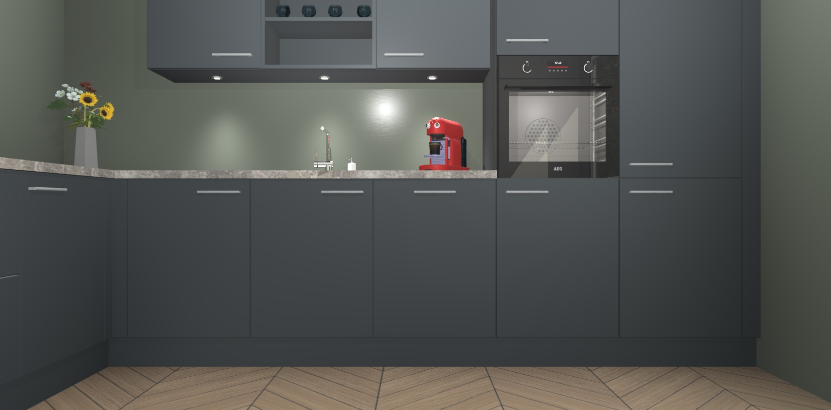 Over opbergruimte hoeft u zich ook geen zorgen te maken! Er is voldoende ruimte voor al uw culinaire behoeftes. Plus, we hebben al 5 inbouwapparaten meegeleverd die gemakkelijk na uw bestelling te upgraden zijn naar AEG: een oven, inductiekookplaat, afzuigkap, vaatwasser en koelkast. En maakt u zich geen zorgen - alle deuren sluiten zacht, dus u hoeft zich geen zorgen te maken over dichtslaande deuren of lawaai terwijl u kookt.