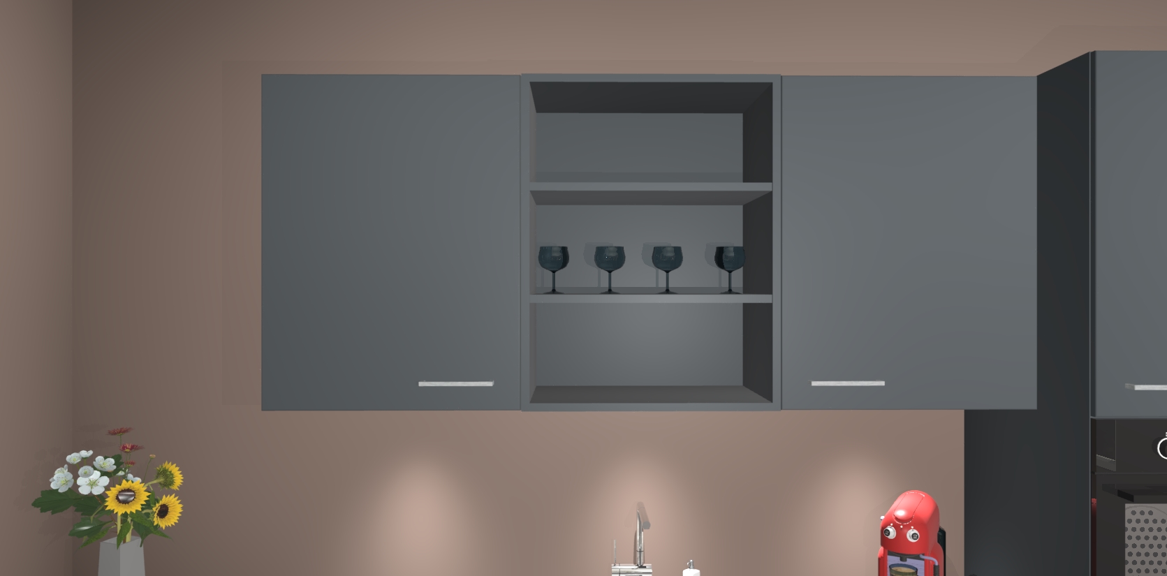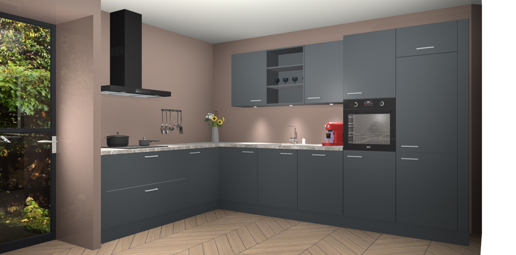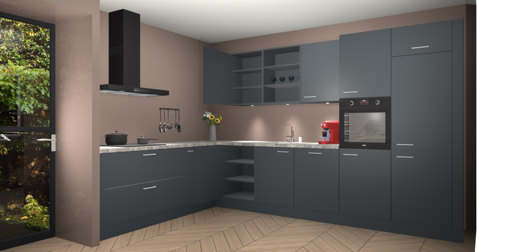 Over opbergruimte hoeft u zich ook geen zorgen te maken! Er is voldoende ruimte voor al uw culinaire behoeftes. Plus, we hebben al 5 inbouwapparaten meegeleverd die gemakkelijk na uw bestelling te upgraden zijn naar AEG: een oven, inductiekookplaat, afzuigkap, vaatwasser en koelkast. En maakt u zich geen zorgen - alle deuren sluiten zacht, dus u hoeft zich geen zorgen te maken over dichtslaande deuren of lawaai terwijl u kookt.