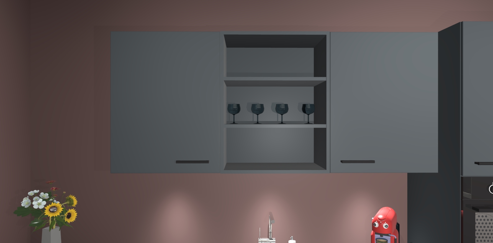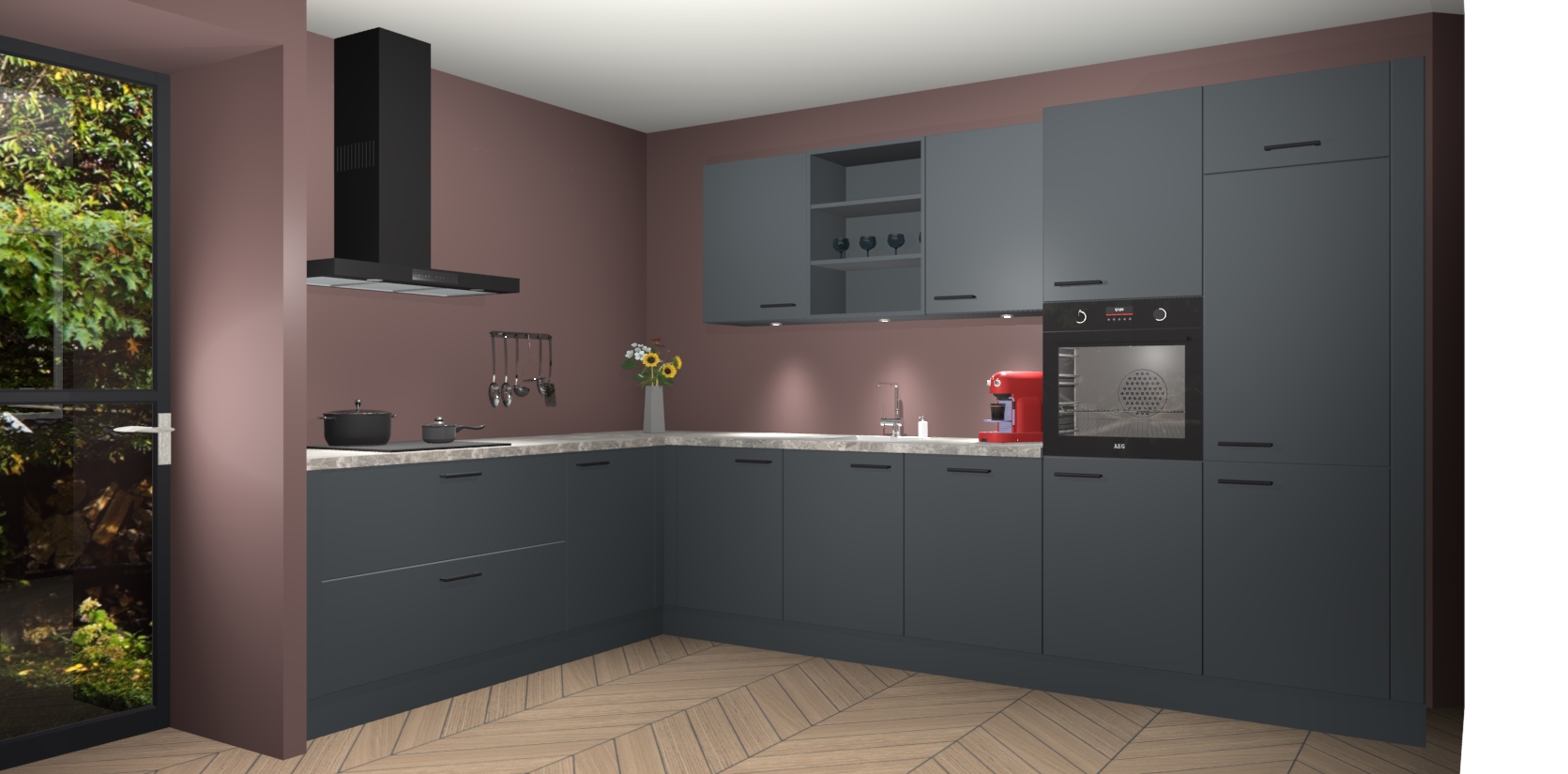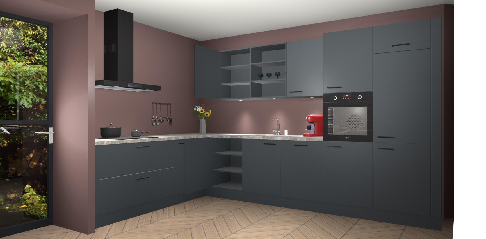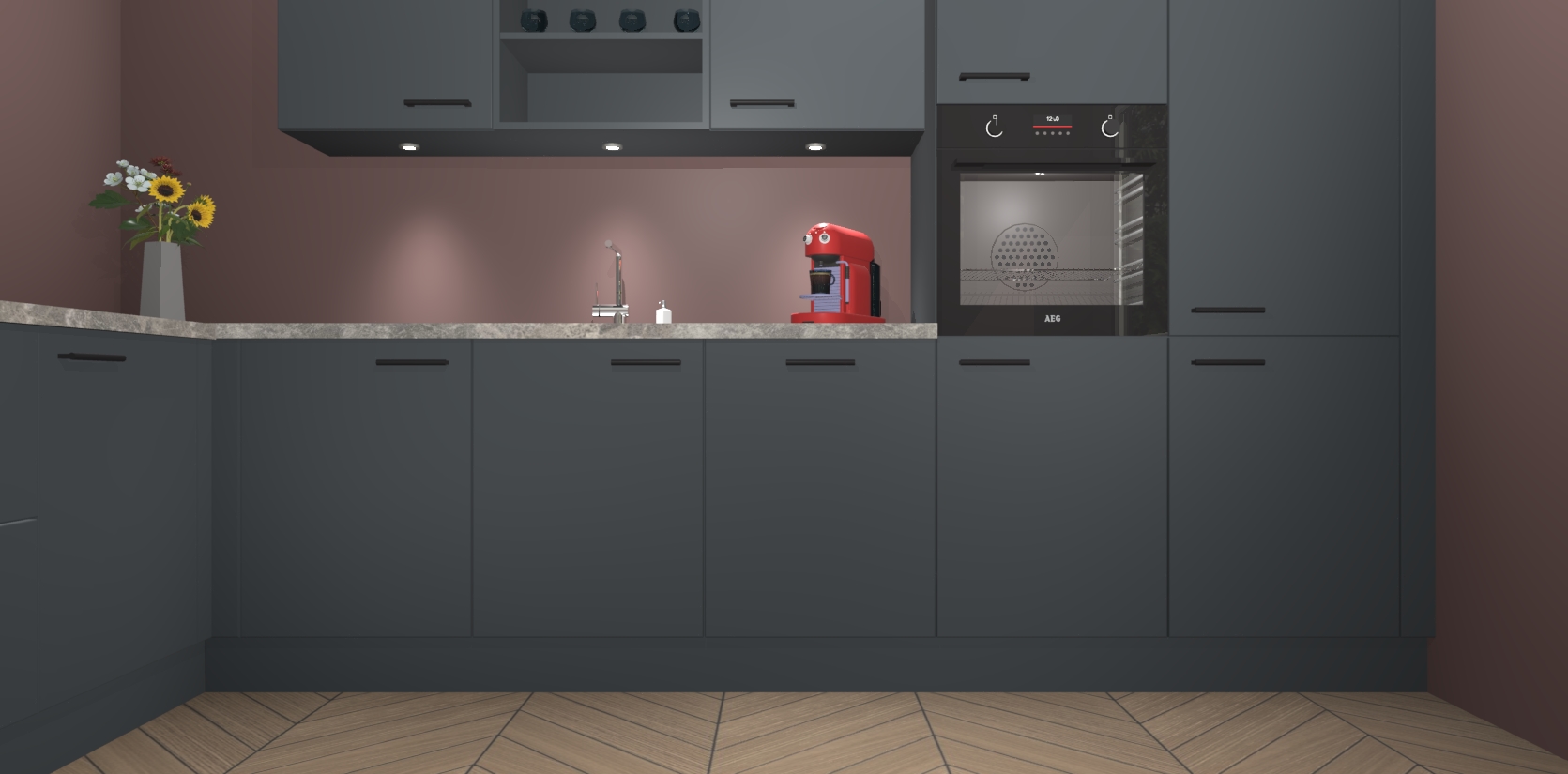 Over opbergruimte hoeft u zich ook geen zorgen te maken! Er is voldoende ruimte voor al uw culinaire behoeftes. Plus, we hebben al 5 inbouwapparaten meegeleverd die gemakkelijk na uw bestelling te upgraden zijn naar AEG: een oven, inductiekookplaat, afzuigkap, vaatwasser en koelkast. En maakt u zich geen zorgen - alle deuren sluiten zacht, dus u hoeft zich geen zorgen te maken over dichtslaande deuren of lawaai terwijl u kookt.