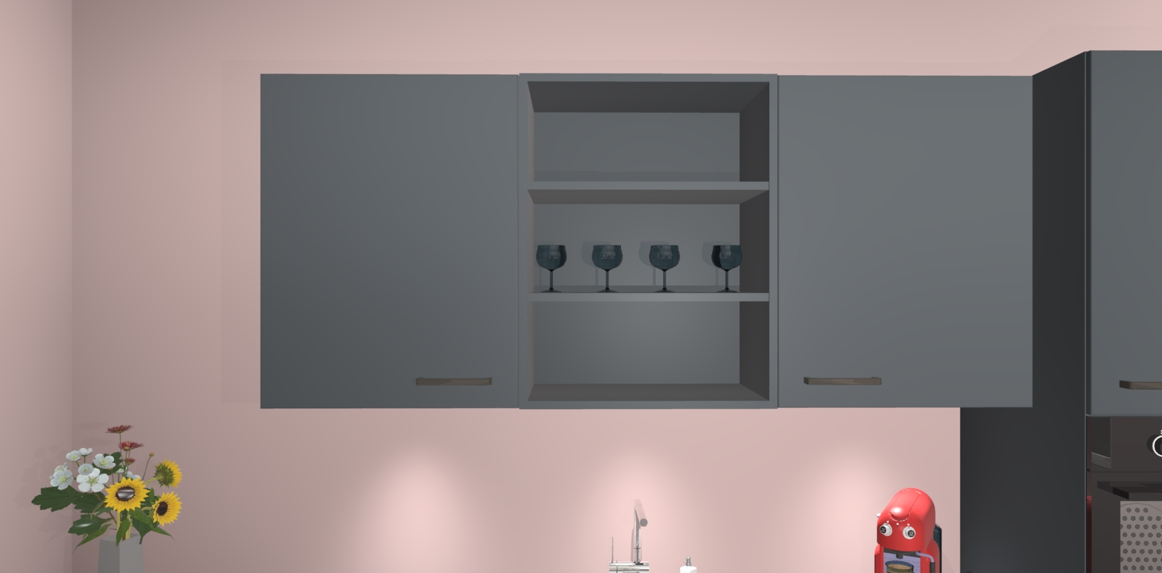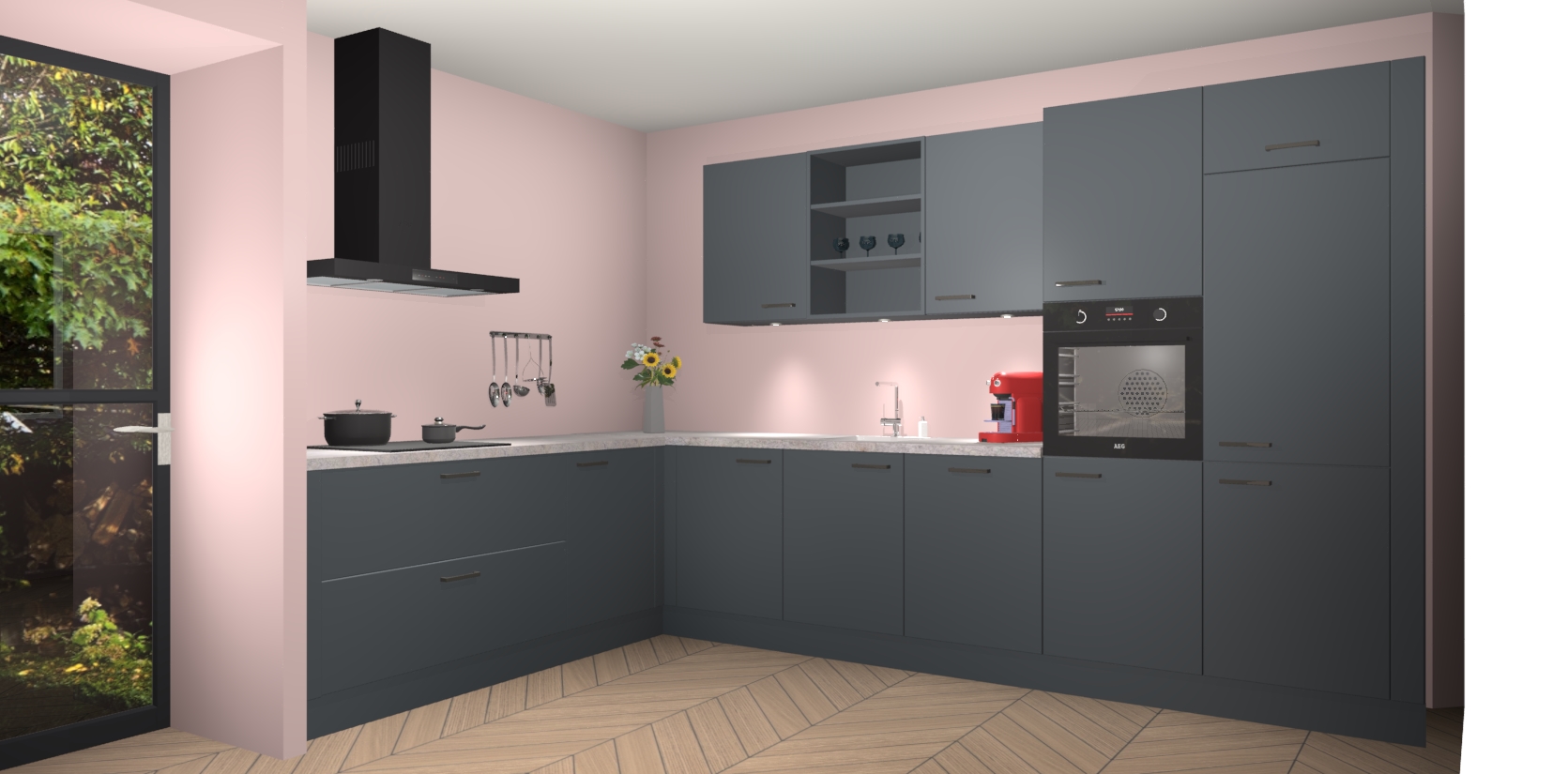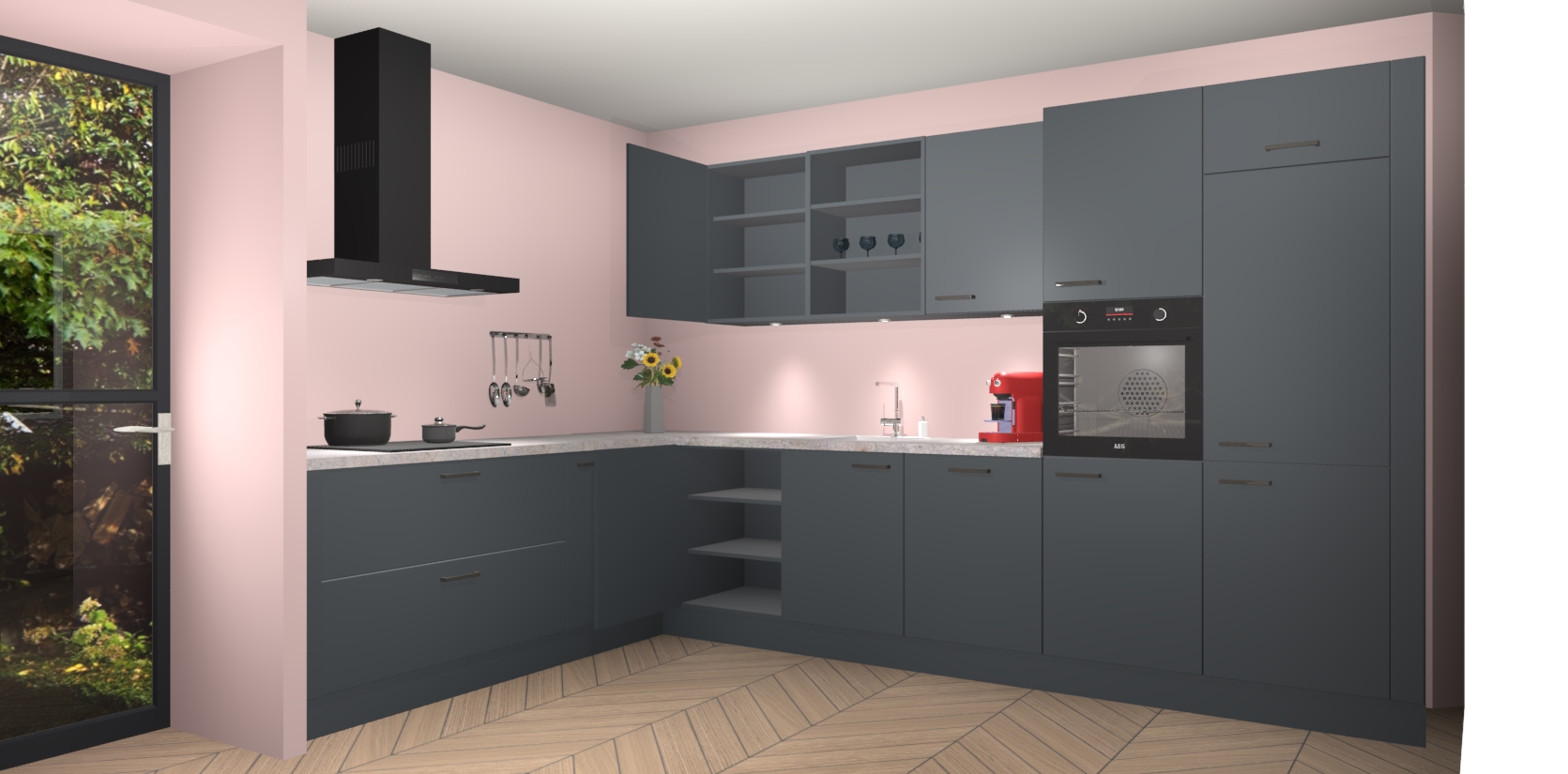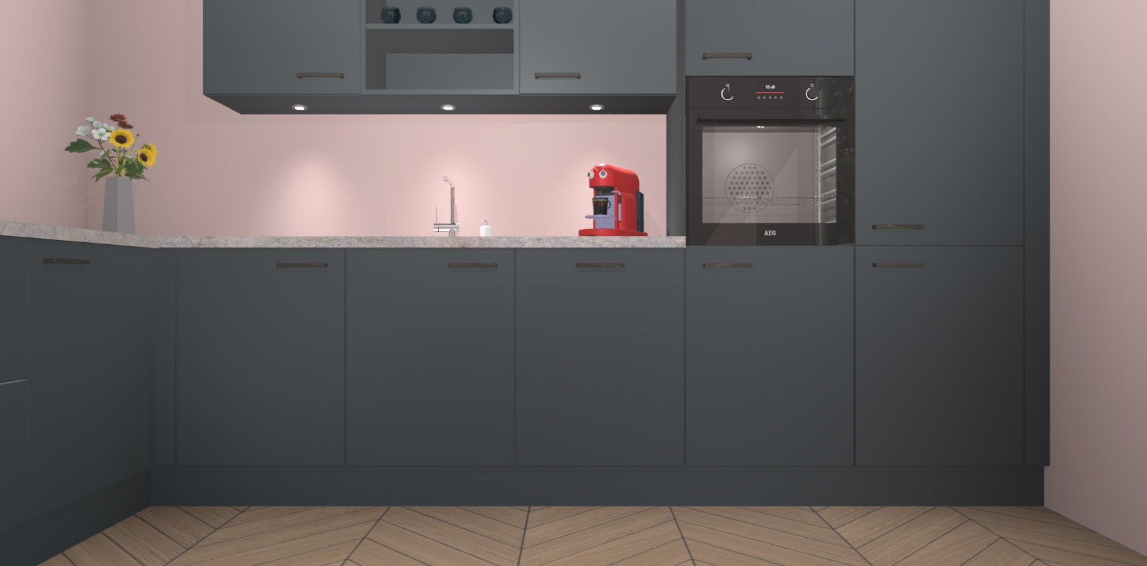 Over opbergruimte hoeft u zich ook geen zorgen te maken! Er is voldoende ruimte voor al uw culinaire behoeftes. Plus, we hebben al 5 inbouwapparaten meegeleverd die gemakkelijk na uw bestelling te upgraden zijn naar AEG: een oven, inductiekookplaat, afzuigkap, vaatwasser en koelkast. En maakt u zich geen zorgen - alle deuren sluiten zacht, dus u hoeft zich geen zorgen te maken over dichtslaande deuren of lawaai terwijl u kookt.