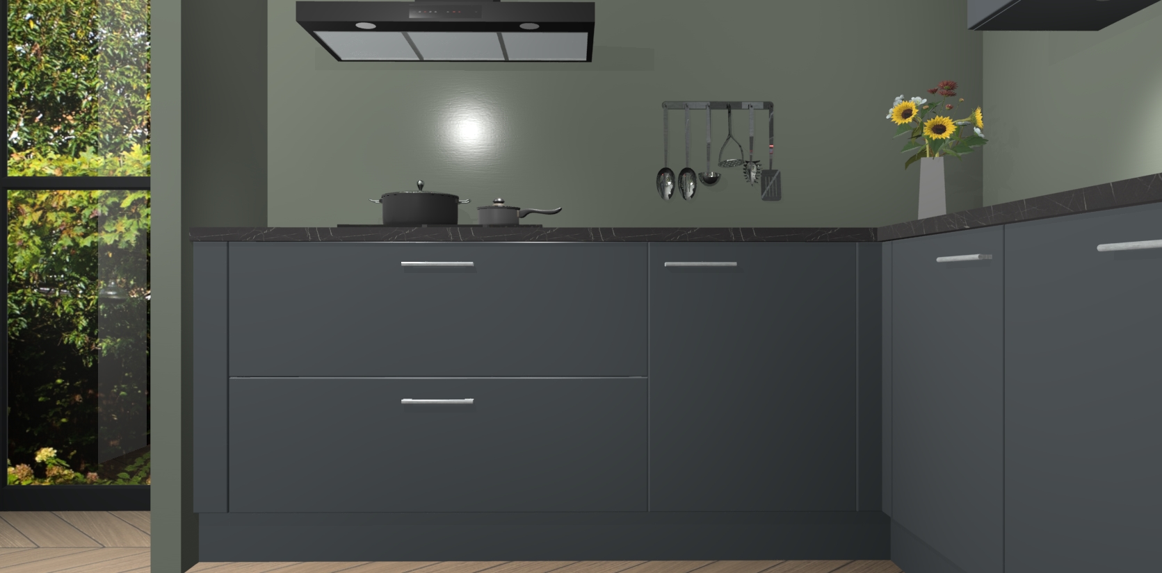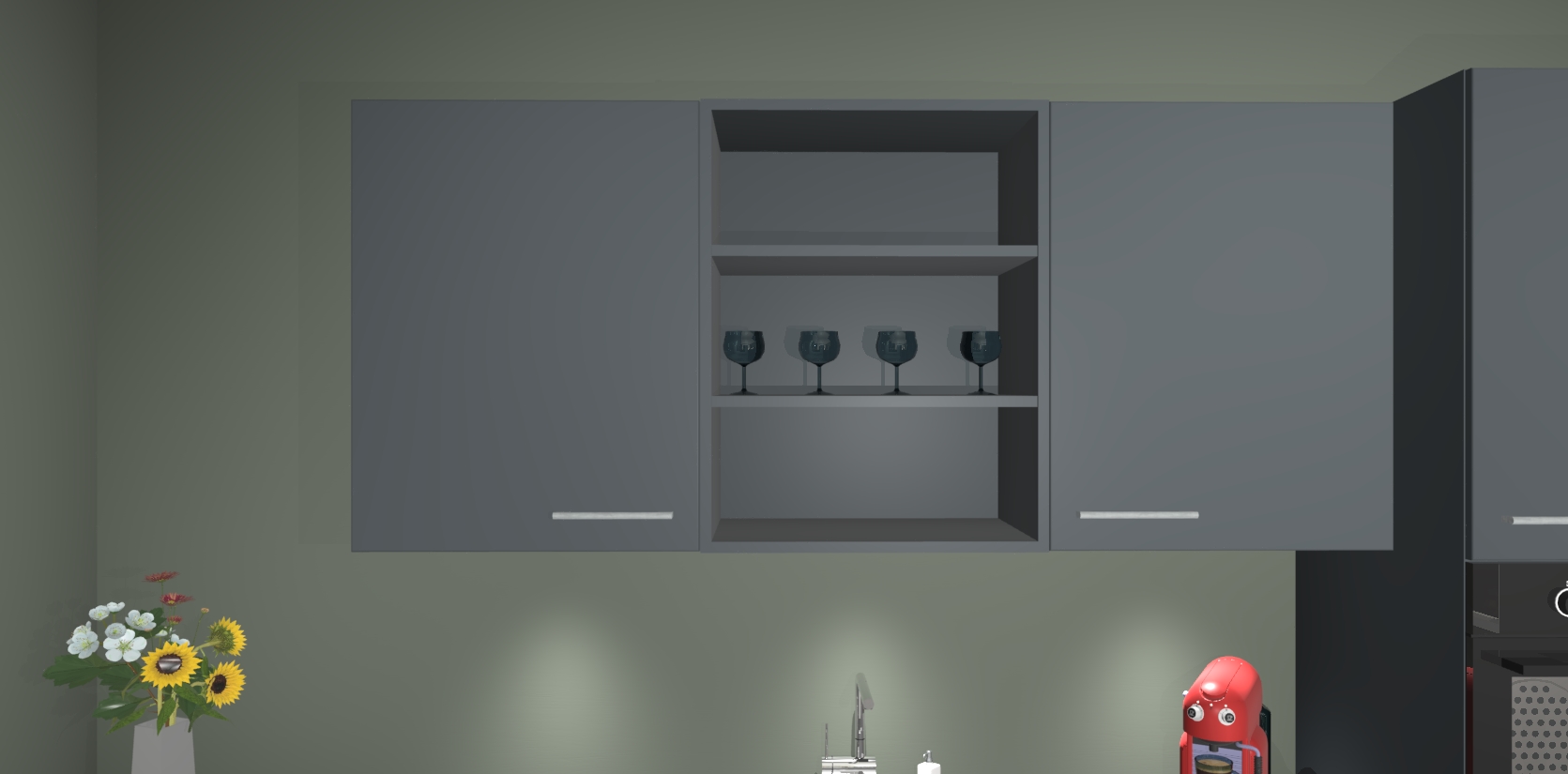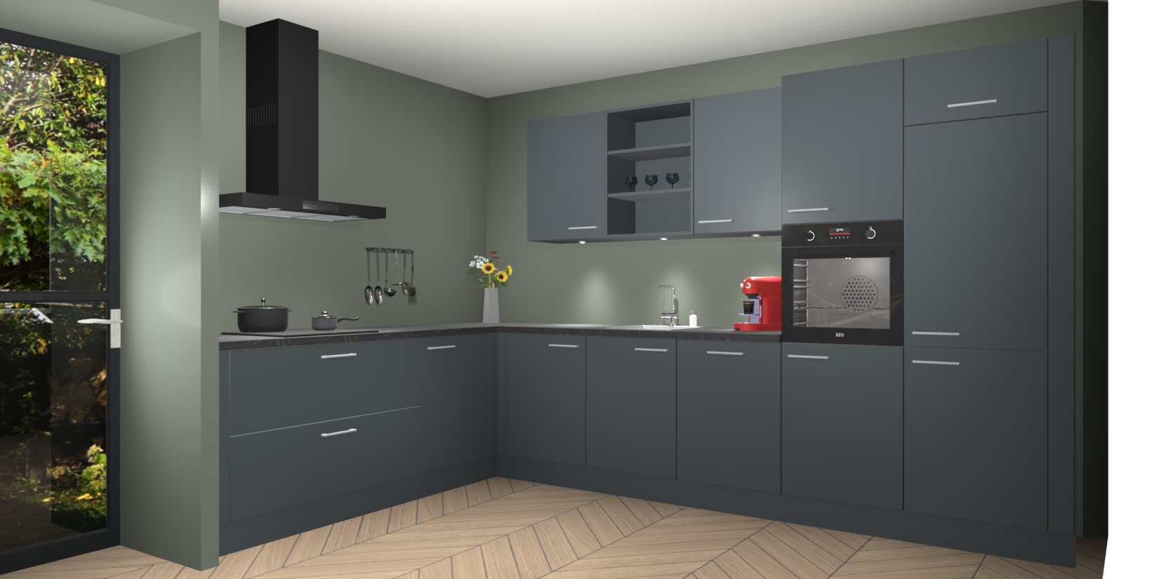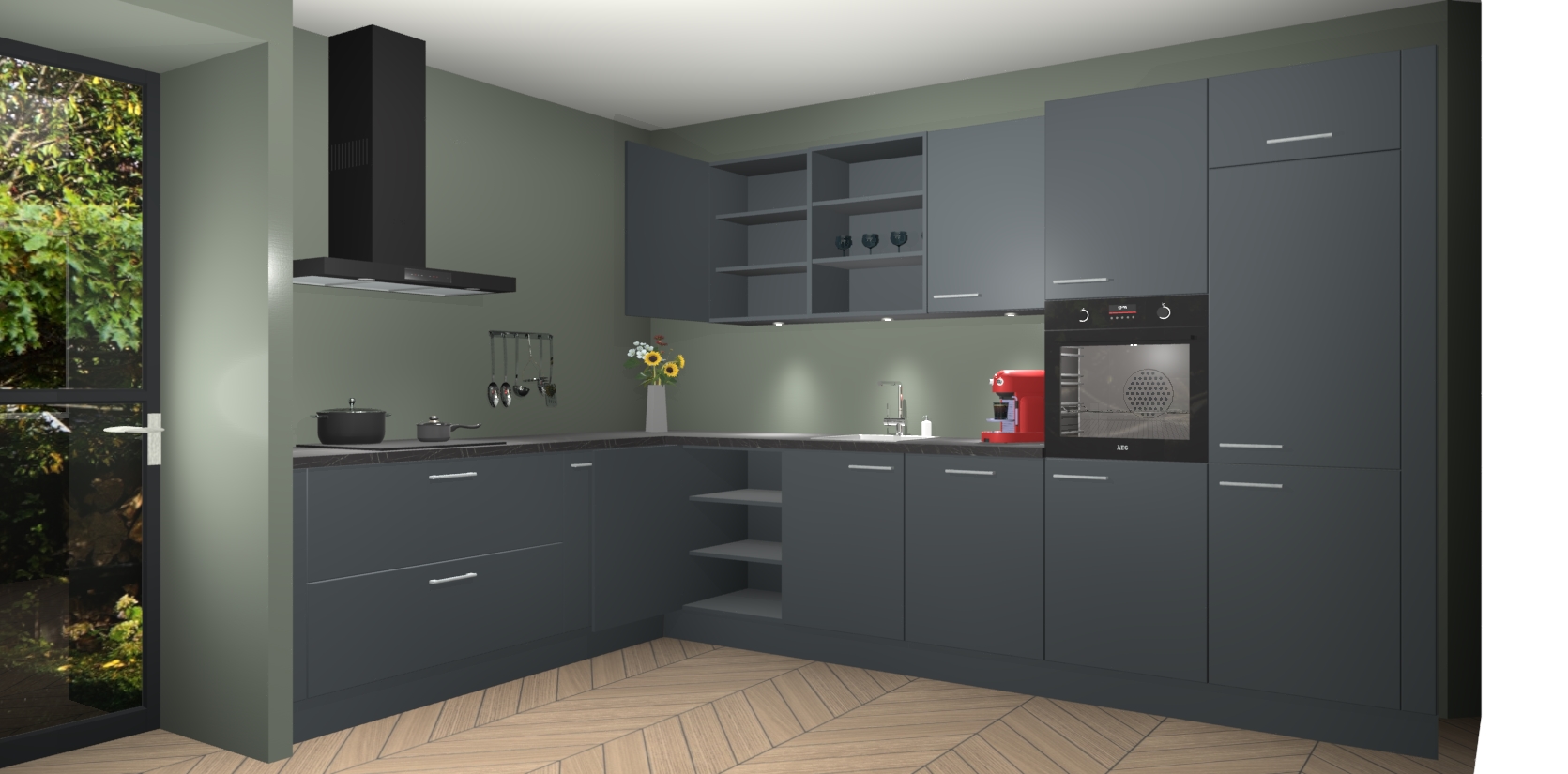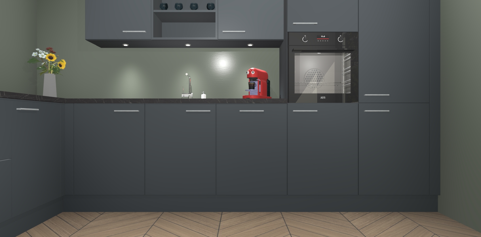 Over opbergruimte hoeft u zich ook geen zorgen te maken! Er is voldoende ruimte voor al uw culinaire behoeftes. Plus, we hebben al 5 inbouwapparaten meegeleverd die gemakkelijk na uw bestelling te upgraden zijn naar AEG: een oven, inductiekookplaat, afzuigkap, vaatwasser en koelkast. En maakt u zich geen zorgen - alle deuren sluiten zacht, dus u hoeft zich geen zorgen te maken over dichtslaande deuren of lawaai terwijl u kookt.