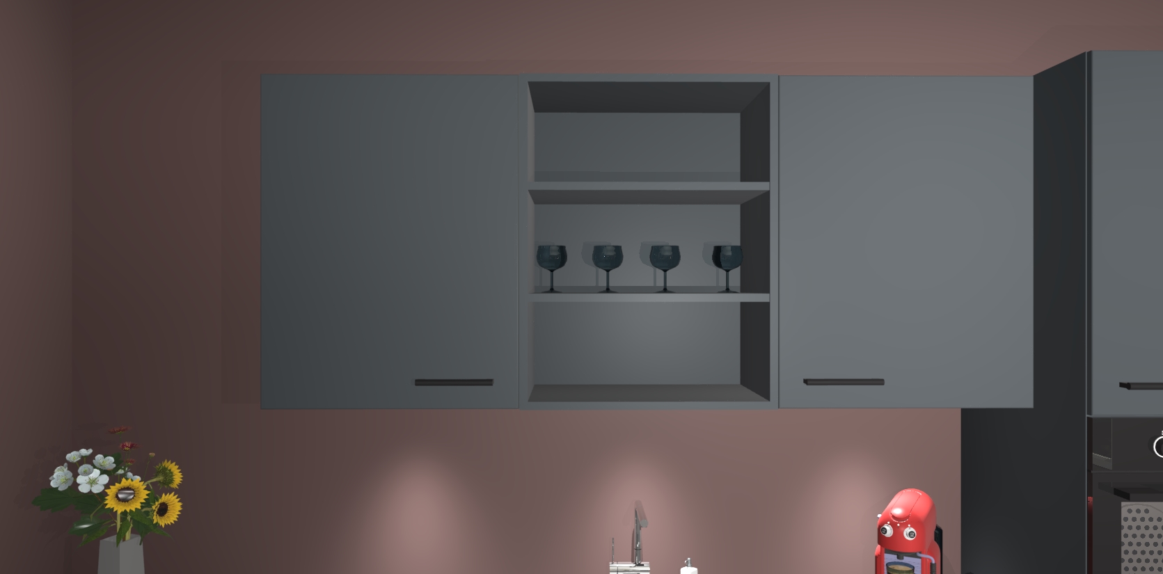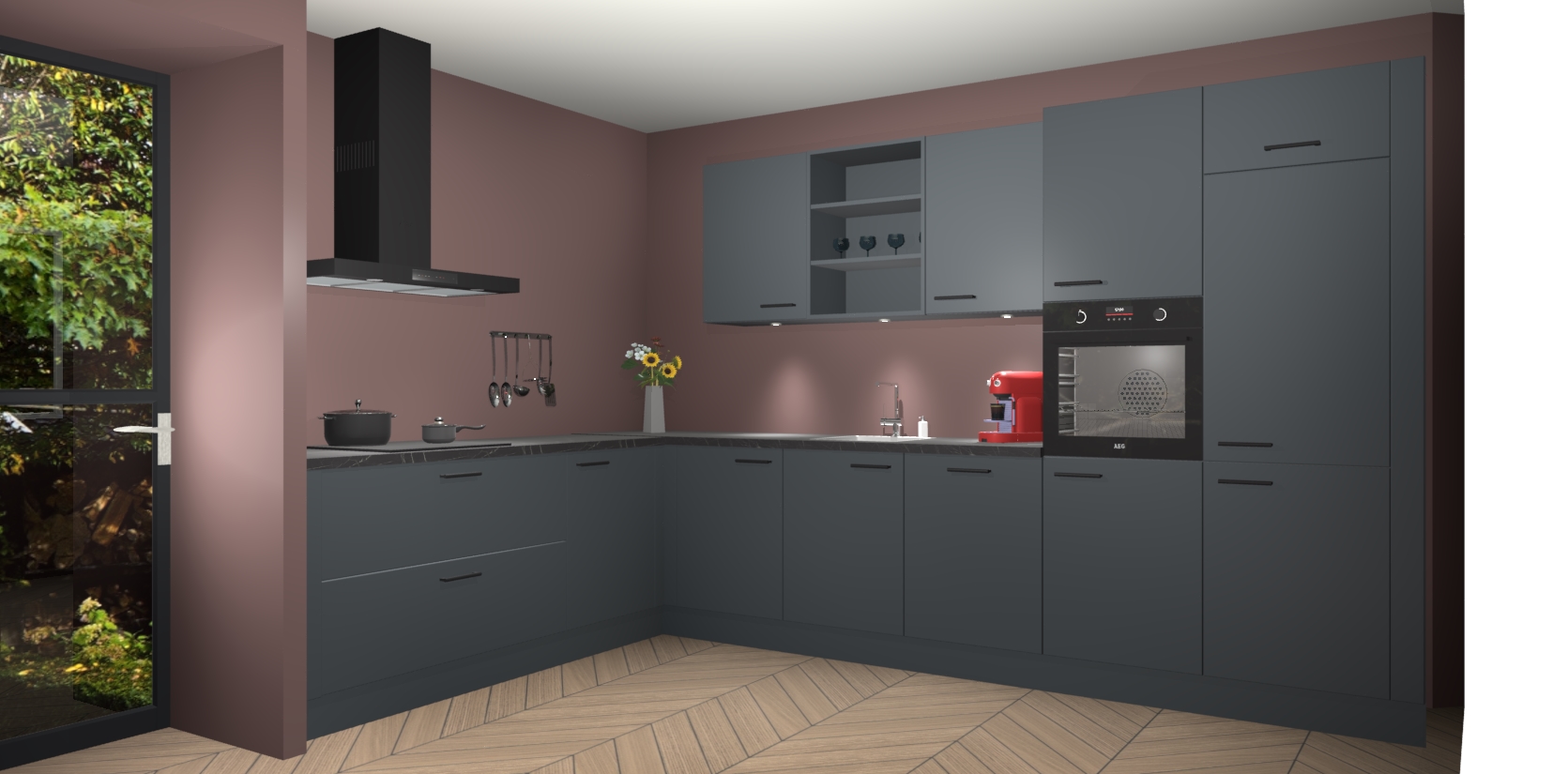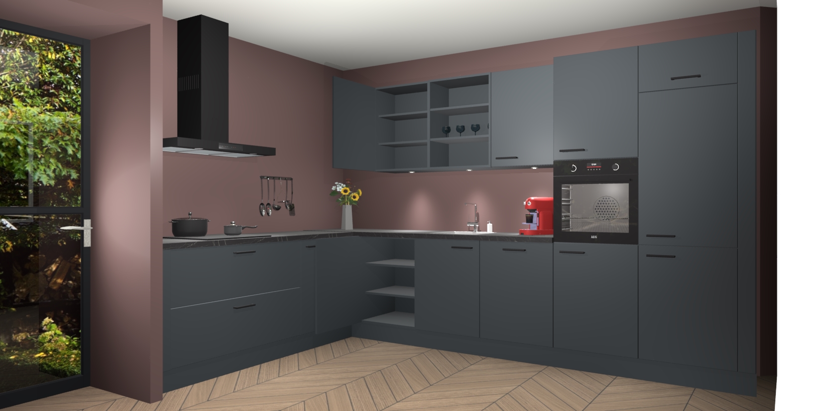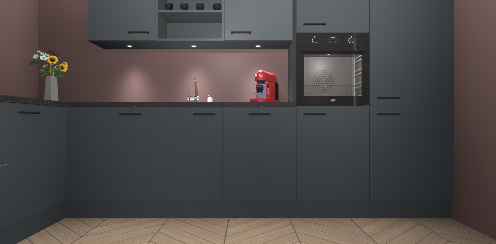Over opbergruimte hoeft u zich ook geen zorgen te maken! Er is voldoende ruimte voor al uw culinaire behoeftes. Plus, we hebben al 5 inbouwapparaten meegeleverd die gemakkelijk na uw bestelling te upgraden zijn naar AEG: een oven, inductiekookplaat, afzuigkap, vaatwasser en koelkast. En maakt u zich geen zorgen - alle deuren sluiten zacht, dus u hoeft zich geen zorgen te maken over dichtslaande deuren of lawaai terwijl u kookt.