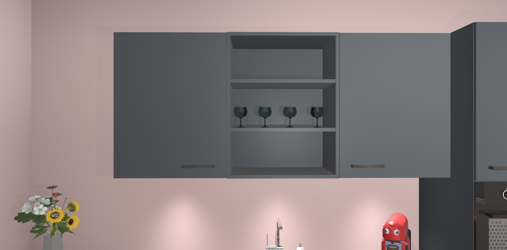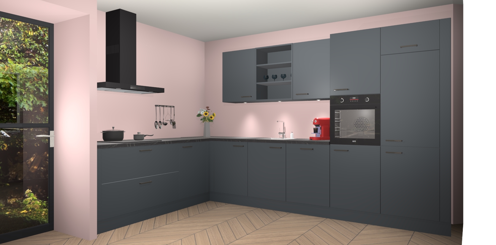 Over opbergruimte hoeft u zich ook geen zorgen te maken! Er is voldoende ruimte voor al uw culinaire behoeftes. Plus, we hebben al 5 inbouwapparaten meegeleverd die gemakkelijk na uw bestelling te upgraden zijn naar AEG: een oven, inductiekookplaat, afzuigkap, vaatwasser en koelkast. En maakt u zich geen zorgen - alle deuren sluiten zacht, dus u hoeft zich geen zorgen te maken over dichtslaande deuren of lawaai terwijl u kookt.