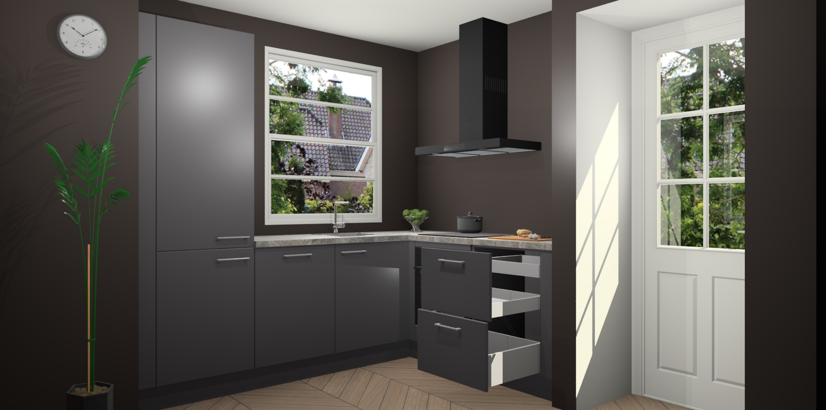 Wilt u een echte aanwinst voor uw keuken, maar bent u op zoek naar iets specialers dan de standaardkeukens? Kies dan voor de Onyxgrijze keuken Harbin! Dit prachtige hoekkeukenontwerp geeft u alle ruimte om optimaal te genieten van heerlijk koken. Het uitmuntende afwerkingsniveau, de fraaie houtstructuur en de sfeervolle zwarte grepen maken van de Onyxgrijze keuken Harbin de perfecte keuze voor zowel enthousiaste thuiskoks als design-minded interieurliefhebbers.