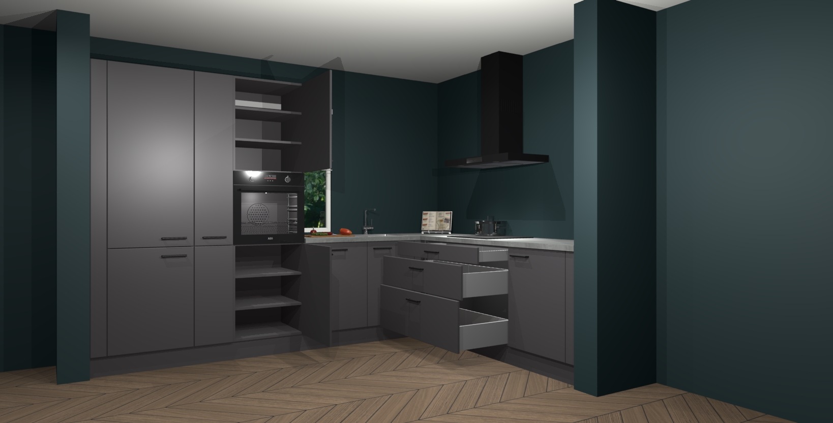 Met een modern, tijdloos design en ruime opslagruimte, zult u zich in no-time thuis voelen in uw nieuwe keuken. Uw leven wordt eenvoudiger met de soft-close deuren die voor het ultieme stille comfort zorgen - geen geluid dat u stoort terwijl u kookt. Ook is de keuken voorzien van 5 ingebouwde apparaten: een oven, inductie kookplaat, afzuigkap, vaatwasser en koelkast. Deze kunnen gemakkelijk na bestelling worden bijgewerkt naar AEG - waardoor uw luxe ervaring compleet is.