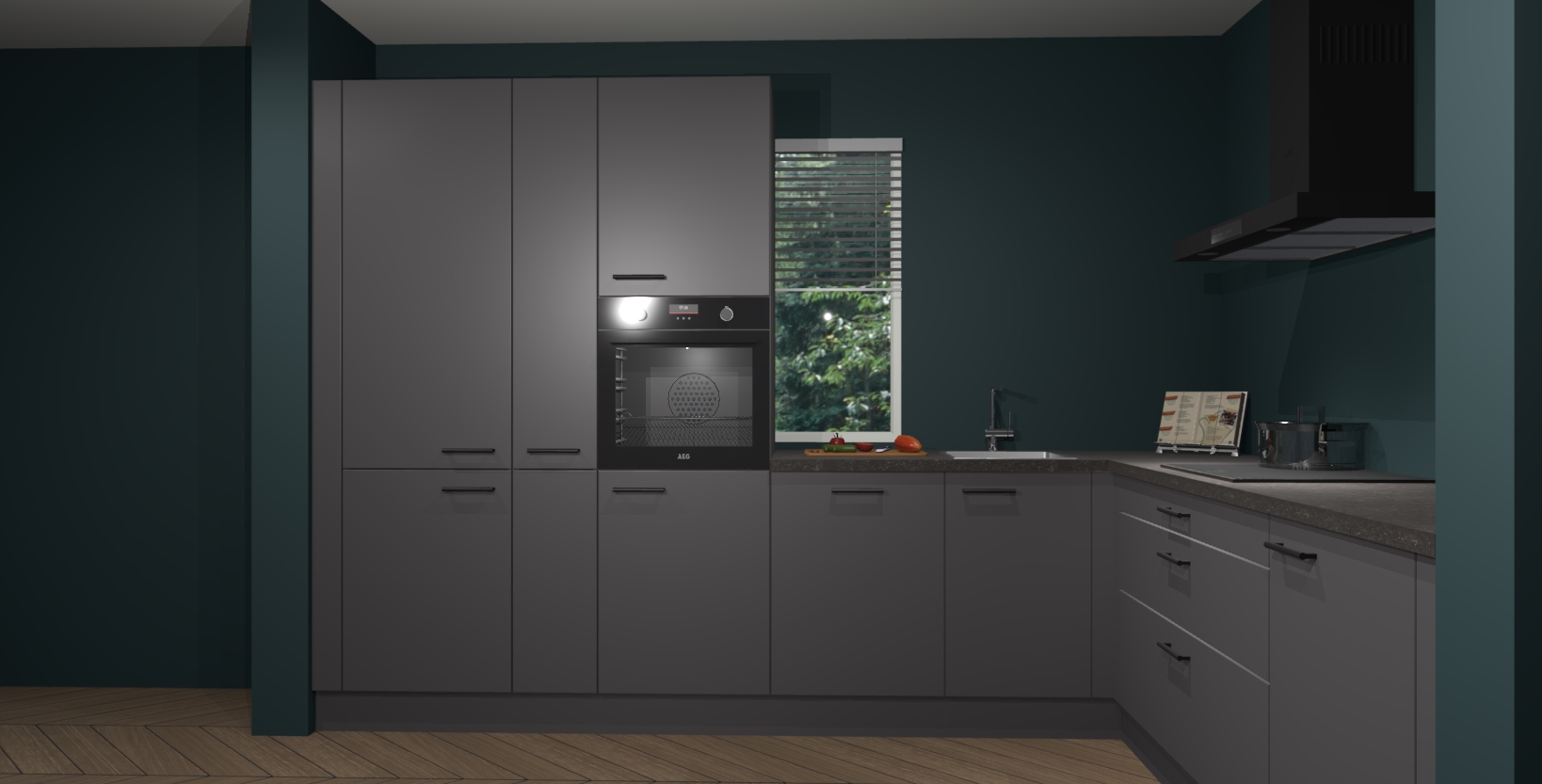 Met een modern, tijdloos design en ruime opslagruimte, zult u zich in no-time thuis voelen in uw nieuwe keuken. Uw leven wordt eenvoudiger met de soft-close deuren die voor het ultieme stille comfort zorgen - geen geluid dat u stoort terwijl u kookt. Ook is de keuken voorzien van 5 ingebouwde apparaten: een oven, inductie kookplaat, afzuigkap, vaatwasser en koelkast. Deze kunnen gemakkelijk na bestelling worden bijgewerkt naar AEG - waardoor uw luxe ervaring compleet is.