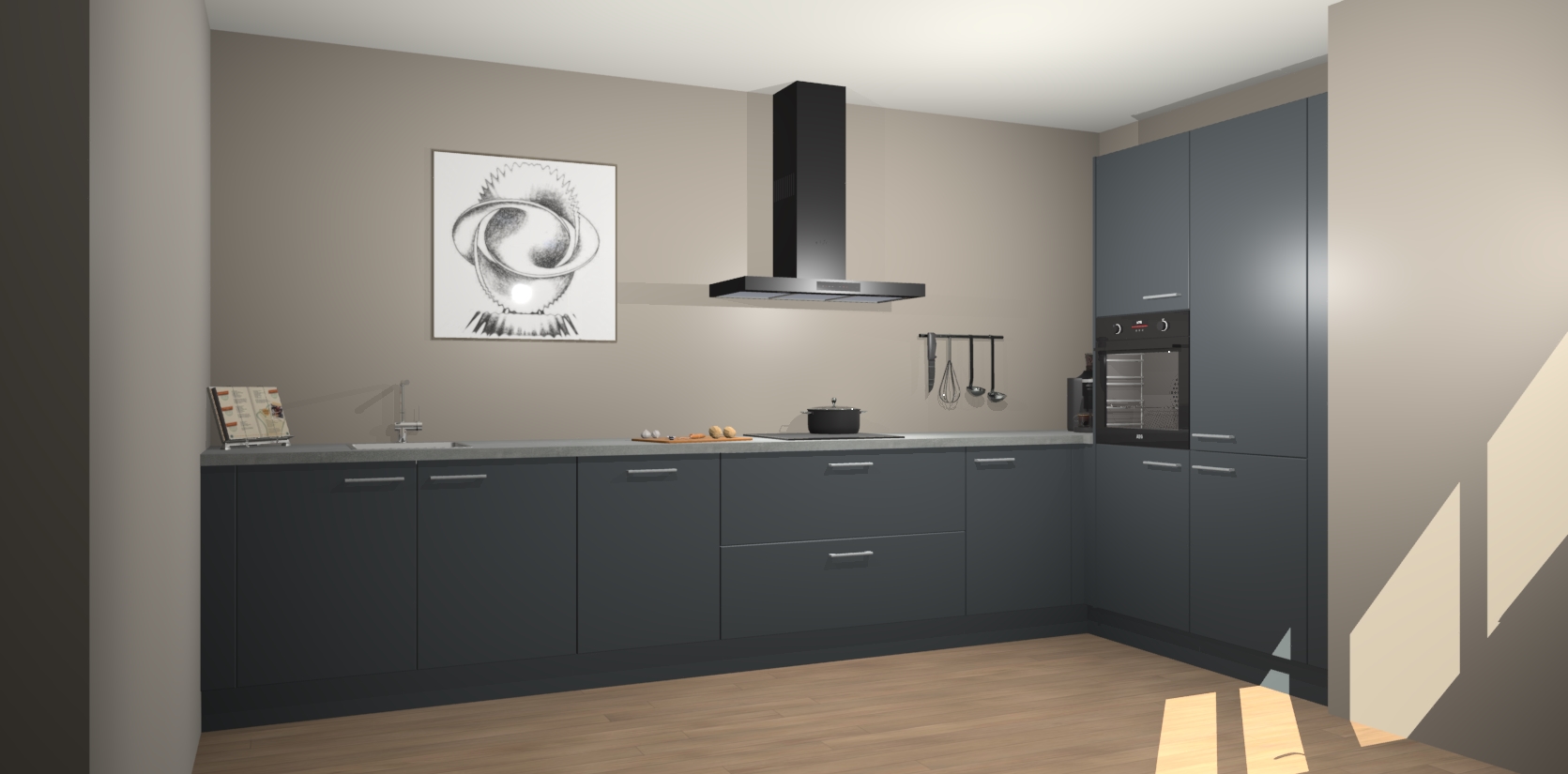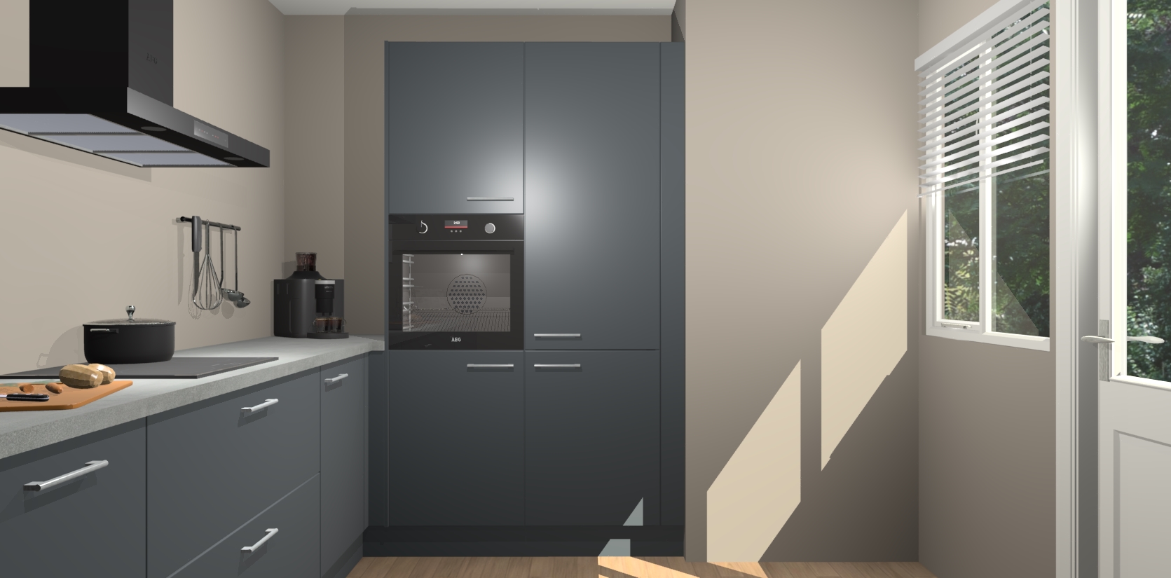 Welkom bij de Onyxgrijze keuken Khao Lak. Deze prachtige keuken zal de komende jaren het middelpunt van de belangstelling in uw huis zijn. Uitgerust met vijf inbouwapparaten komt u nooit kookgereedschap tekort. Bovendien geeft de warme houtlook elke ruimte een uitnodigende en tijdloze uitstraling.