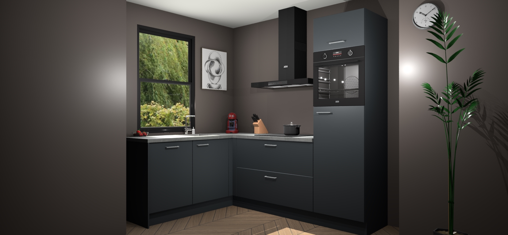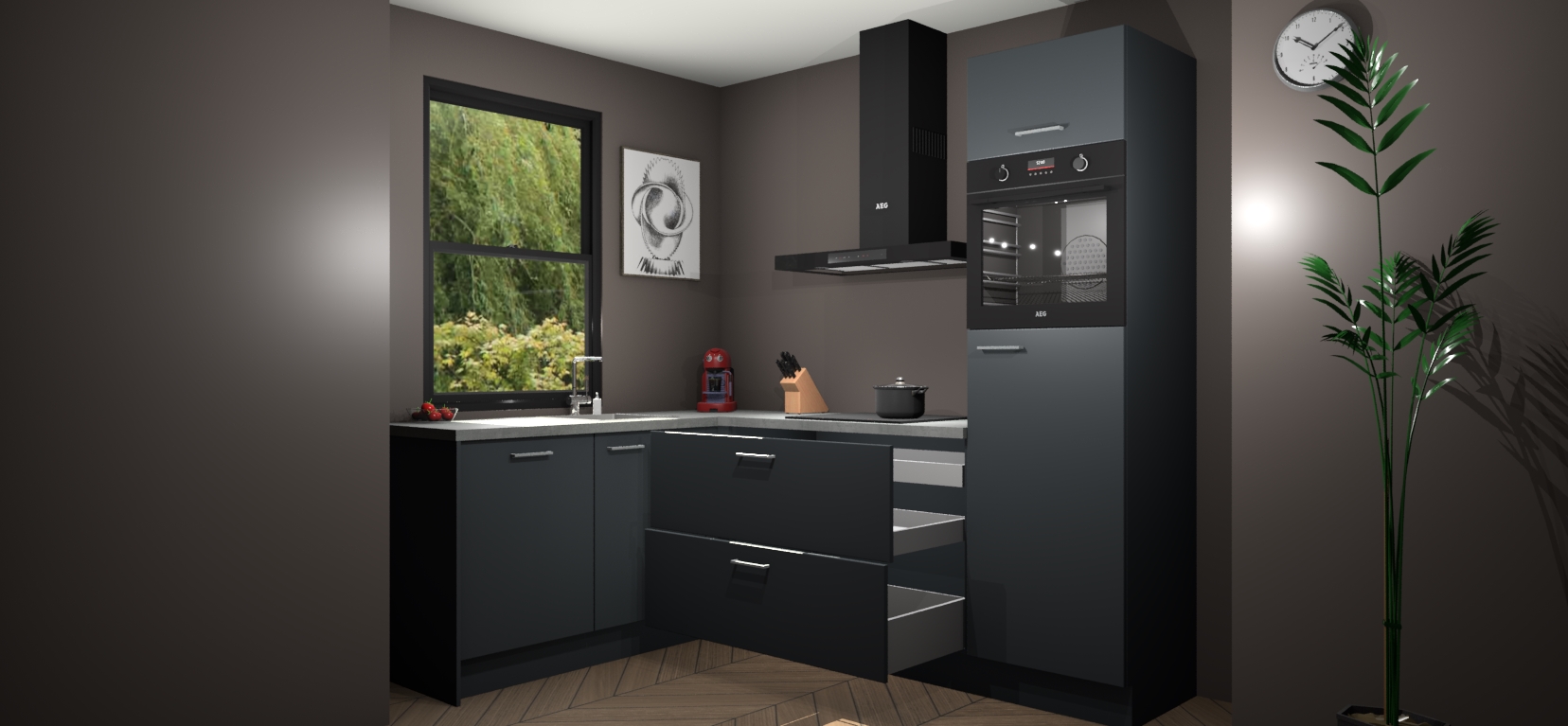 Deze prachtige hoekkeuken heeft alle benodigdheden om uw droomkook- en eetruimte compleet te maken. De Onyxgrijze kasten bieden een echo van raffinement, terwijl de 5 inbouwapparaten genoeg opties bieden voor het bereiden van heerlijke maaltijden. De oven, inductiekookplaat, afzuigkap, vaatwasser en koelkast zorgen ervoor dat u tijd in de keuken zo efficiënt mogelijk verloopt, terwijl ze ook dat extra vleugje luxe bieden.