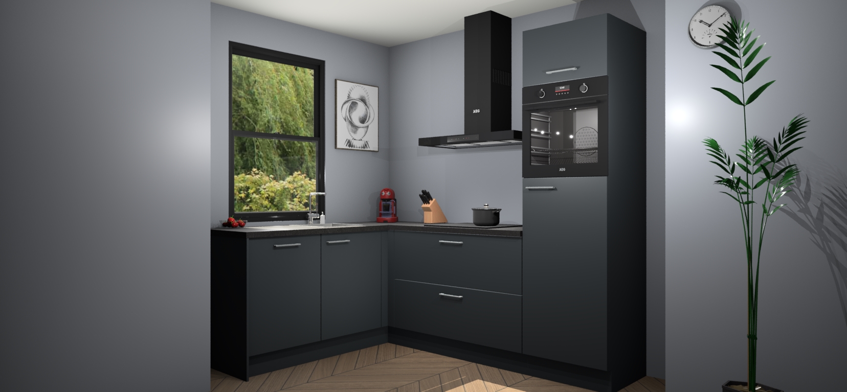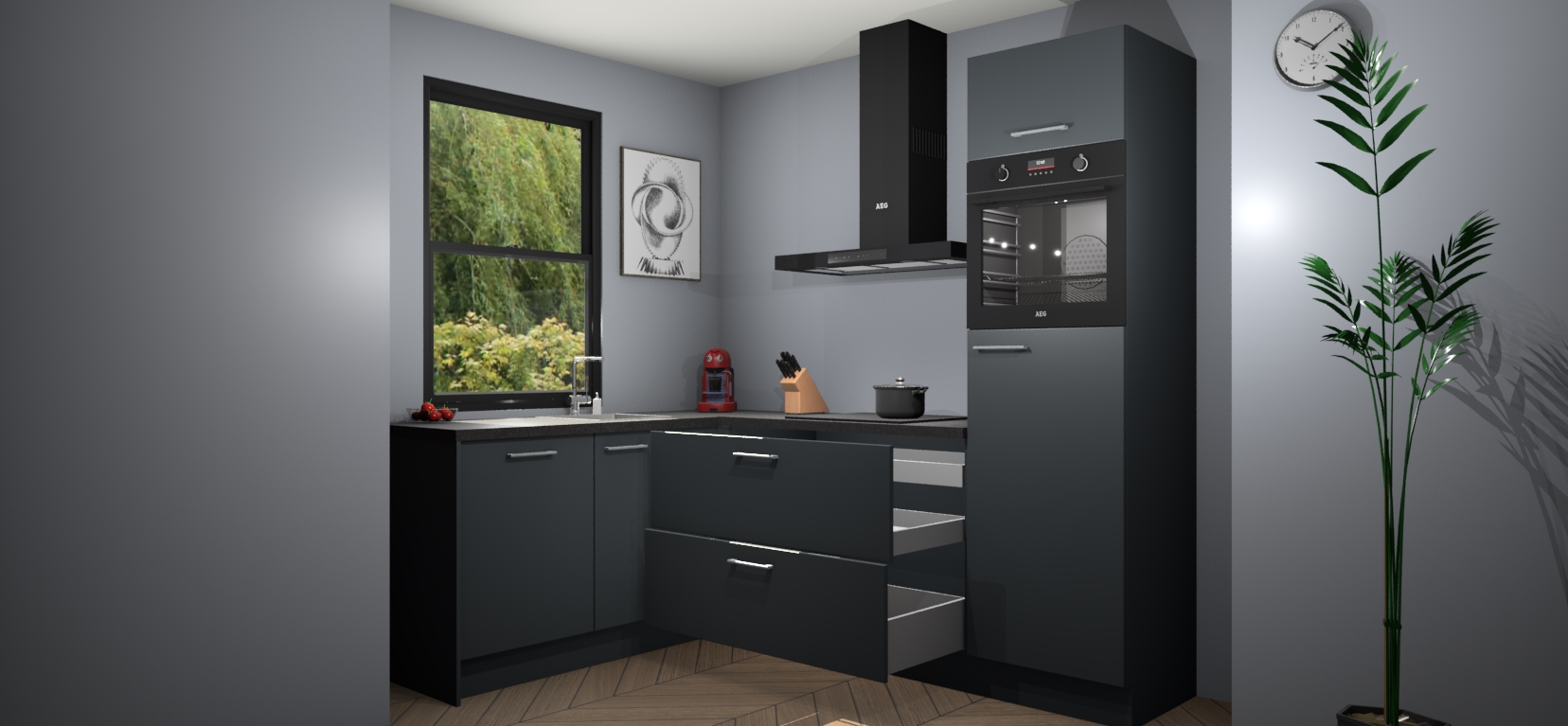 Deze prachtige hoekkeuken heeft alle benodigdheden om uw droomkook- en eetruimte compleet te maken. De Onyxgrijze kasten bieden een echo van raffinement, terwijl de 5 inbouwapparaten genoeg opties bieden voor het bereiden van heerlijke maaltijden. De oven, inductiekookplaat, afzuigkap, vaatwasser en koelkast zorgen ervoor dat u tijd in de keuken zo efficiënt mogelijk verloopt, terwijl ze ook dat extra vleugje luxe bieden.