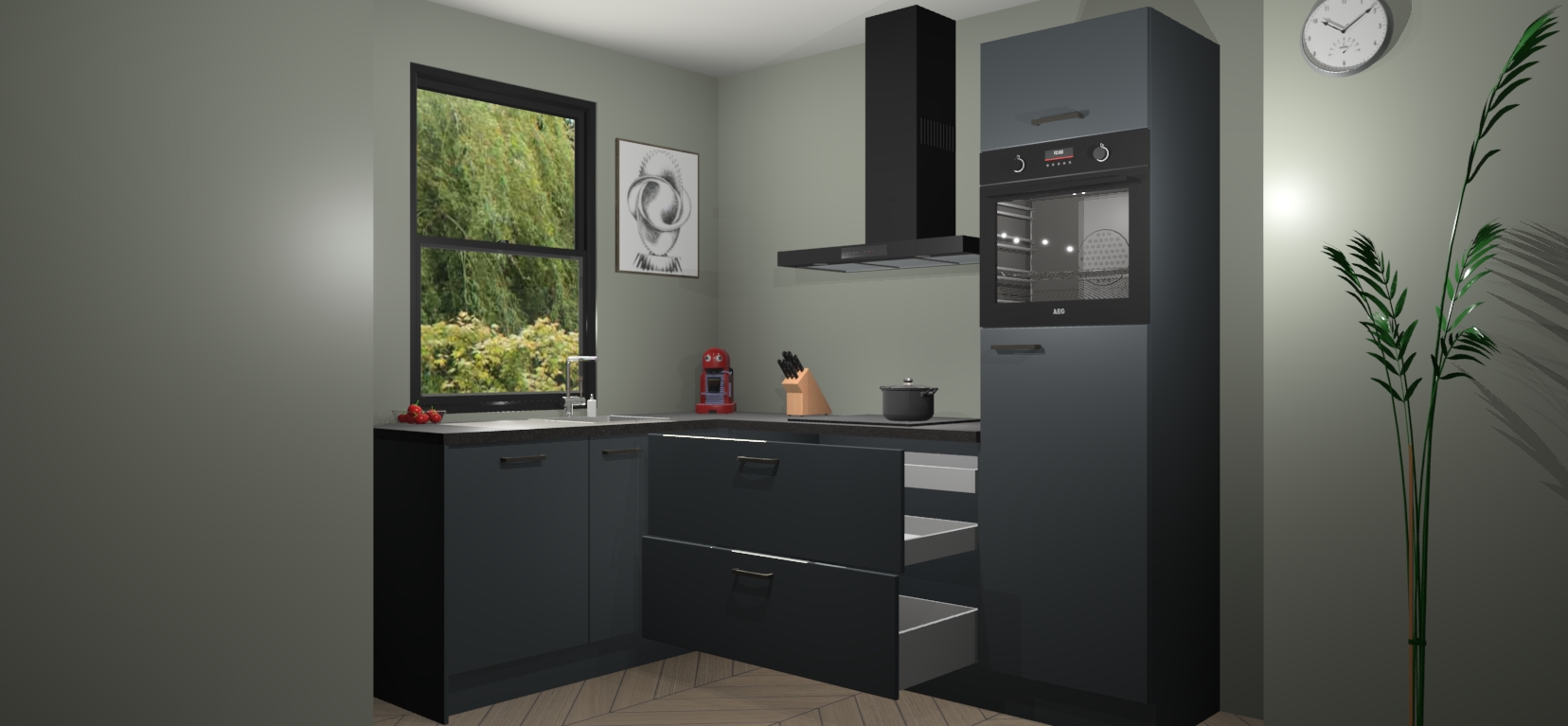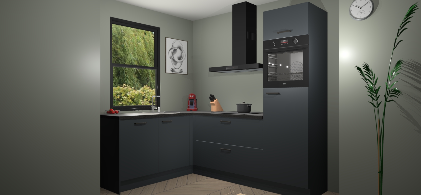 Deze prachtige hoekkeuken heeft alle benodigdheden om uw droomkook- en eetruimte compleet te maken. De Onyxgrijze kasten bieden een echo van raffinement, terwijl de 5 inbouwapparaten genoeg opties bieden voor het bereiden van heerlijke maaltijden. De oven, inductiekookplaat, afzuigkap, vaatwasser en koelkast zorgen ervoor dat u tijd in de keuken zo efficiënt mogelijk verloopt, terwijl ze ook dat extra vleugje luxe bieden.
