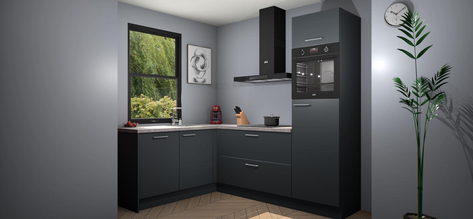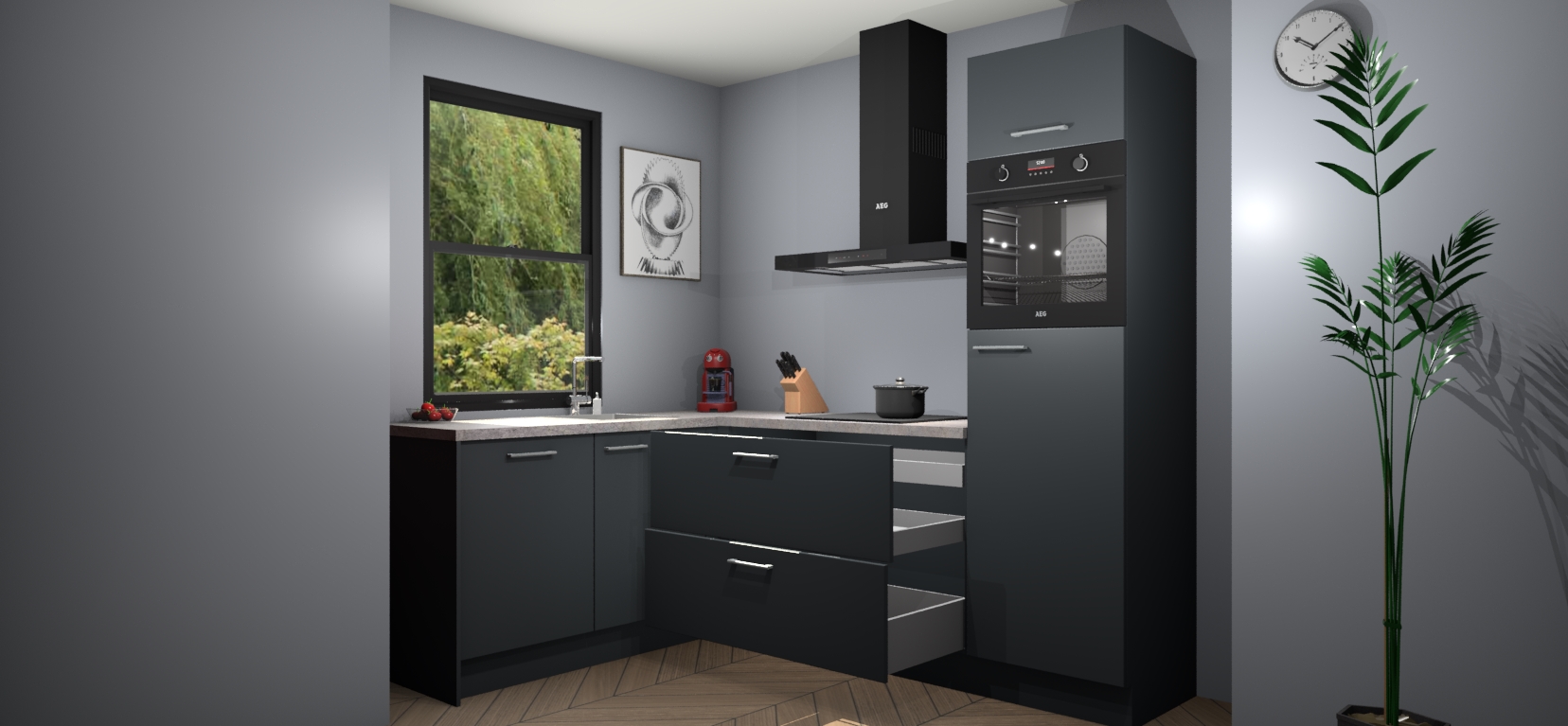 Deze prachtige hoekkeuken heeft alle benodigdheden om uw droomkook- en eetruimte compleet te maken. De Onyxgrijze kasten bieden een echo van raffinement, terwijl de 5 inbouwapparaten genoeg opties bieden voor het bereiden van heerlijke maaltijden. De oven, inductiekookplaat, afzuigkap, vaatwasser en koelkast zorgen ervoor dat u tijd in de keuken zo efficiënt mogelijk verloopt, terwijl ze ook dat extra vleugje luxe bieden.