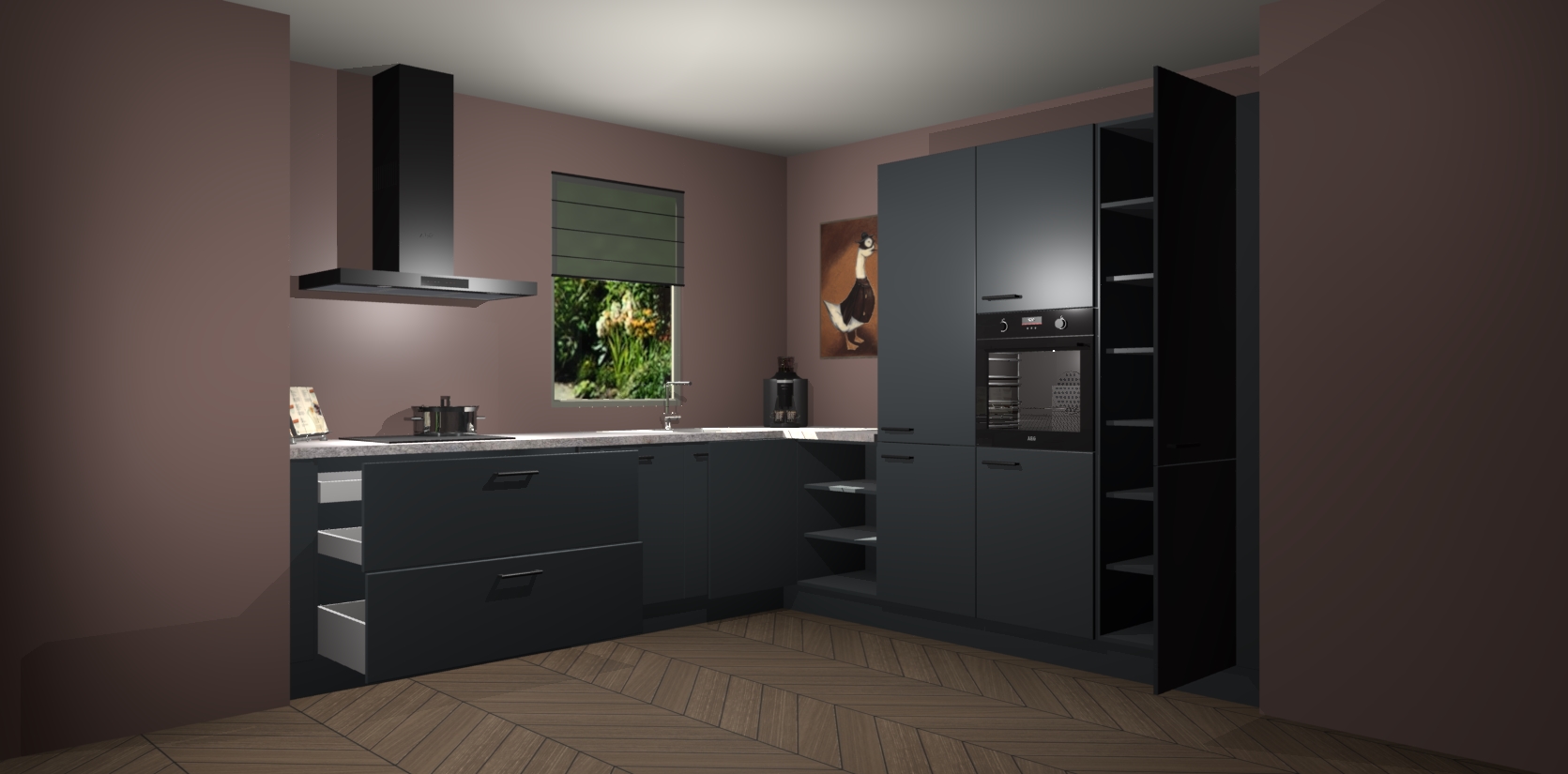 Welkom bij de onyxgrijze keuken Laos. Deze prachtige keuken zal de komende jaren het middelpunt van de belangstelling in uw huis zijn. Uitgerust met vijf inbouwapparaten komt u nooit kookgereedschap tekort. Bovendien geeft de warme houtlook elke ruimte een uitnodigende en tijdloze uitstraling.