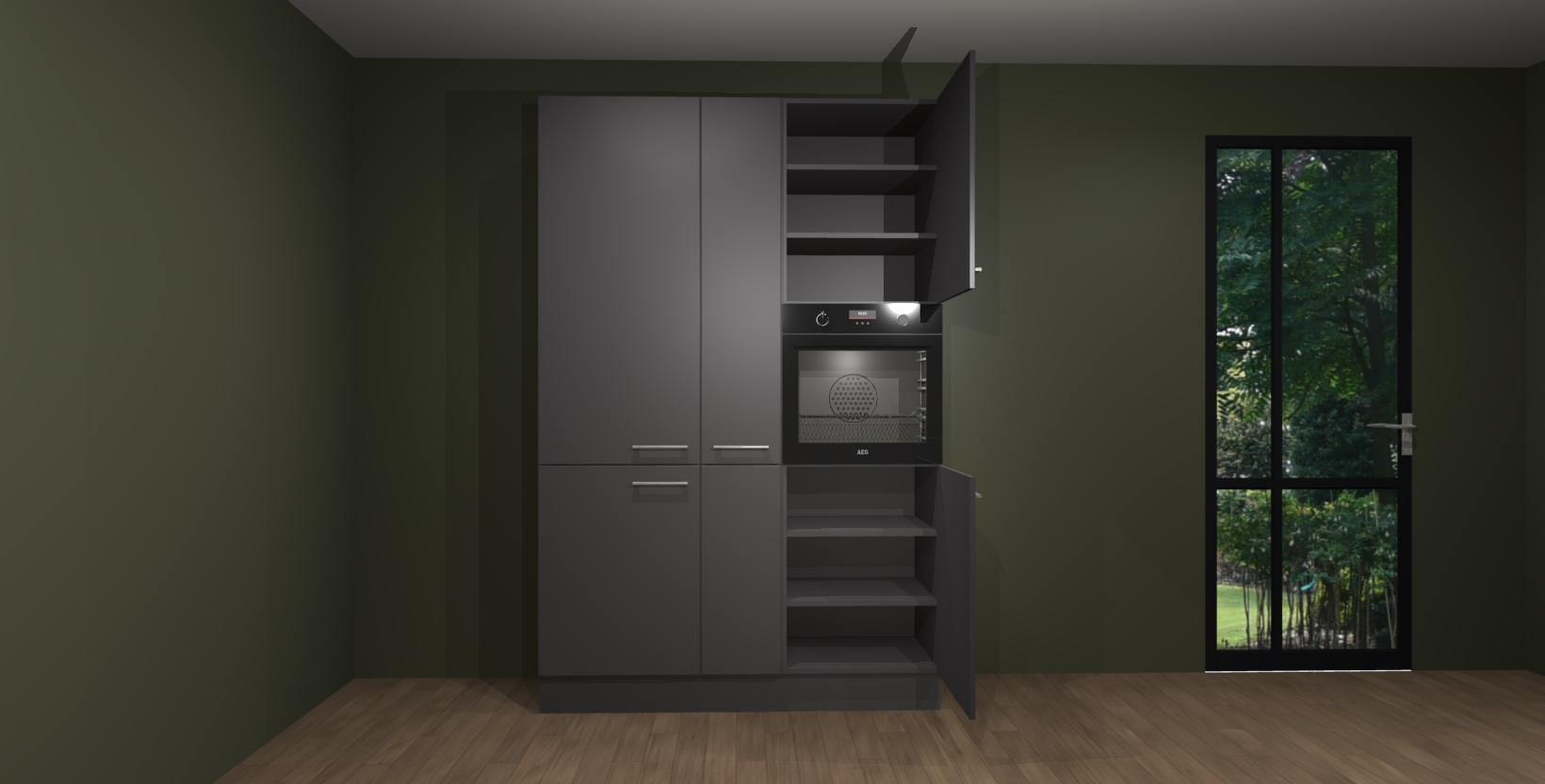 Met een modern, tijdloos design en ruime opslagruimte, zult u zich in no-time thuis voelen in uw nieuwe keuken. Uw leven wordt eenvoudiger met de soft-close deuren die voor het ultieme stille comfort zorgen - geen geluid dat u stoort terwijl u kookt. Ook is de keuken voorzien van 5 ingebouwde apparaten: een oven, inductie kookplaat, afzuigkap, vaatwasser en koelkast. Deze kunnen gemakkelijk na bestelling worden bijgewerkt naar AEG - waardoor uw luxe ervaring compleet is.