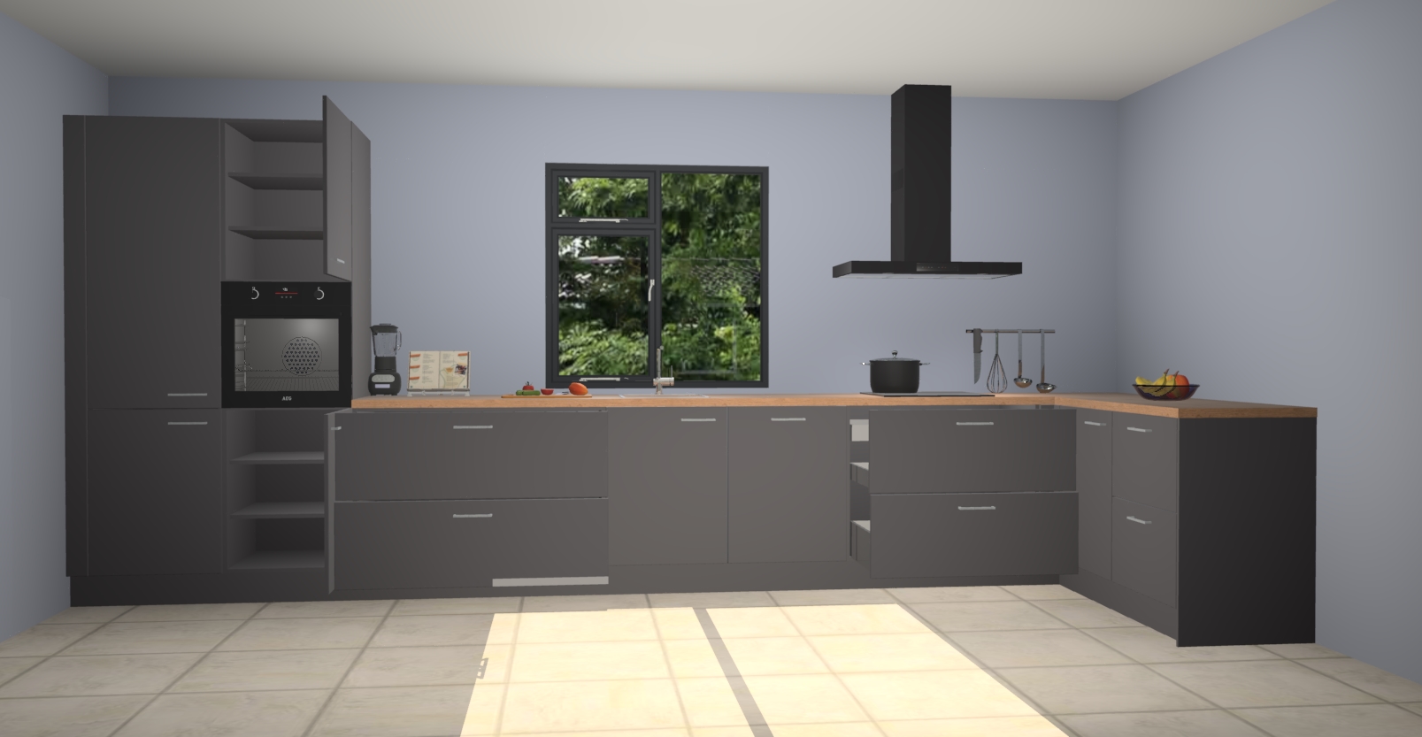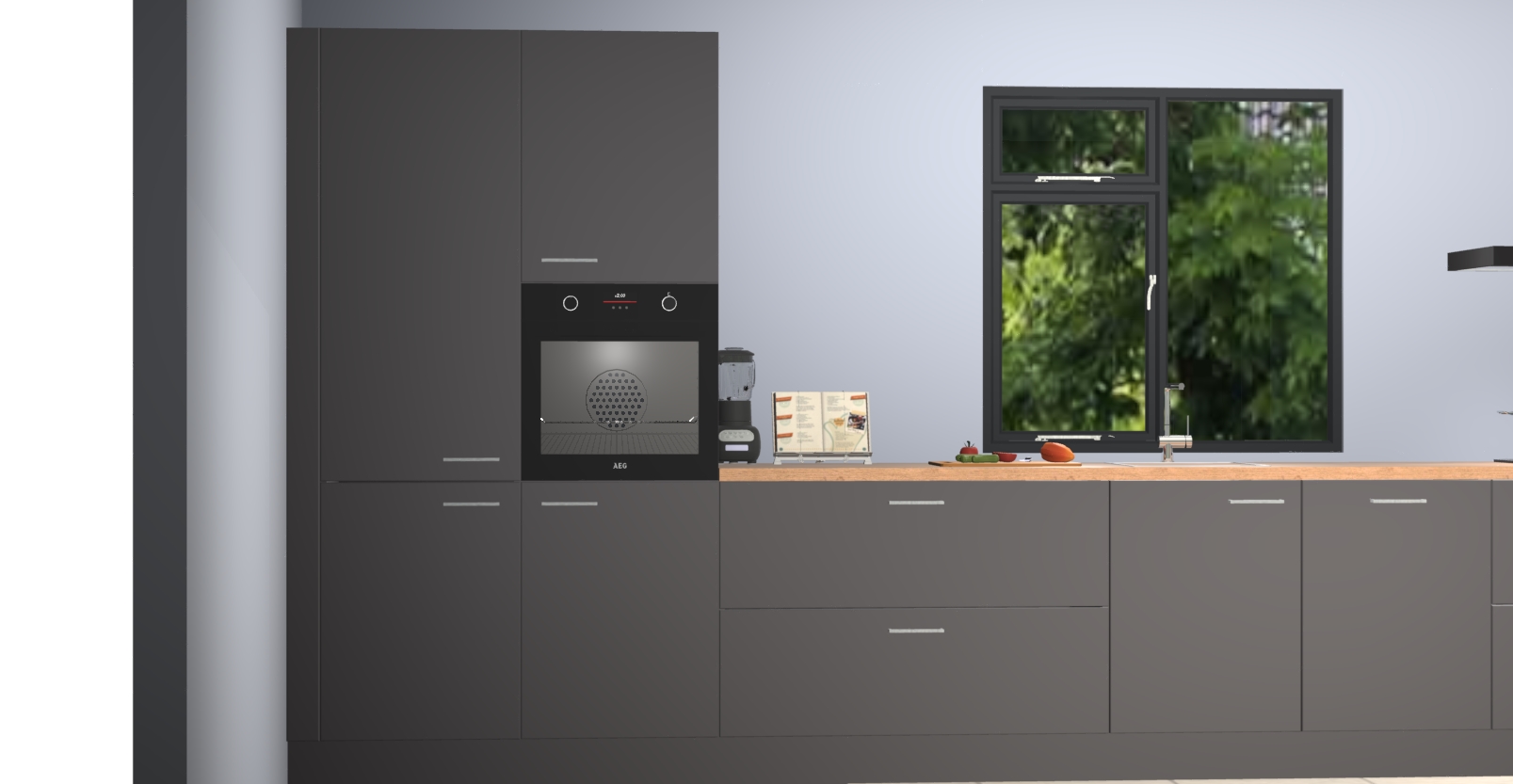 De Onyxgrijze keuken Lille wordt geleverd met vijf inbouwapparaten - een oven, inductiekookplaat, afzuigkap, vaatwasser en koelkast. Maar dat is nog niet alles! Na bestelling kunnen deze apparaten eenvoudig worden geüpgraded naar premium AEG-apparatuur. Bovendien is er zelfs de optie om de oven te vervangen door een combimagnetron of uw inductiekookplaat te vervangen door een kookplaat met geïntegreerde afzuiging.