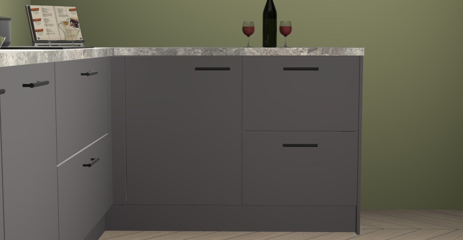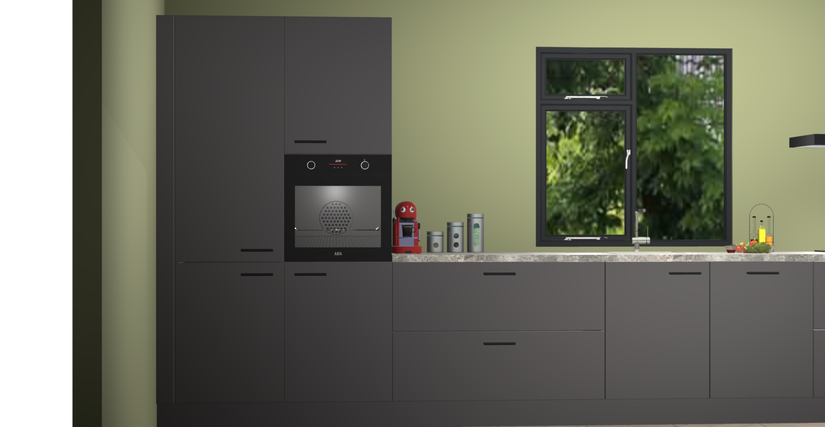 De Onyxgrijze keuken Lille wordt geleverd met vijf inbouwapparaten - een oven, inductiekookplaat, afzuigkap, vaatwasser en koelkast. Maar dat is nog niet alles! Na bestelling kunnen deze apparaten eenvoudig worden geüpgraded naar premium AEG-apparatuur. Bovendien is er zelfs de optie om de oven te vervangen door een combimagnetron of uw inductiekookplaat te vervangen door een kookplaat met geïntegreerde afzuiging.