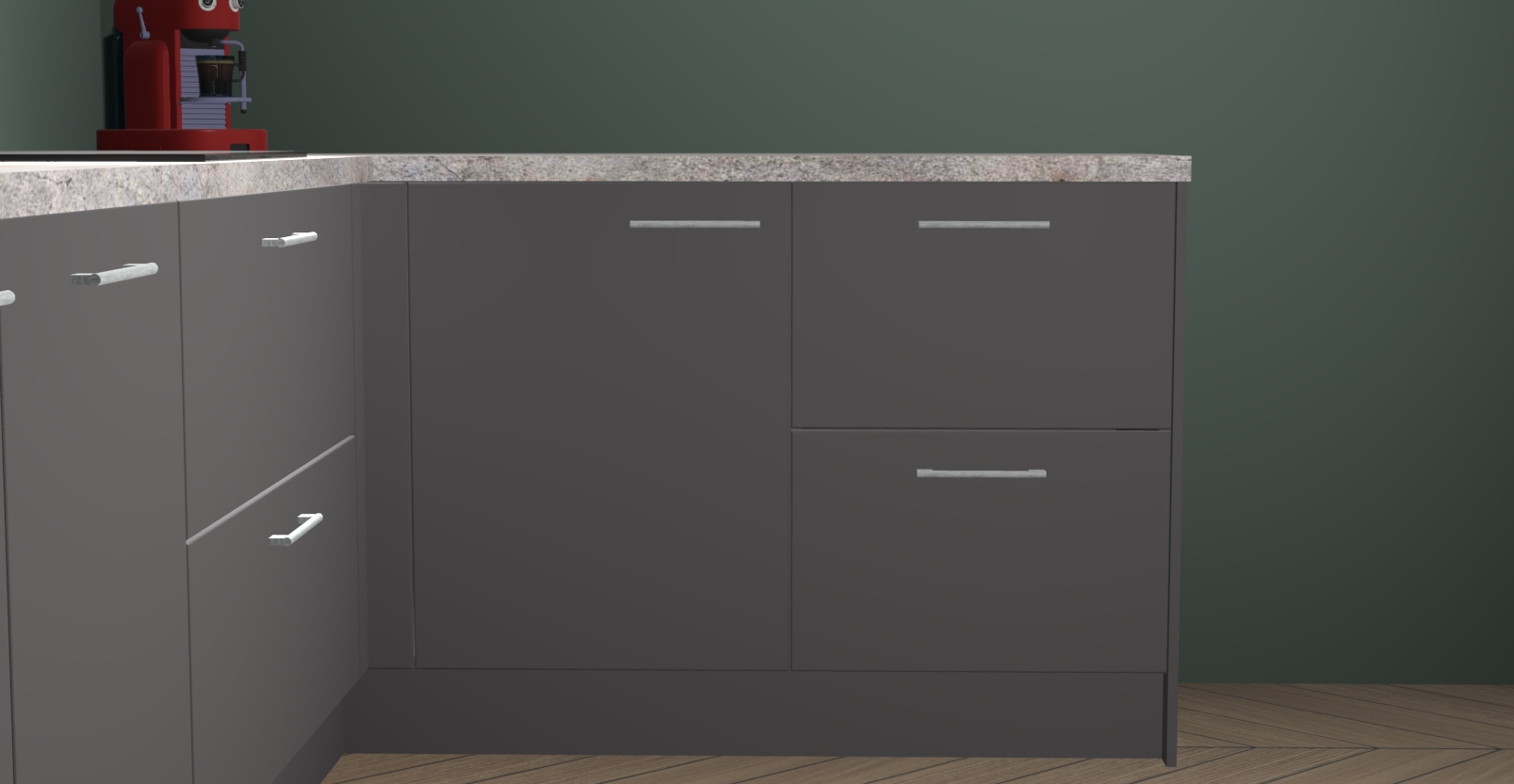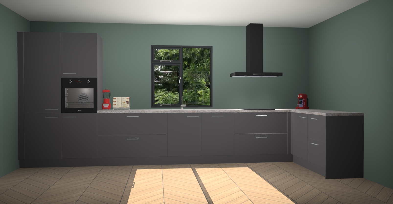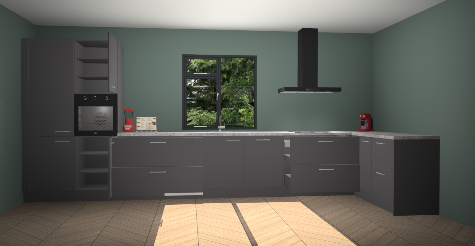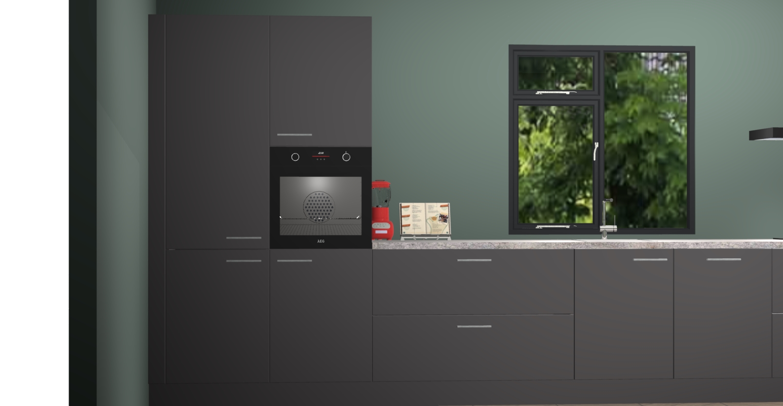 De Onyxgrijze keuken Lille wordt geleverd met vijf inbouwapparaten - een oven, inductiekookplaat, afzuigkap, vaatwasser en koelkast. Maar dat is nog niet alles! Na bestelling kunnen deze apparaten eenvoudig worden geüpgraded naar premium AEG-apparatuur. Bovendien is er zelfs de optie om de oven te vervangen door een combimagnetron of uw inductiekookplaat te vervangen door een kookplaat met geïntegreerde afzuiging.