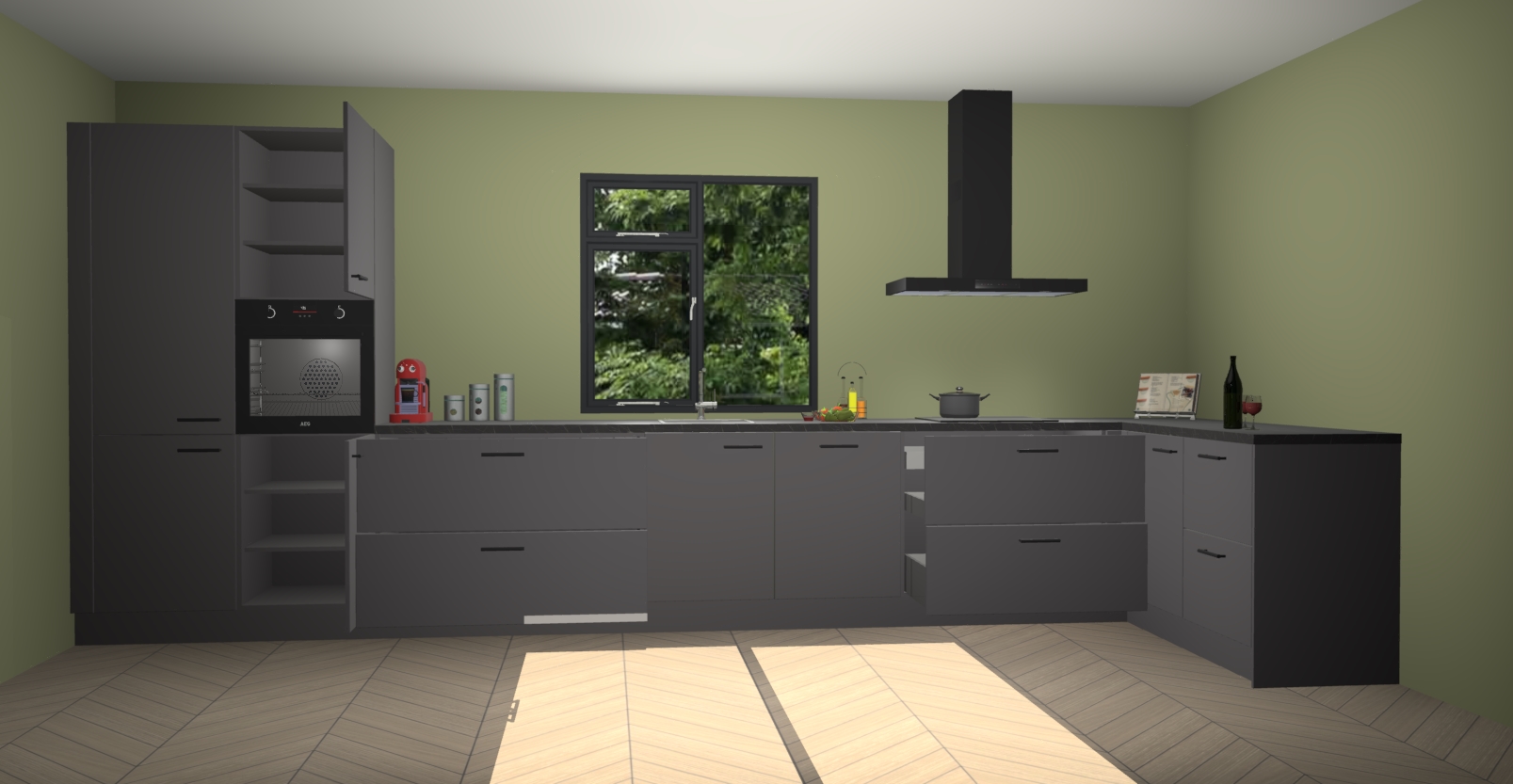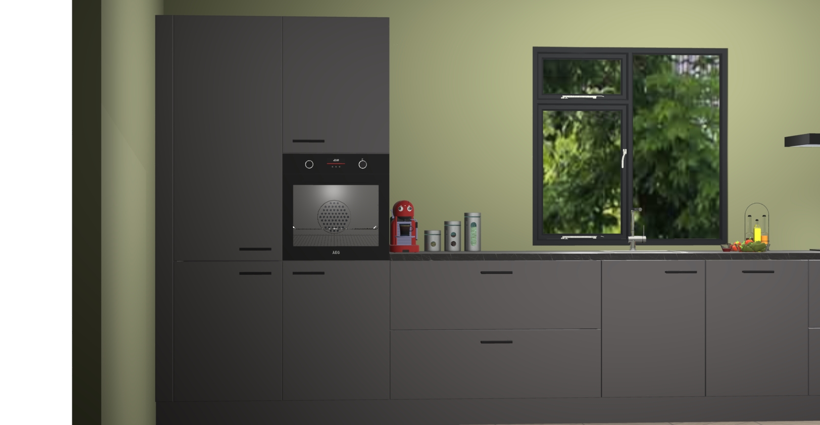 De Onyxgrijze keuken Lille wordt geleverd met vijf inbouwapparaten - een oven, inductiekookplaat, afzuigkap, vaatwasser en koelkast. Maar dat is nog niet alles! Na bestelling kunnen deze apparaten eenvoudig worden geüpgraded naar premium AEG-apparatuur. Bovendien is er zelfs de optie om de oven te vervangen door een combimagnetron of uw inductiekookplaat te vervangen door een kookplaat met geïntegreerde afzuiging.