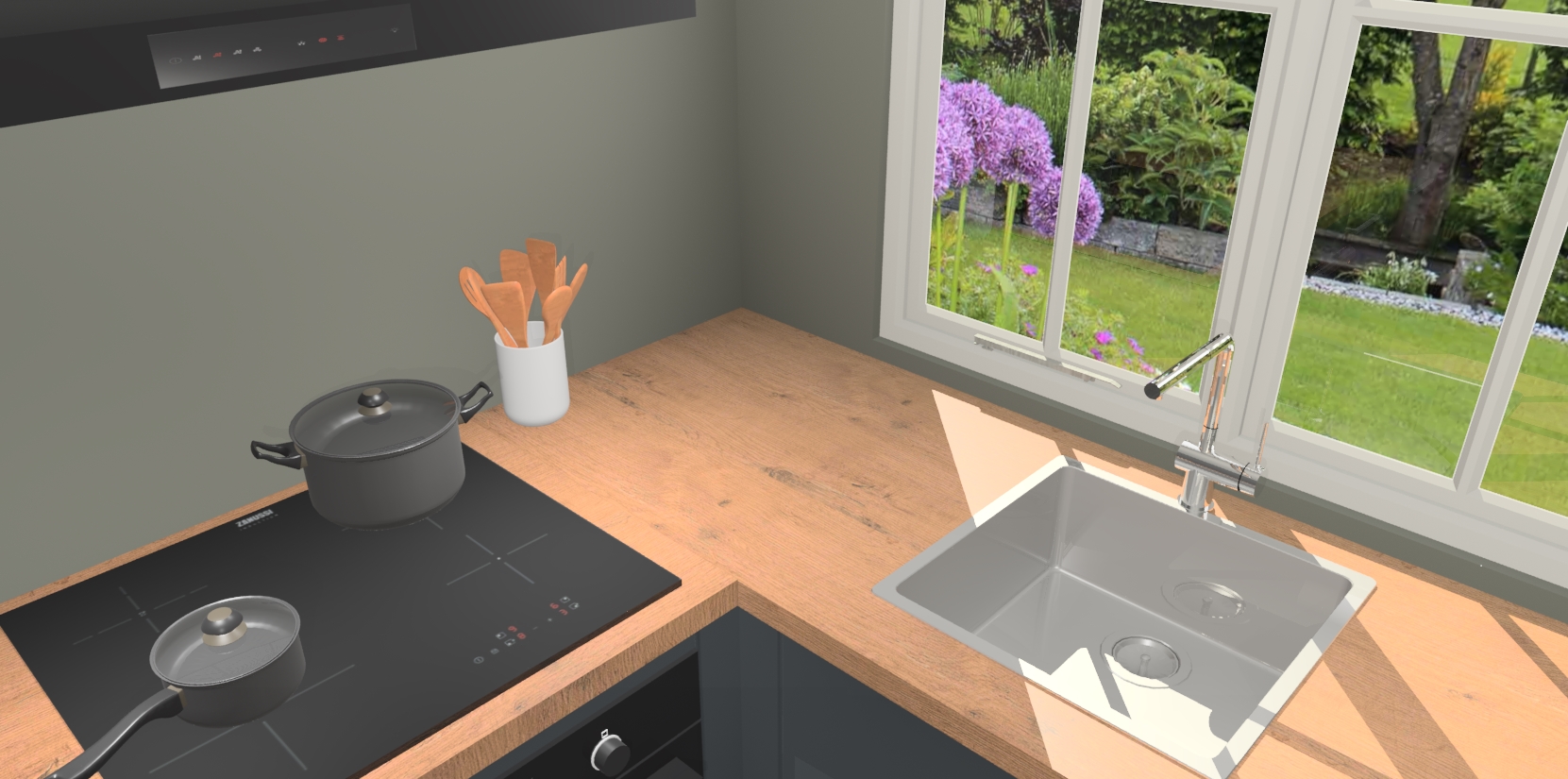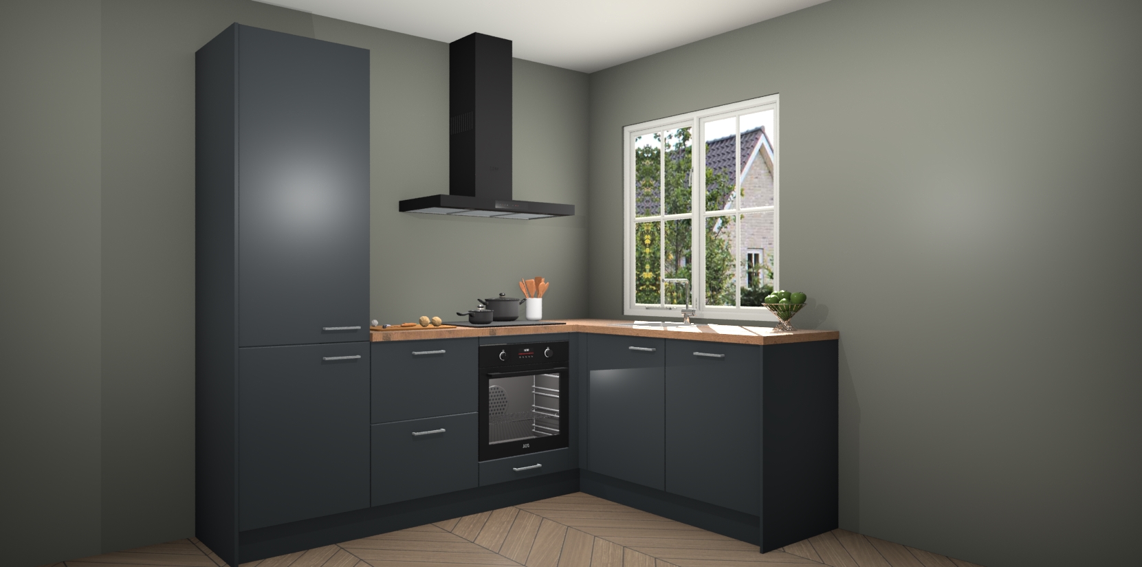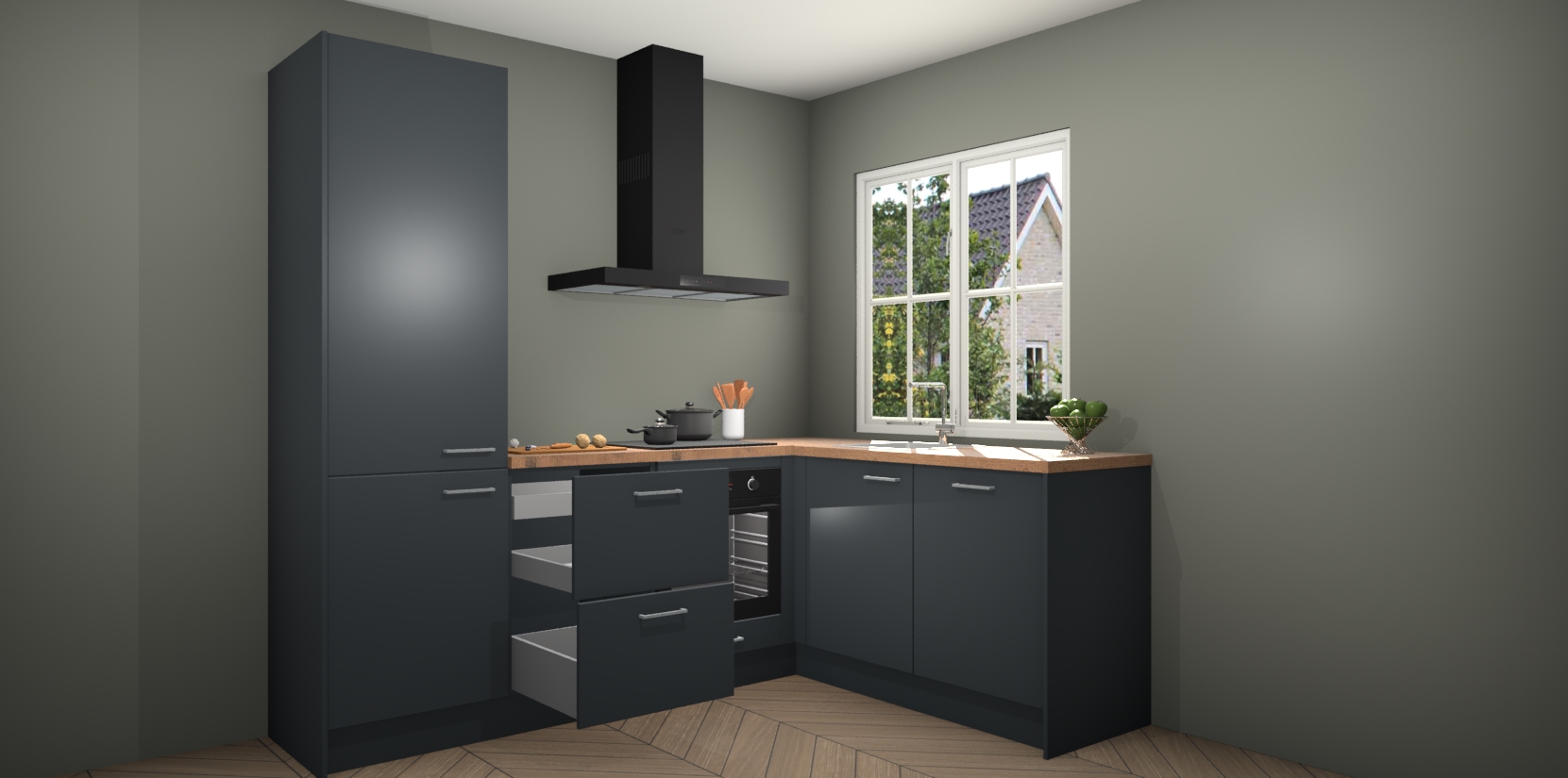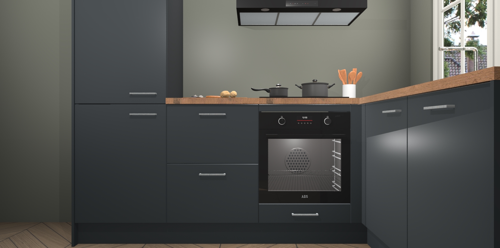 De Onyxgrijze keuken Linz is de perfecte keuze voor uw nieuwe moderne en tijdloze keuken. Ga voor moderne en tijdloze elegantie in uw keuken. De prachtige hoekkeuken biedt een verfrissende kijk op de manier waarop we ons vertrouwde keukenontwerp kunnen aanpassen in een nieuwe stijl. Één blik om alles te zien: zo mooi dat het bijna magisch lijkt.