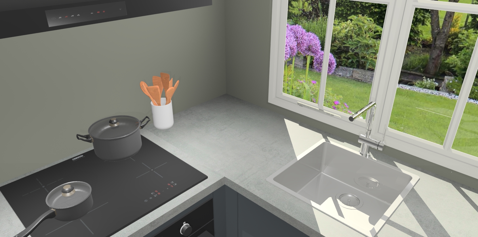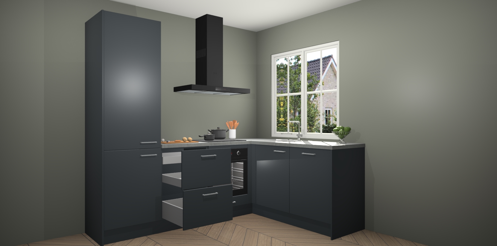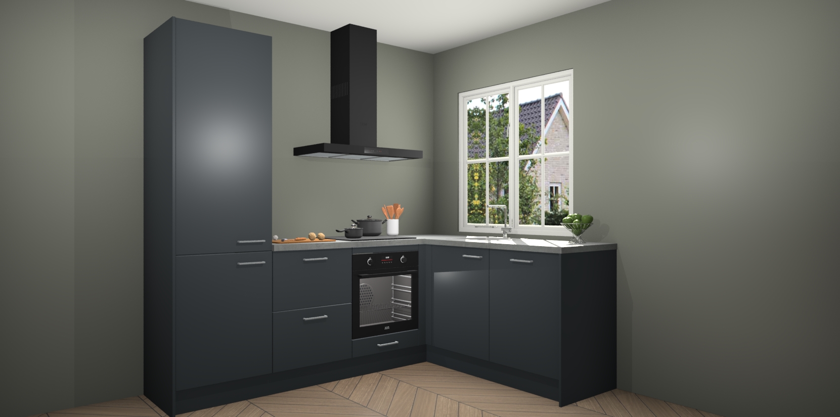 De Onyxgrijze keuken Linz is de perfecte keuze voor uw nieuwe moderne en tijdloze keuken. Ga voor moderne en tijdloze elegantie in uw keuken. De prachtige hoekkeuken biedt een verfrissende kijk op de manier waarop we ons vertrouwde keukenontwerp kunnen aanpassen in een nieuwe stijl. Één blik om alles te zien: zo mooi dat het bijna magisch lijkt.