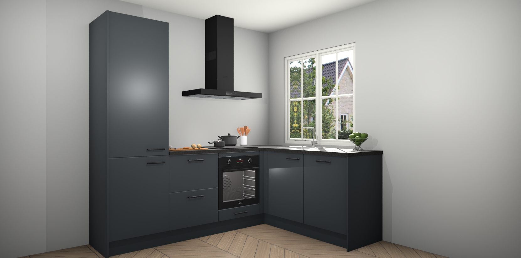 De Onyxgrijze keuken Linz is de perfecte keuze voor uw nieuwe moderne en tijdloze keuken. Ga voor moderne en tijdloze elegantie in uw keuken. De prachtige hoekkeuken biedt een verfrissende kijk op de manier waarop we ons vertrouwde keukenontwerp kunnen aanpassen in een nieuwe stijl. Één blik om alles te zien: zo mooi dat het bijna magisch lijkt.