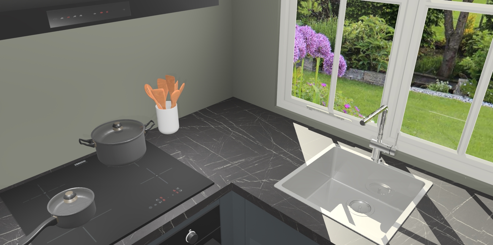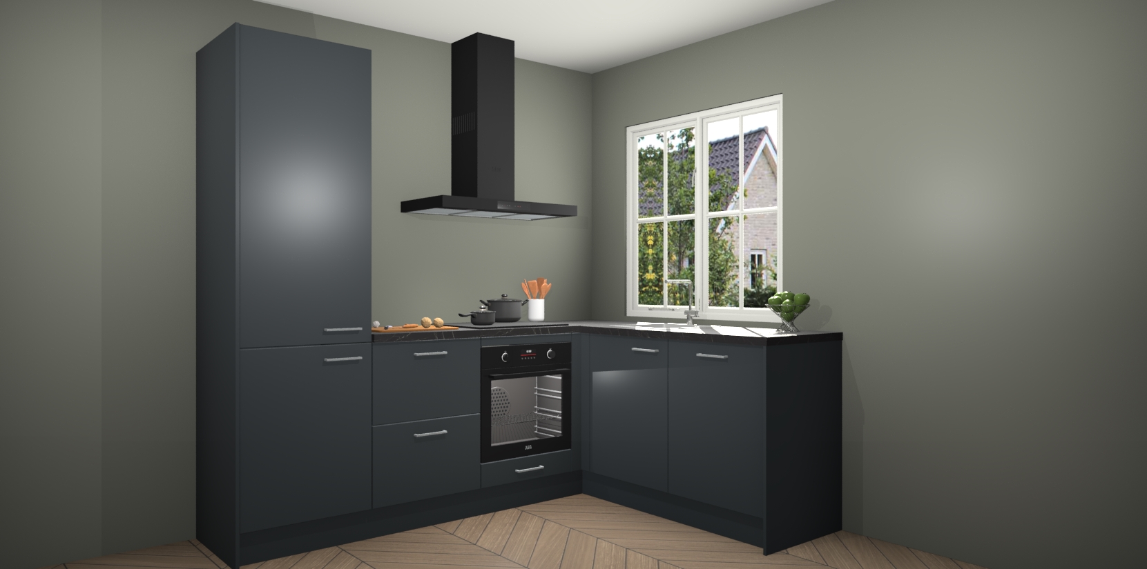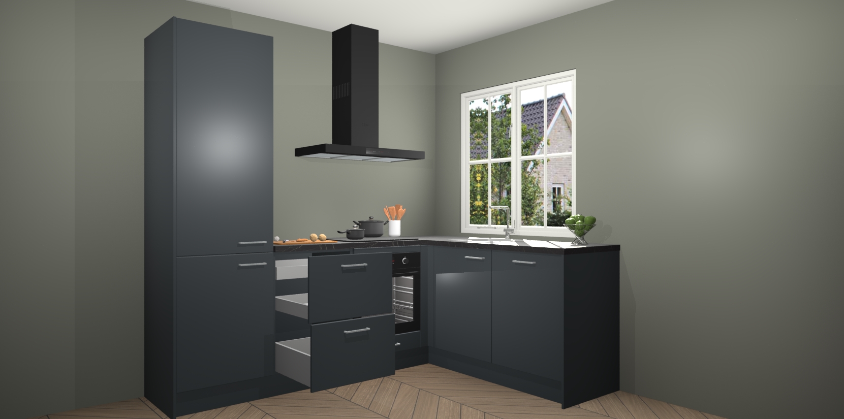 De Onyxgrijze keuken Linz is de perfecte keuze voor uw nieuwe moderne en tijdloze keuken. Ga voor moderne en tijdloze elegantie in uw keuken. De prachtige hoekkeuken biedt een verfrissende kijk op de manier waarop we ons vertrouwde keukenontwerp kunnen aanpassen in een nieuwe stijl. Één blik om alles te zien: zo mooi dat het bijna magisch lijkt.