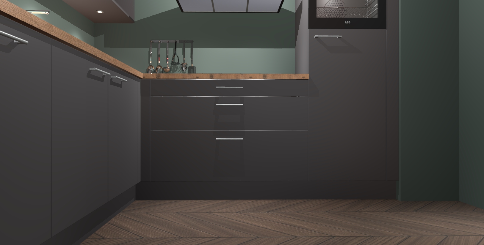 Met een modern, tijdloos design en ruime opslagruimte, zult u zich in no-time thuis voelen in uw nieuwe keuken. Uw leven wordt eenvoudiger met de soft-close deuren die voor het ultieme stille comfort zorgen - geen geluid dat u stoort terwijl u kookt. Ook is de keuken voorzien van 5 ingebouwde apparaten: een oven, inductie kookplaat, afzuigkap, vaatwasser en koelkast. Deze kunnen gemakkelijk na bestelling worden bijgewerkt naar AEG - waardoor uw luxe ervaring compleet is.