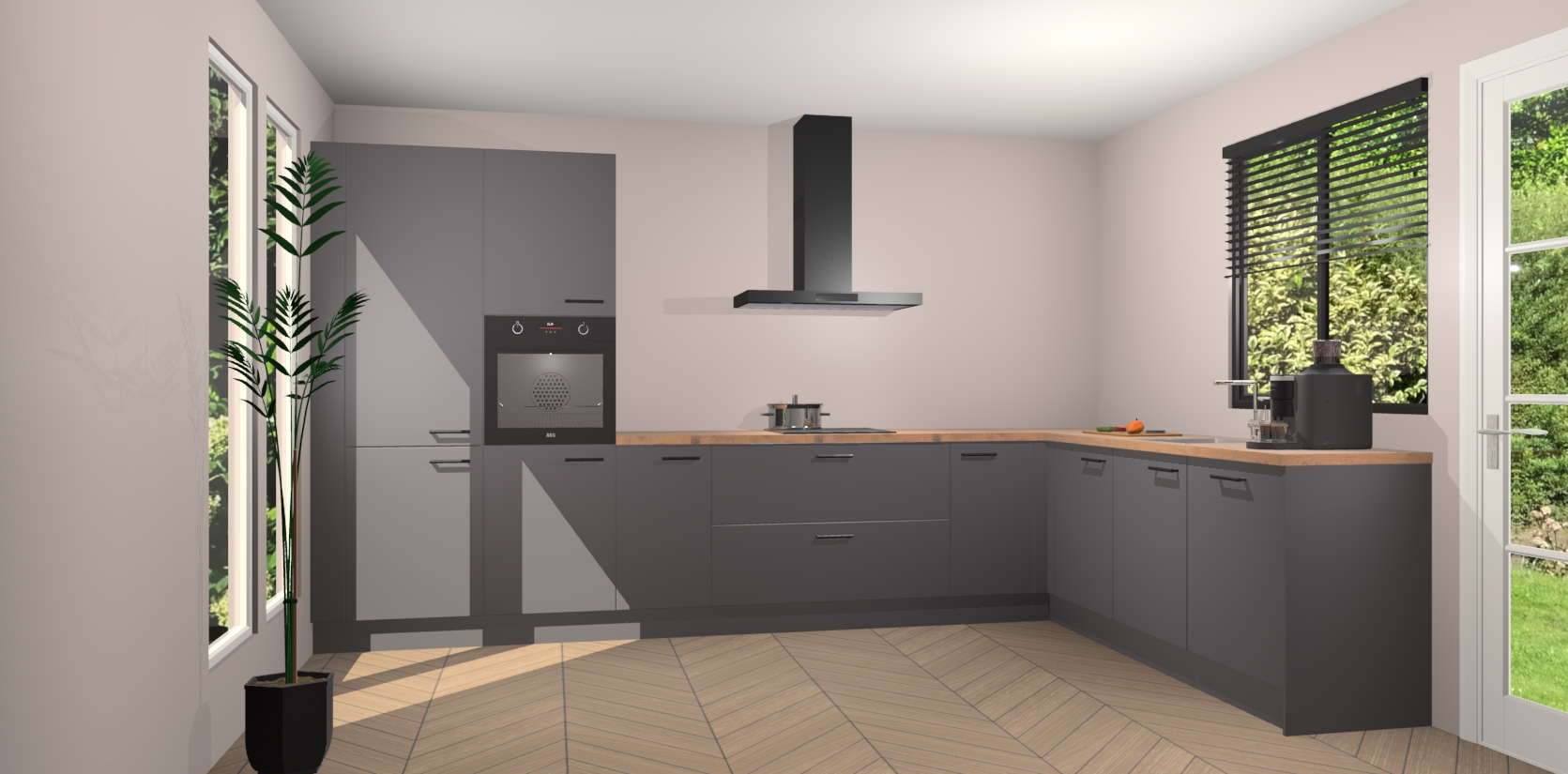 Met een modern, tijdloos design en ruime opslagruimte, zult u zich in no-time thuis voelen in uw nieuwe keuken. Uw leven wordt eenvoudiger met de soft-close deuren die voor het ultieme stille comfort zorgen - geen geluid dat u stoort terwijl u kookt. Ook is de keuken voorzien van 5 ingebouwde apparaten: een oven, inductie kookplaat, afzuigkap, vaatwasser en koelkast. Deze kunnen gemakkelijk na bestelling worden bijgewerkt naar AEG - waardoor uw luxe ervaring compleet is.