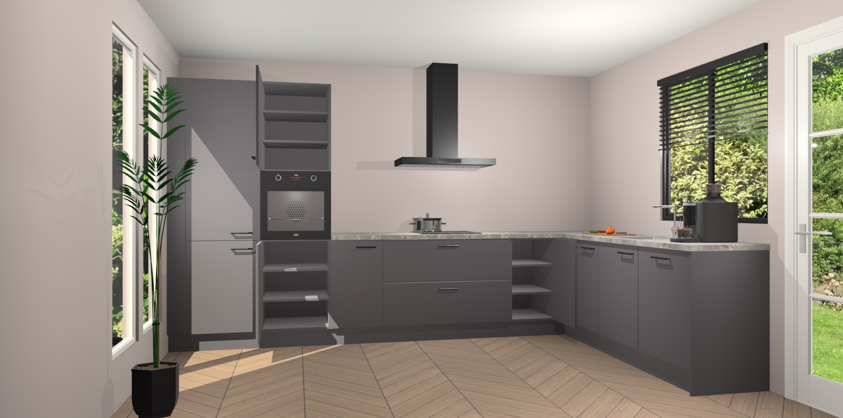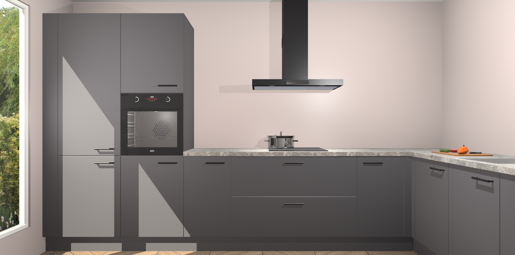 Met een modern, tijdloos design en ruime opslagruimte, zult u zich in no-time thuis voelen in uw nieuwe keuken. Uw leven wordt eenvoudiger met de soft-close deuren die voor het ultieme stille comfort zorgen - geen geluid dat u stoort terwijl u kookt. Ook is de keuken voorzien van 5 ingebouwde apparaten: een oven, inductie kookplaat, afzuigkap, vaatwasser en koelkast. Deze kunnen gemakkelijk na bestelling worden bijgewerkt naar AEG - waardoor uw luxe ervaring compleet is.