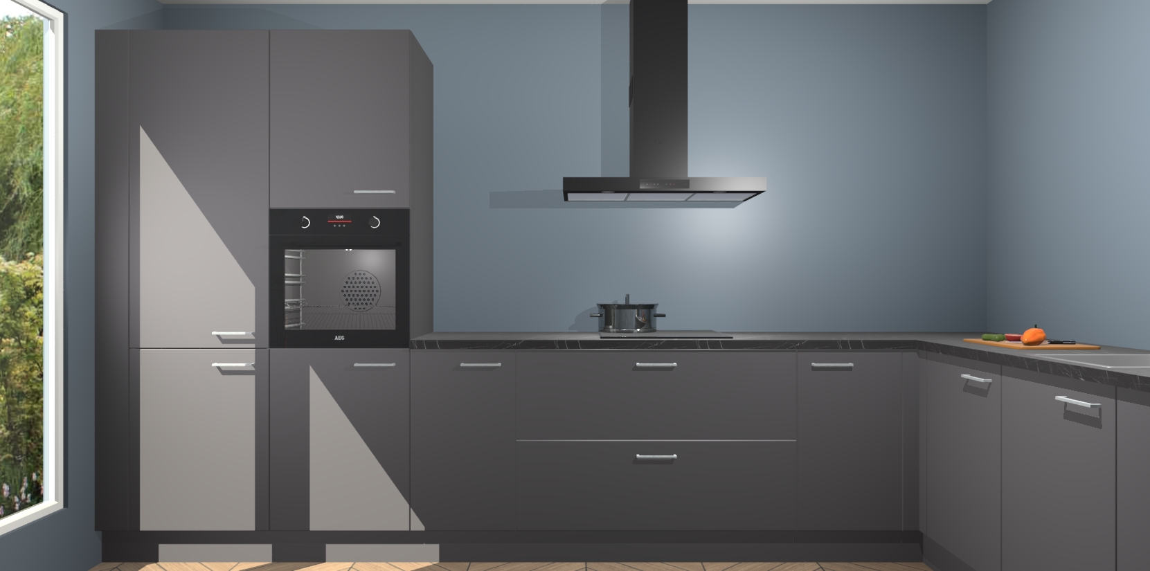 Met een modern, tijdloos design en ruime opslagruimte, zult u zich in no-time thuis voelen in uw nieuwe keuken. Uw leven wordt eenvoudiger met de soft-close deuren die voor het ultieme stille comfort zorgen - geen geluid dat u stoort terwijl u kookt. Ook is de keuken voorzien van 5 ingebouwde apparaten: een oven, inductie kookplaat, afzuigkap, vaatwasser en koelkast. Deze kunnen gemakkelijk na bestelling worden bijgewerkt naar AEG - waardoor uw luxe ervaring compleet is.