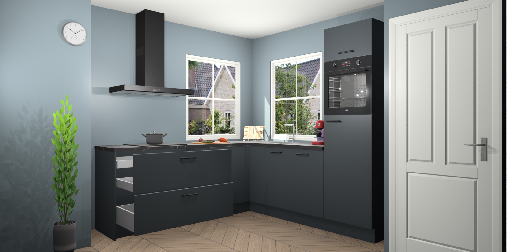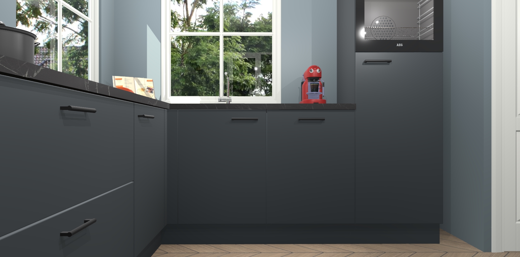 De Onyxgrijze keuken Pai bevat vijf essentiële inbouwapparaten - een oven, inductiekookplaat, afzuigkap, vaatwasser en koelkast - zodat u er na levering meteen in kunt. Voor de slimme kopers die weten dat apparaten vaak het verschil kunnen maken tussen functioneel en luxueus, bieden we eenvoudige upgradeopties naar AEG, van oven naar combimagnetron na bestelling of naar een kookplaat met geïntrigeerde afzuiging. En met onze vaste lage prijs en snelle levering binnen zeven weken vanaf de orderbevestiging hoeft u zich geen zorgen te maken over verborgen kosten of lange levertijden die uw droomkeuken kunnen vertragen.