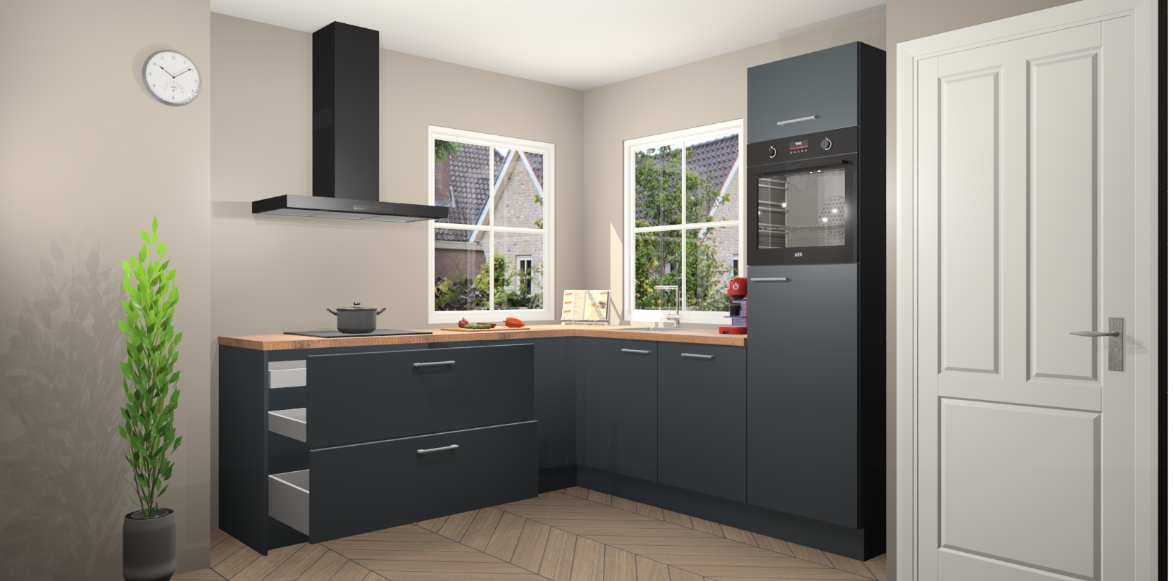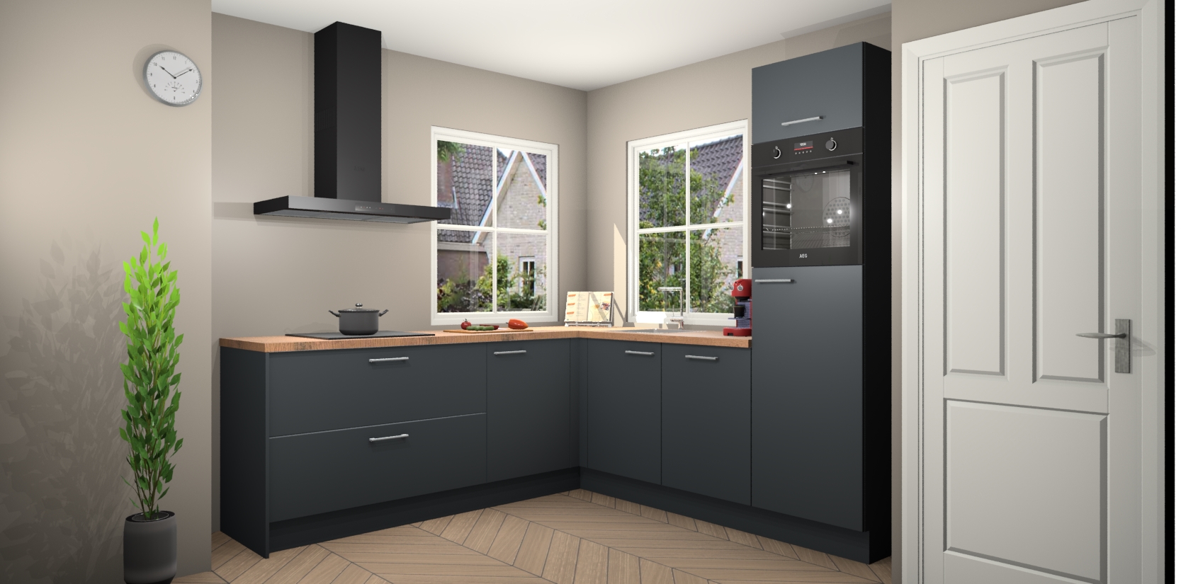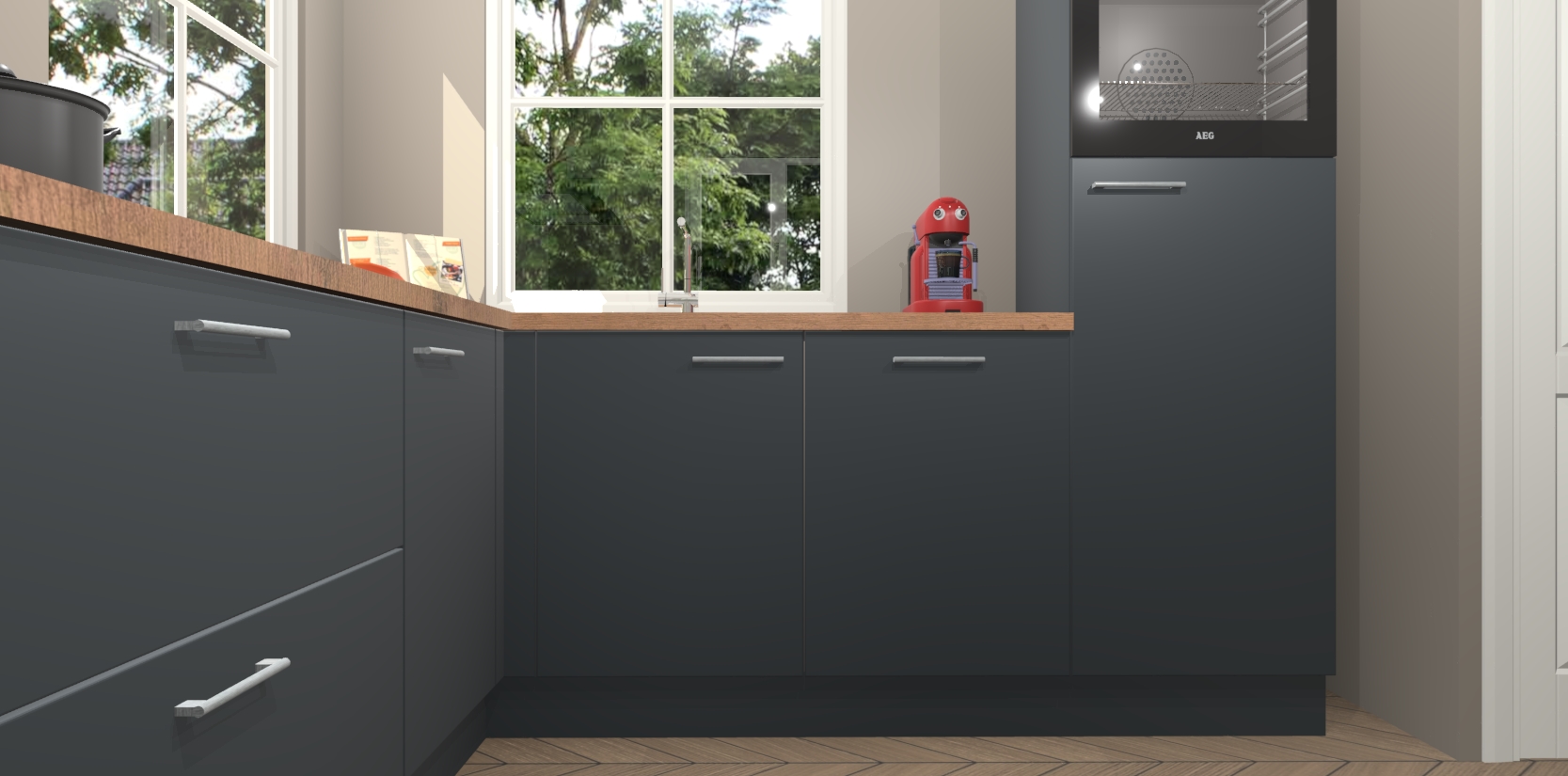 De Onyxgrijze keuken Pai bevat vijf essentiële inbouwapparaten - een oven, inductiekookplaat, afzuigkap, vaatwasser en koelkast - zodat u er na levering meteen in kunt. Voor de slimme kopers die weten dat apparaten vaak het verschil kunnen maken tussen functioneel en luxueus, bieden we eenvoudige upgradeopties naar AEG, van oven naar combimagnetron na bestelling of naar een kookplaat met geïntrigeerde afzuiging. En met onze vaste lage prijs en snelle levering binnen zeven weken vanaf de orderbevestiging hoeft u zich geen zorgen te maken over verborgen kosten of lange levertijden die uw droomkeuken kunnen vertragen.