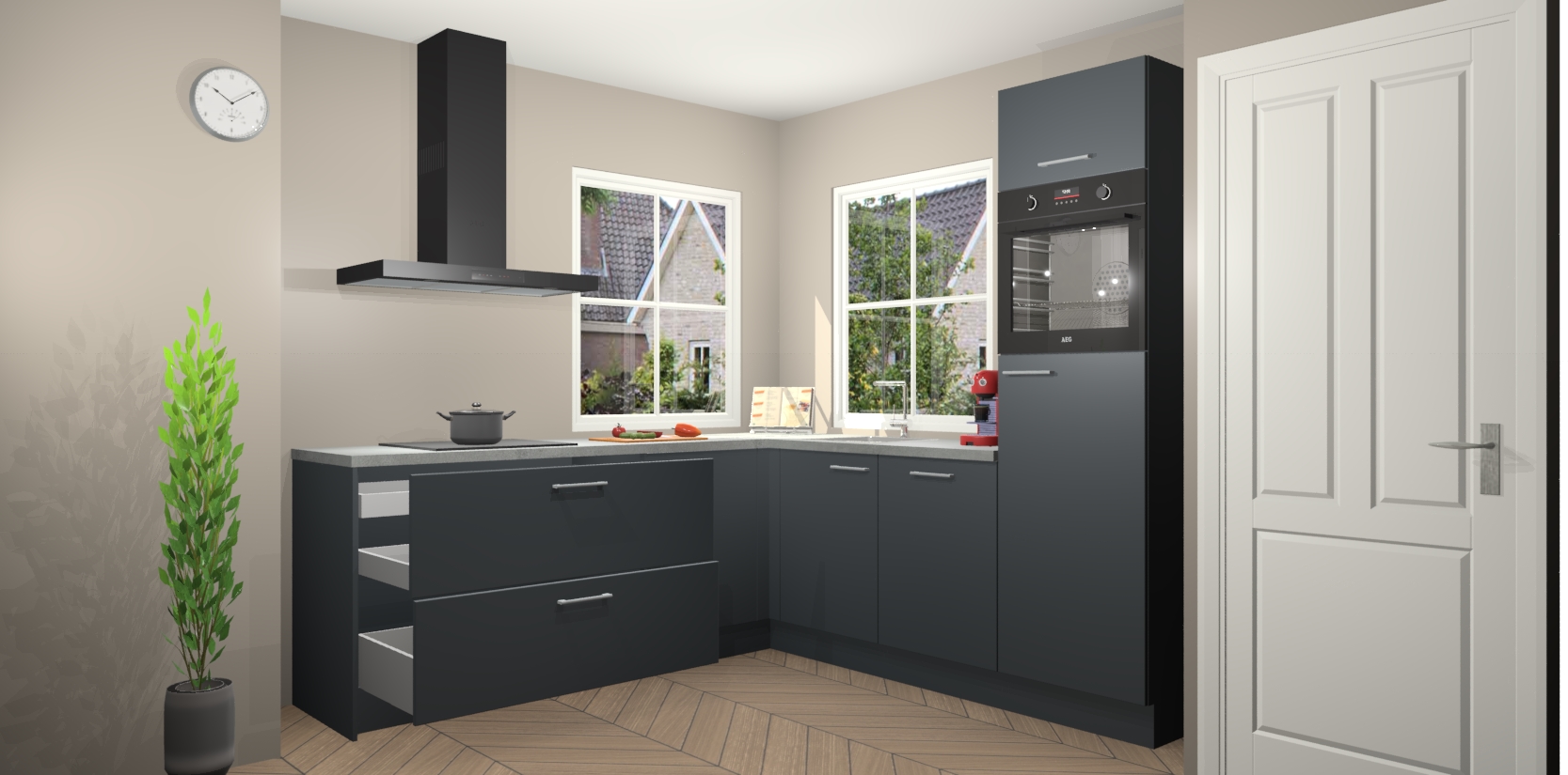 De Onyxgrijze keuken Pai bevat vijf essentiële inbouwapparaten - een oven, inductiekookplaat, afzuigkap, vaatwasser en koelkast - zodat u er na levering meteen in kunt. Voor de slimme kopers die weten dat apparaten vaak het verschil kunnen maken tussen functioneel en luxueus, bieden we eenvoudige upgradeopties naar AEG, van oven naar combimagnetron na bestelling of naar een kookplaat met geïntrigeerde afzuiging. En met onze vaste lage prijs en snelle levering binnen zeven weken vanaf de orderbevestiging hoeft u zich geen zorgen te maken over verborgen kosten of lange levertijden die uw droomkeuken kunnen vertragen.