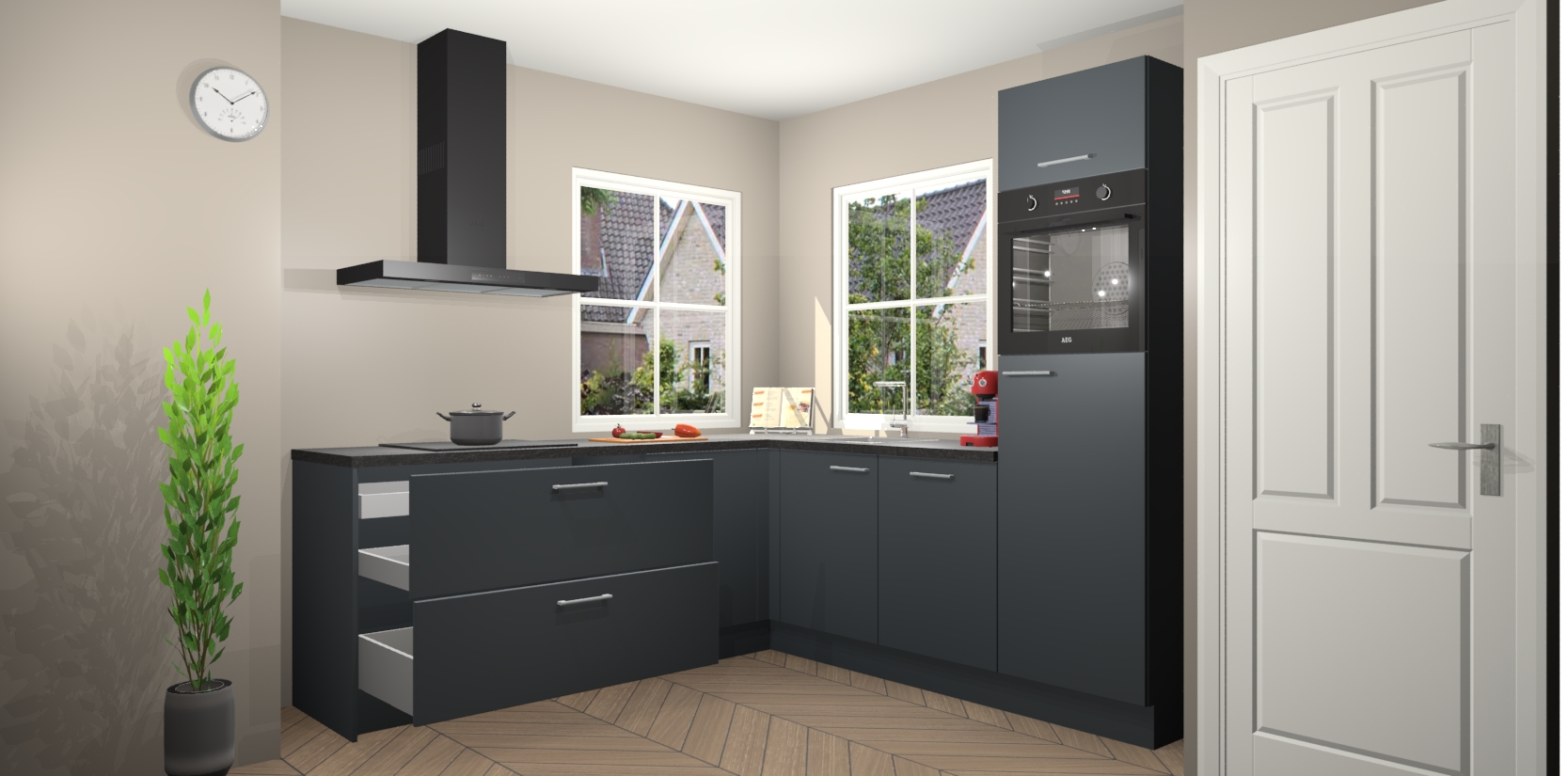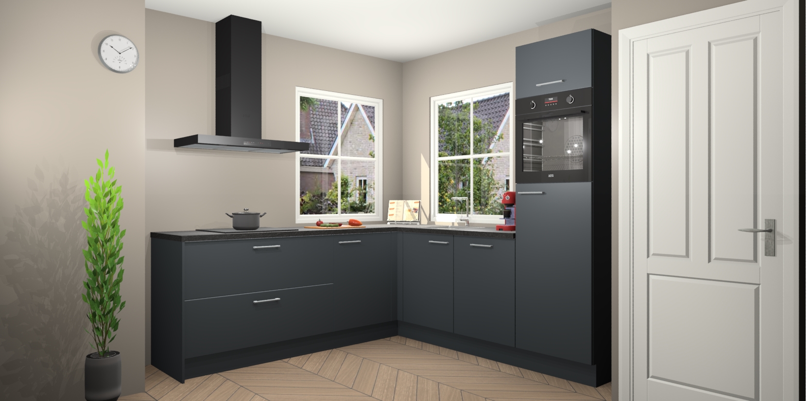 De Onyxgrijze keuken Pai bevat vijf essentiële inbouwapparaten - een oven, inductiekookplaat, afzuigkap, vaatwasser en koelkast - zodat u er na levering meteen in kunt. Voor de slimme kopers die weten dat apparaten vaak het verschil kunnen maken tussen functioneel en luxueus, bieden we eenvoudige upgradeopties naar AEG, van oven naar combimagnetron na bestelling of naar een kookplaat met geïntrigeerde afzuiging. En met onze vaste lage prijs en snelle levering binnen zeven weken vanaf de orderbevestiging hoeft u zich geen zorgen te maken over verborgen kosten of lange levertijden die uw droomkeuken kunnen vertragen.