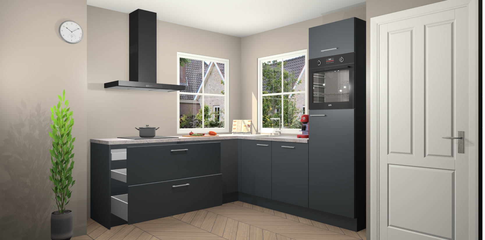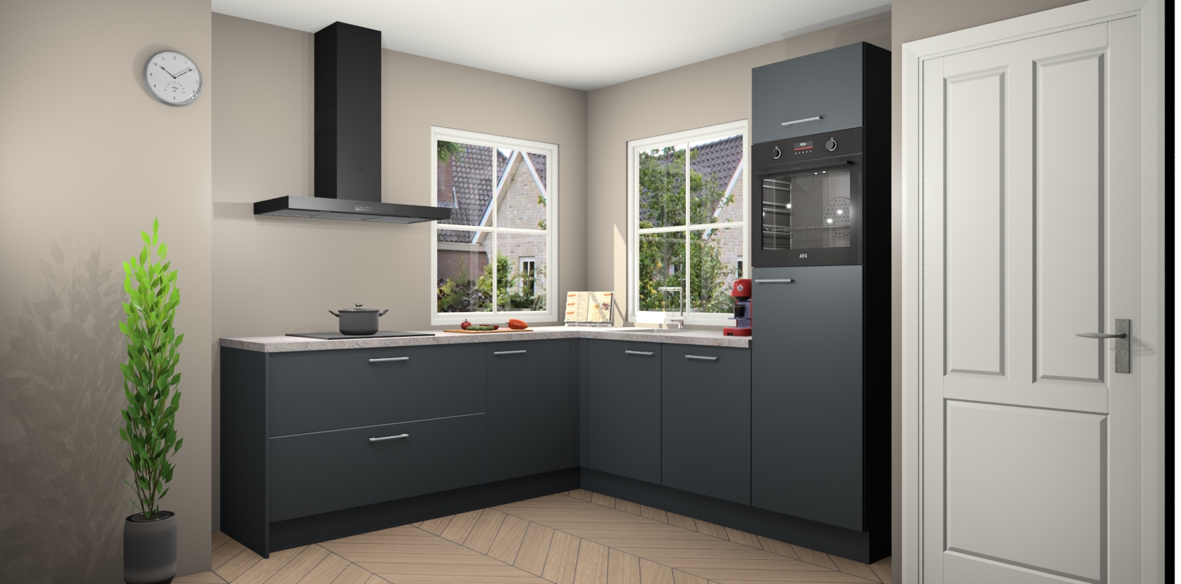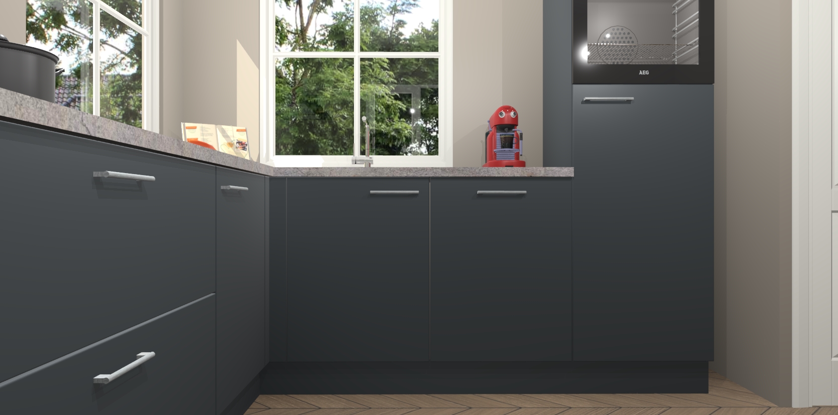 De Onyxgrijze keuken Pai bevat vijf essentiële inbouwapparaten - een oven, inductiekookplaat, afzuigkap, vaatwasser en koelkast - zodat u er na levering meteen in kunt. Voor de slimme kopers die weten dat apparaten vaak het verschil kunnen maken tussen functioneel en luxueus, bieden we eenvoudige upgradeopties naar AEG, van oven naar combimagnetron na bestelling of naar een kookplaat met geïntrigeerde afzuiging. En met onze vaste lage prijs en snelle levering binnen zeven weken vanaf de orderbevestiging hoeft u zich geen zorgen te maken over verborgen kosten of lange levertijden die uw droomkeuken kunnen vertragen.