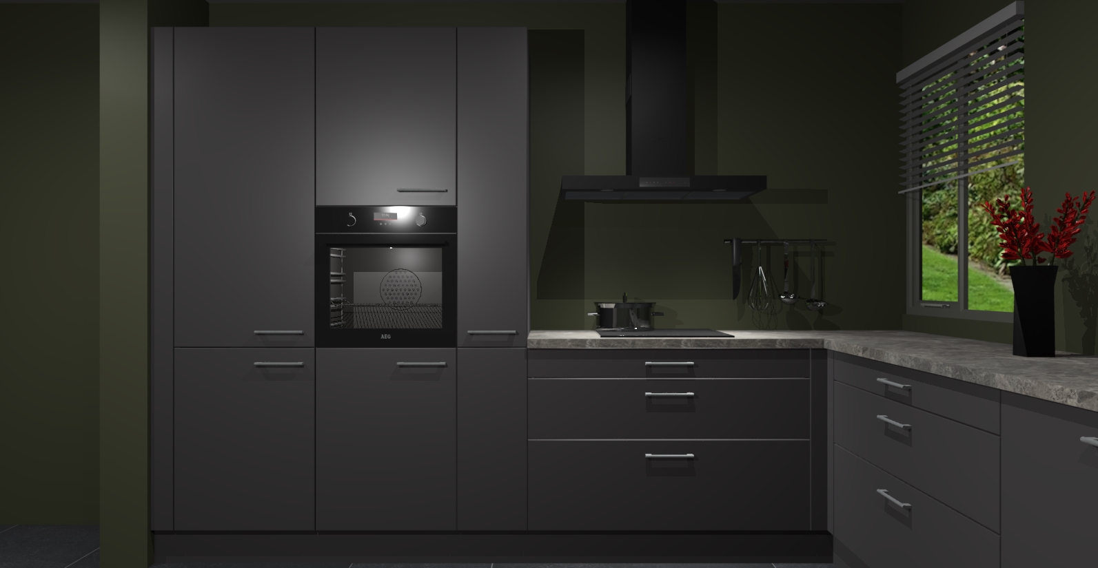 Welkom bij de onyxgrijze keuken Palermo. Deze prachtige keuken zal de komende jaren het middelpunt van de belangstelling in uw huis zijn. Uitgerust met vijf inbouwapparaten komt u nooit kookgereedschap tekort. Bovendien geeft de warme houtlook elke ruimte een uitnodigende en tijdloze uitstraling.