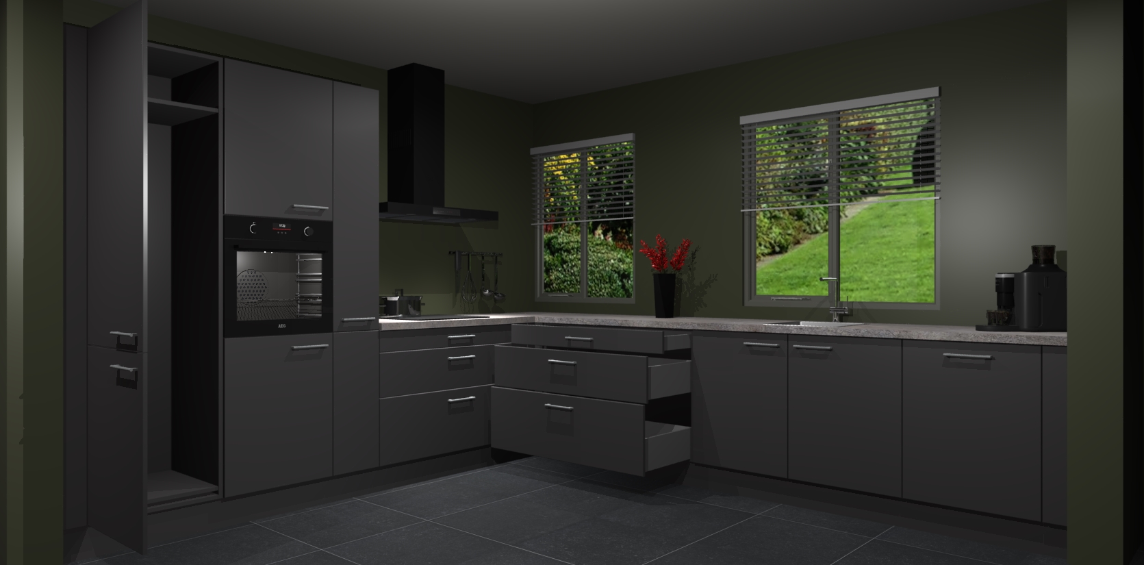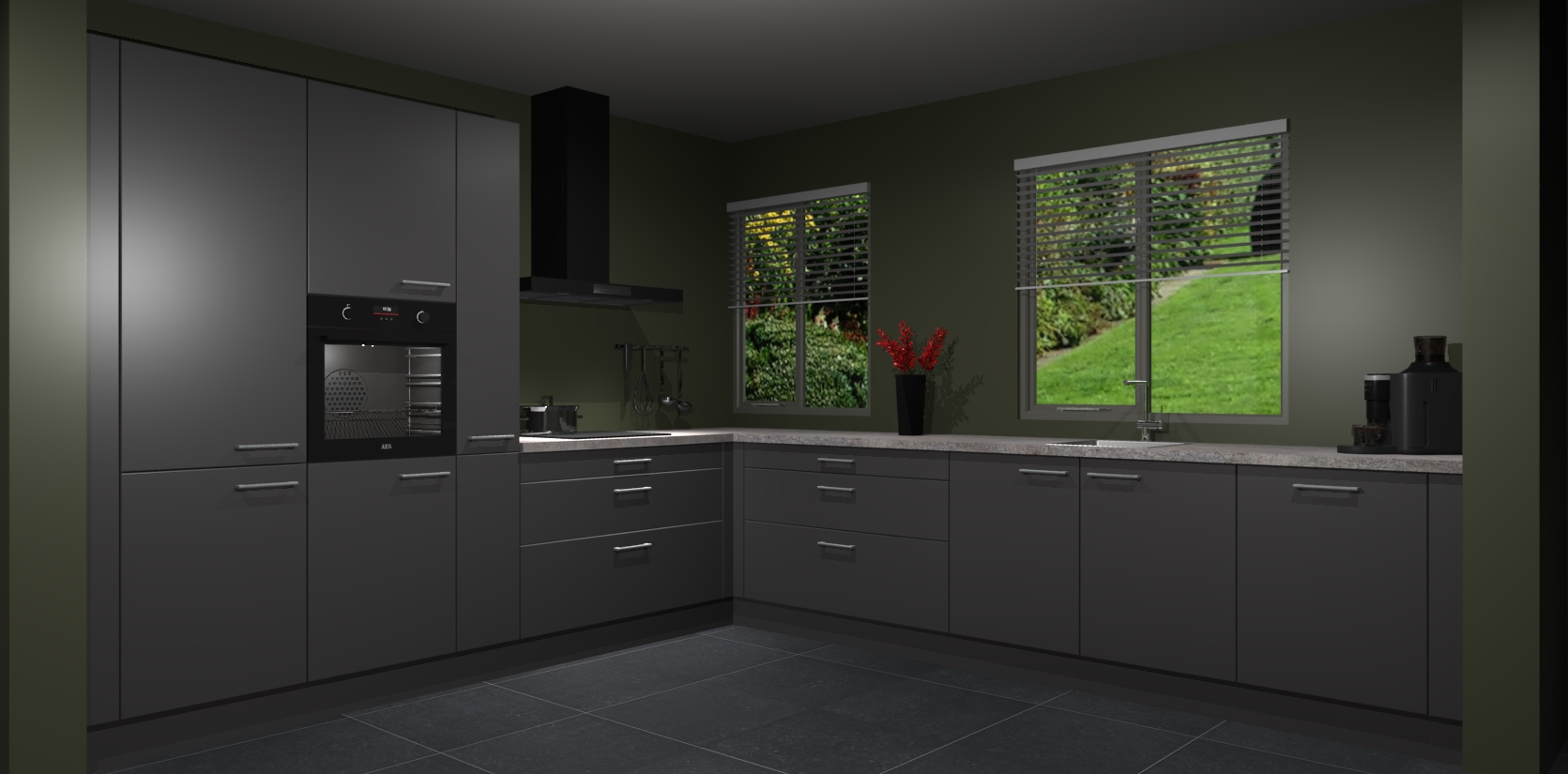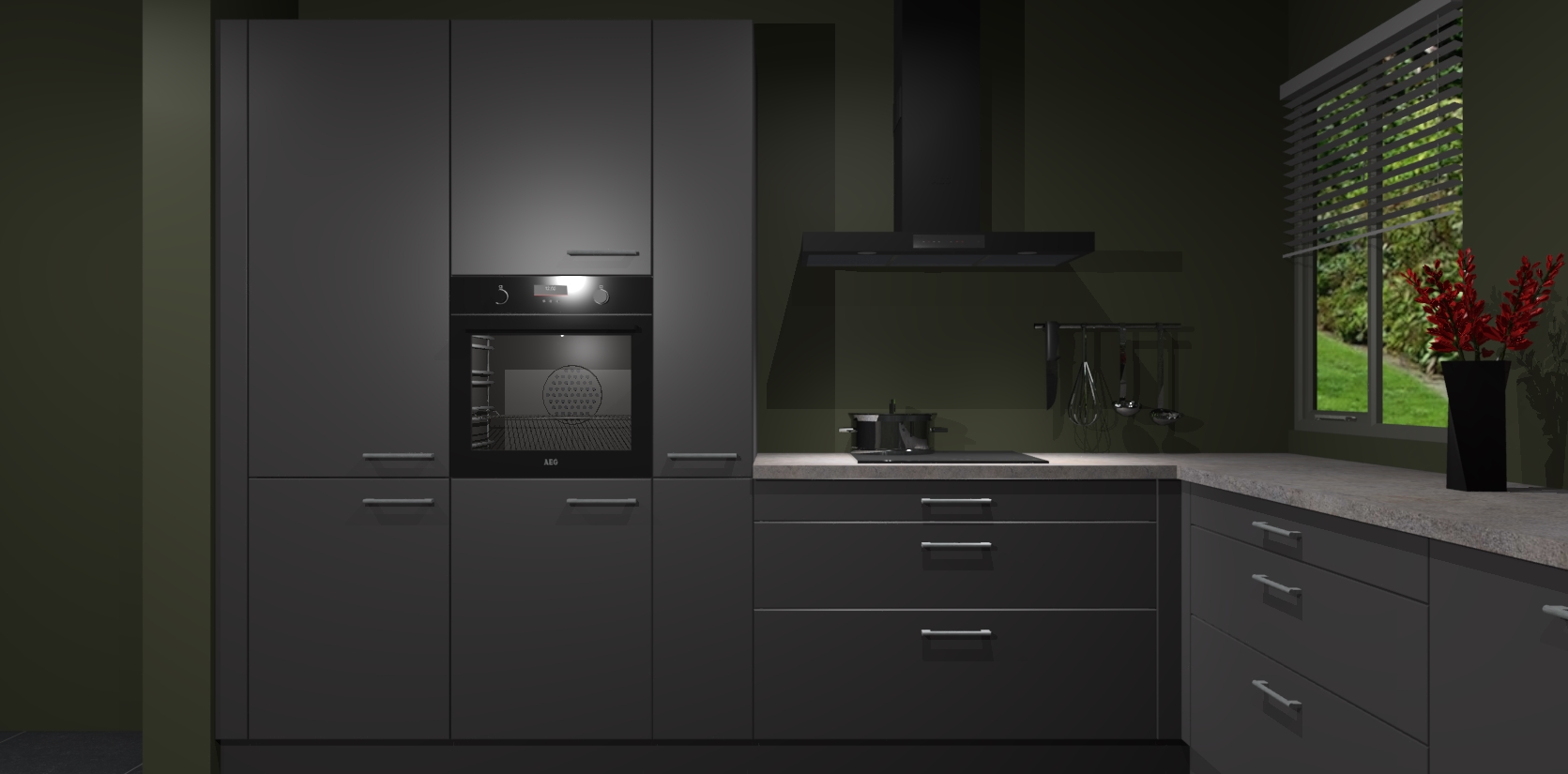 Welkom bij de onyxgrijze keuken Palermo. Deze prachtige keuken zal de komende jaren het middelpunt van de belangstelling in uw huis zijn. Uitgerust met vijf inbouwapparaten komt u nooit kookgereedschap tekort. Bovendien geeft de warme houtlook elke ruimte een uitnodigende en tijdloze uitstraling.
