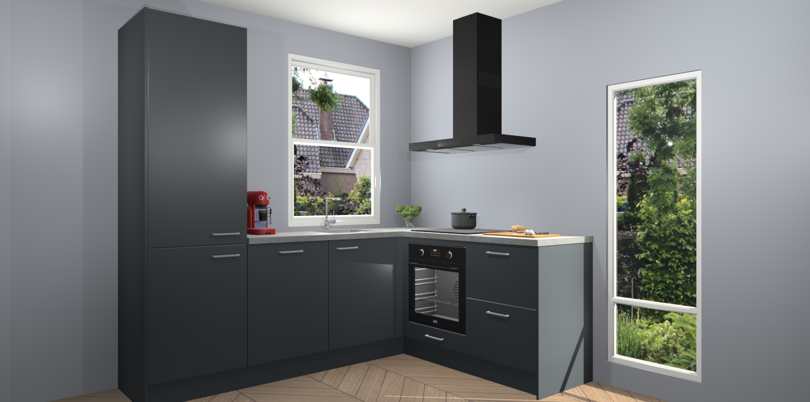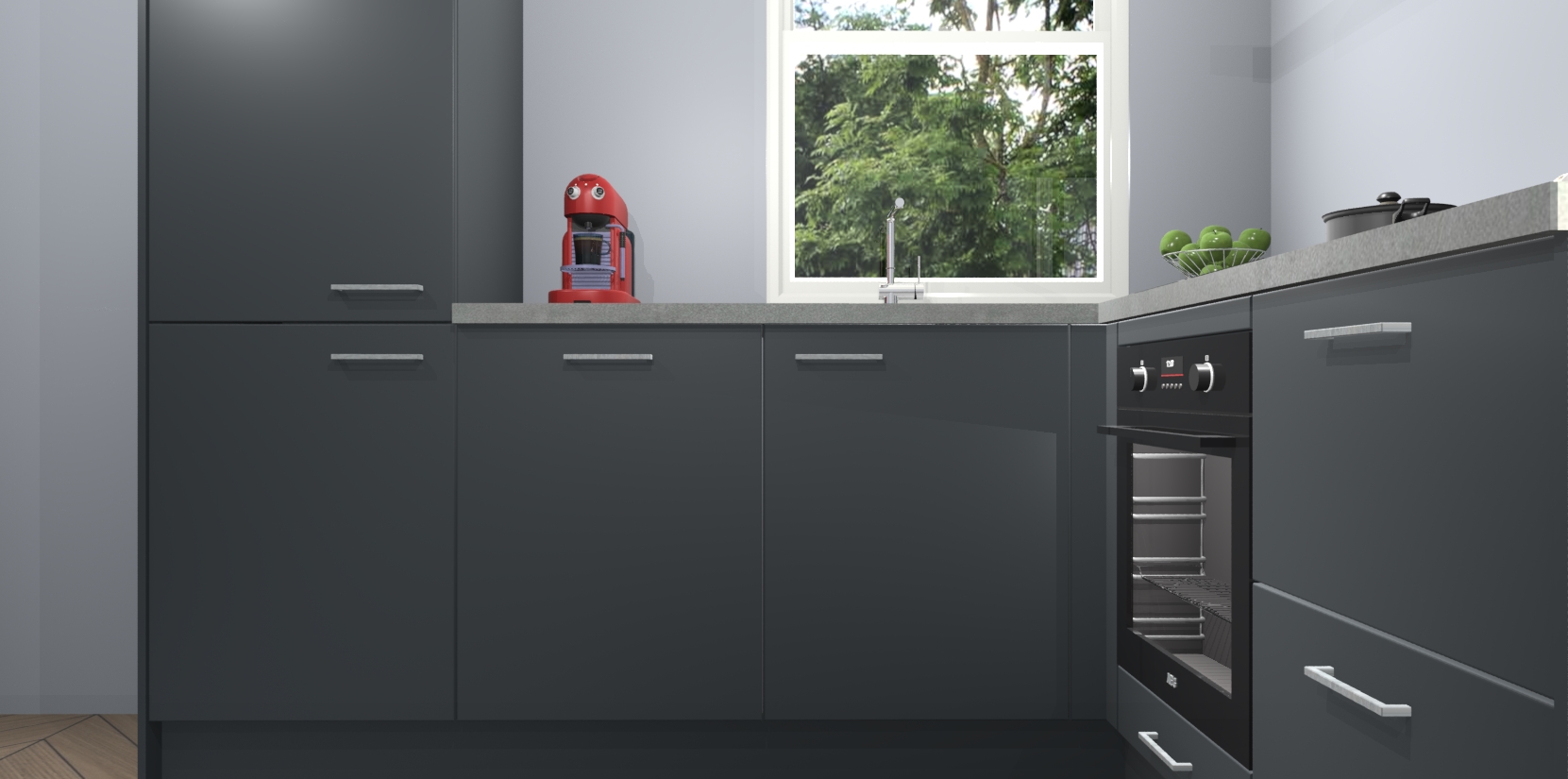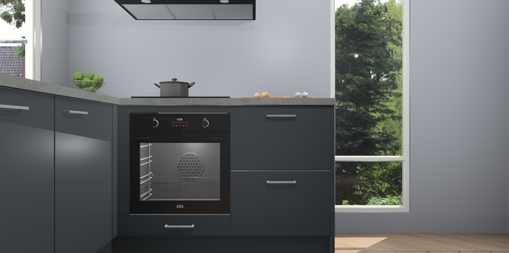 De Onyxgrijze keuken Phuket heeft alles wat u maar kunt wensen. Niet alleen zijn er softclose deuren, maar ook 5 ingebouwde apparaten: een oven, inductiekookplaat, afzuigkap, vaatwasser en koelkast - waarbij u later gemakkelijk naar het AEG merk, van inductiekookplaat naar kookplaat met geïntegreerde afzuiging of van oven naar combimagnetron kunt upgraden. Dat alles tegen een vast laag tarief! Bovendien geeft de Onyxgrijze keuken Phuket supersnelle levering van 7 weken. Echt iets voor u als u er niet op wilt wachten om het resultaat te zien in eigen keuken!