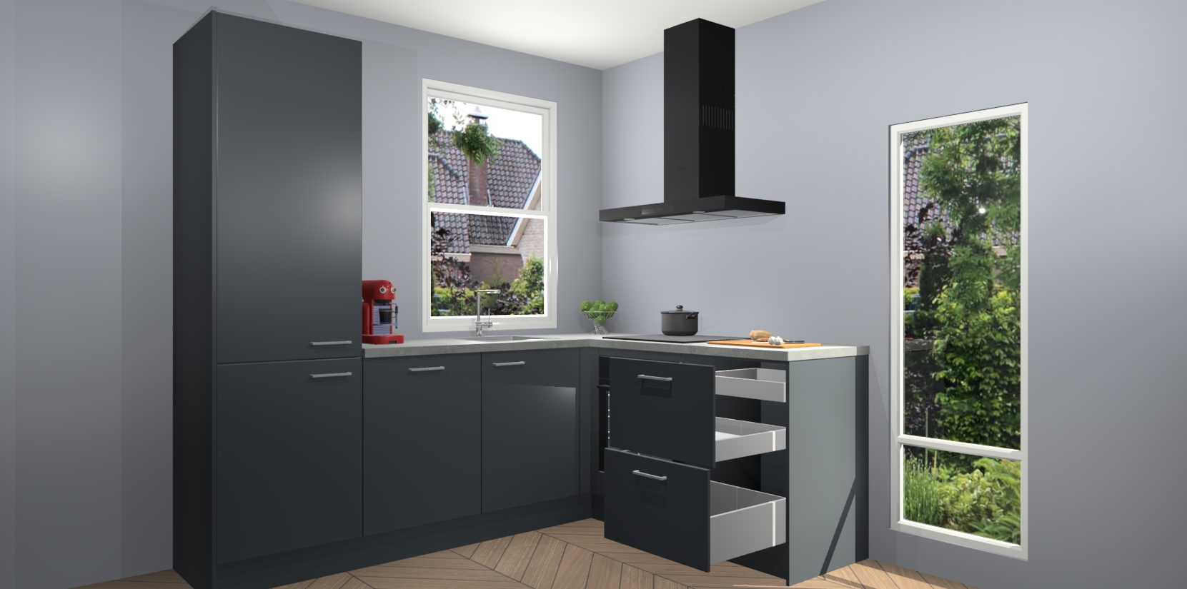 De prachtige Onyxgrijze keuken Phuket is de perfecte keuze als u op zoek bent naar een moderne hoekkeuken met alle luxe en comfort die u kunt verwachten! De uitstraling in het houtlook-design draagt bij aan de warme sfeer die u nu al voelt wanneer u er naar kijkt. Heeft u genoeg van ouderwetse keukens? Probeer dan direct deze moderne, mooie hoekkeukens en laat iedereen verbluft achter!