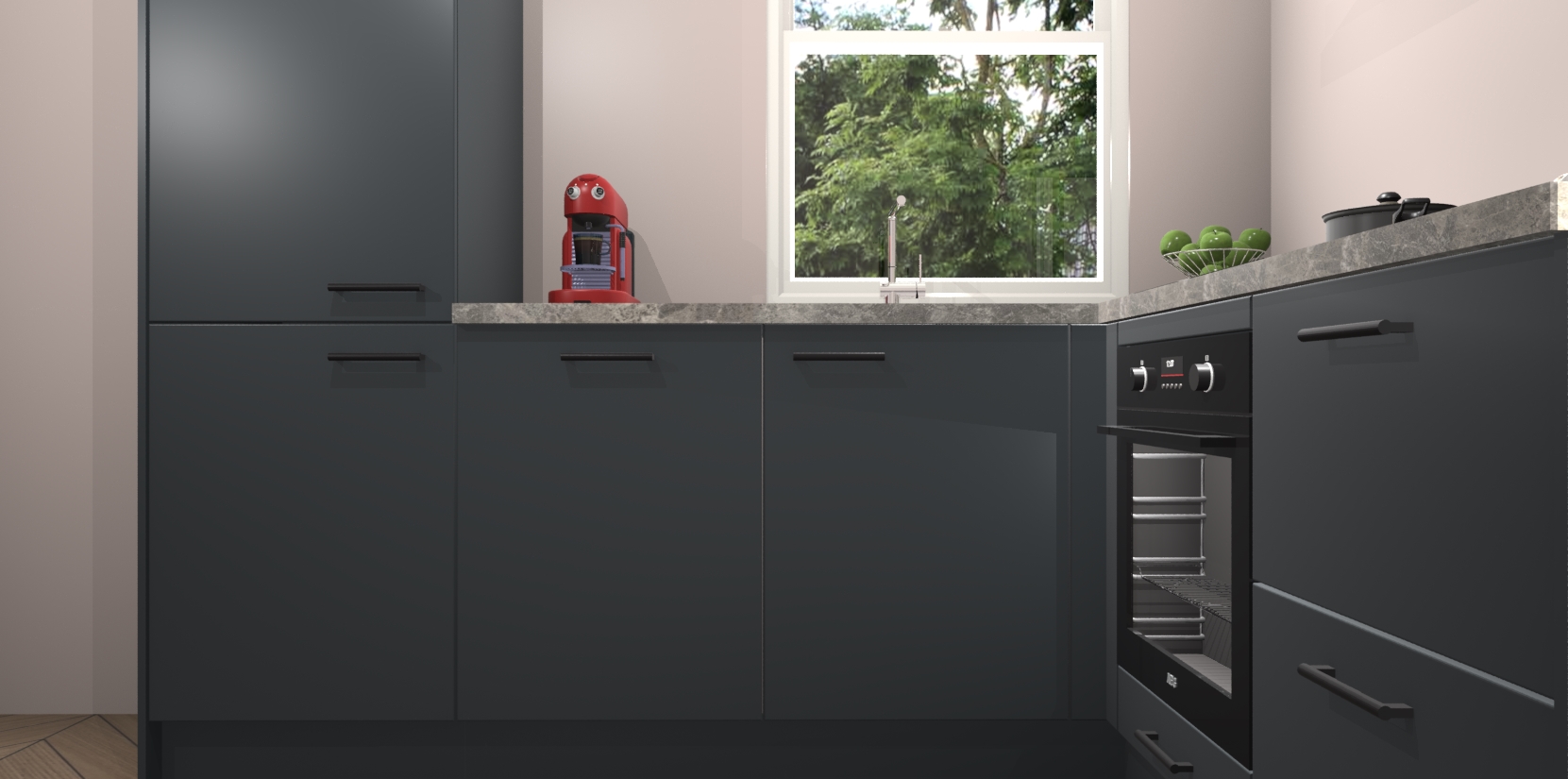 De Onyxgrijze keuken Phuket heeft alles wat u maar kunt wensen. Niet alleen zijn er softclose deuren, maar ook 5 ingebouwde apparaten: een oven, inductiekookplaat, afzuigkap, vaatwasser en koelkast - waarbij u later gemakkelijk naar het AEG merk, van inductiekookplaat naar kookplaat met geïntegreerde afzuiging of van oven naar combimagnetron kunt upgraden. Dat alles tegen een vast laag tarief! Bovendien geeft de Onyxgrijze keuken Phuket supersnelle levering van 7 weken. Echt iets voor u als u er niet op wilt wachten om het resultaat te zien in eigen keuken!