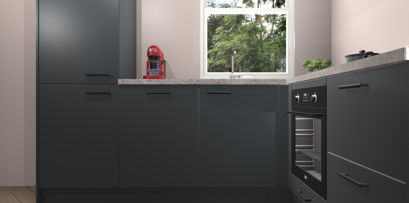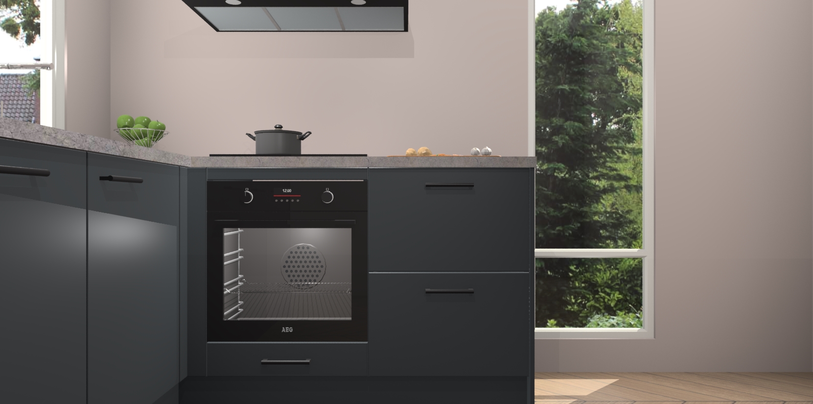 De Onyxgrijze keuken Phuket heeft alles wat u maar kunt wensen. Niet alleen zijn er softclose deuren, maar ook 5 ingebouwde apparaten: een oven, inductiekookplaat, afzuigkap, vaatwasser en koelkast - waarbij u later gemakkelijk naar het AEG merk, van inductiekookplaat naar kookplaat met geïntegreerde afzuiging of van oven naar combimagnetron kunt upgraden. Dat alles tegen een vast laag tarief! Bovendien geeft de Onyxgrijze keuken Phuket supersnelle levering van 7 weken. Echt iets voor u als u er niet op wilt wachten om het resultaat te zien in eigen keuken!