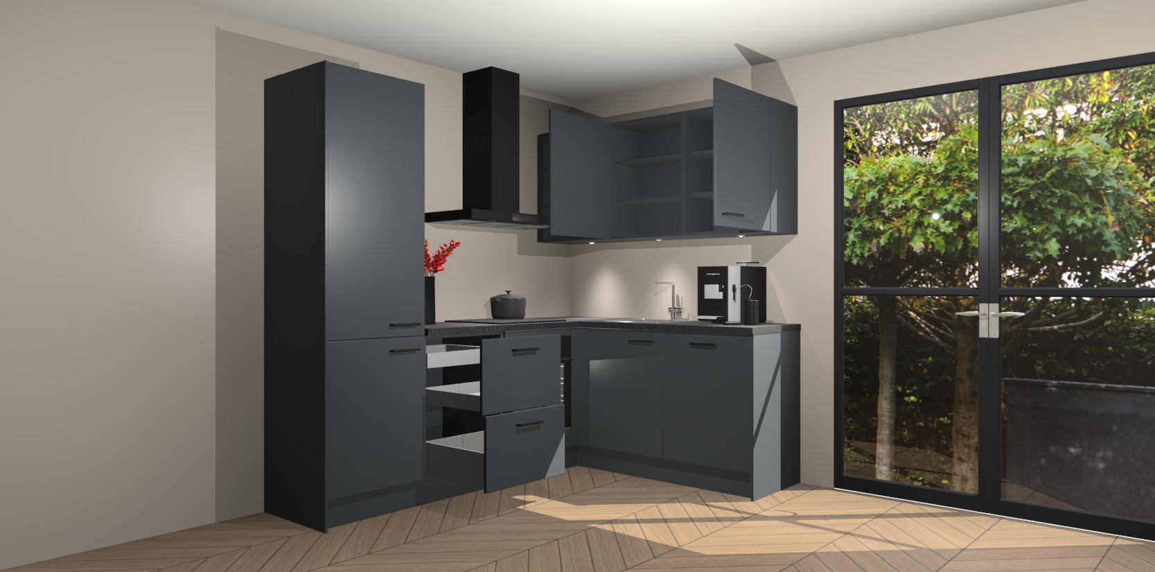 Wauw, dit is de onyxgrijze keuken Pilsen! U kunt gerust zeggen dat u elegantie combineert met functionaliteit met deze keuken. Met een modern en chique ontwerp is de keuken precies wat u nodig heeft om uw ruimte te verfraaien. De binnenzijde van de kasten is in dezelfde donkere kleur als de buitenzijde voor een uniforme look, compleet met softclose-kasten die stil sluiten.
