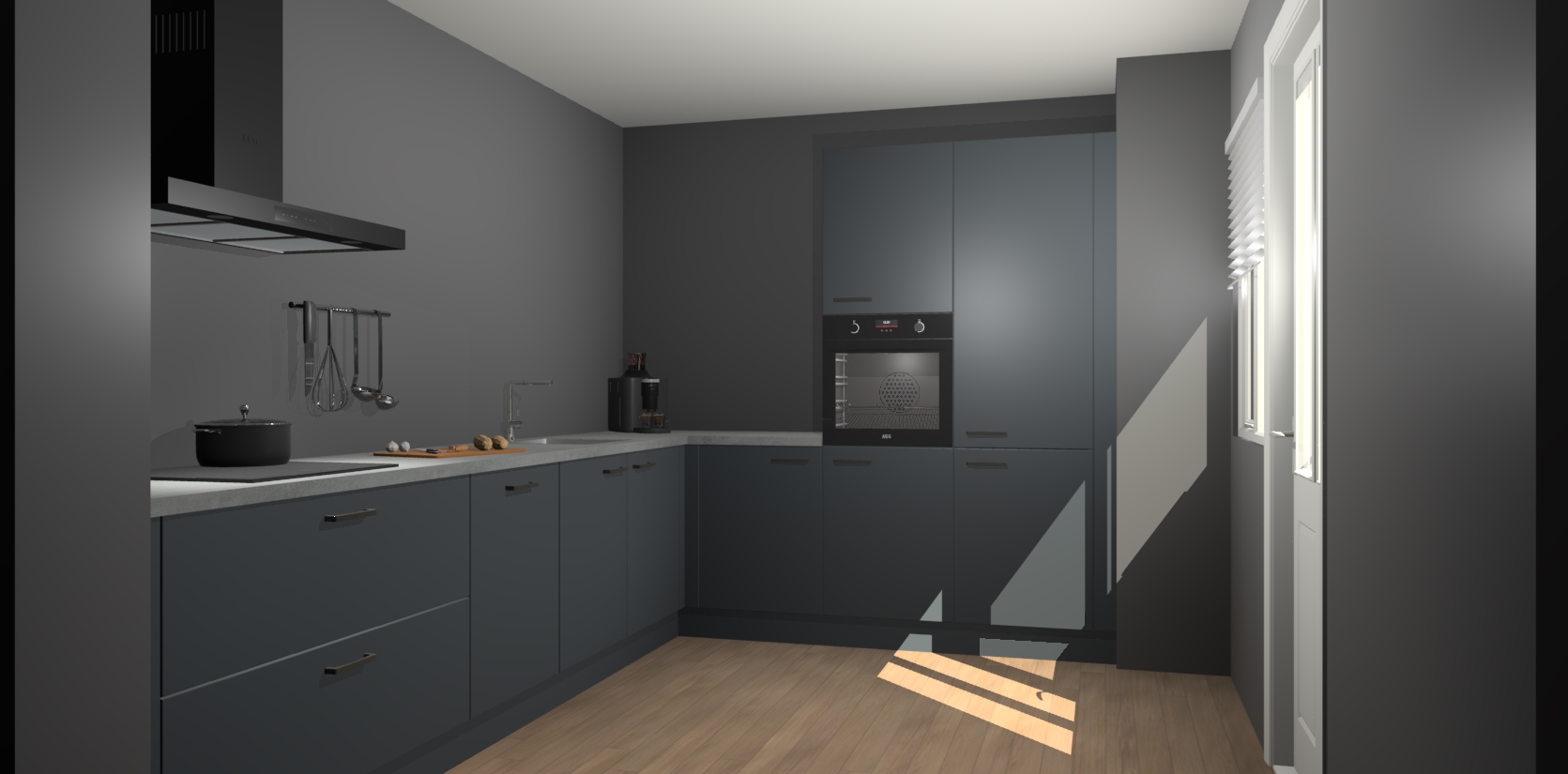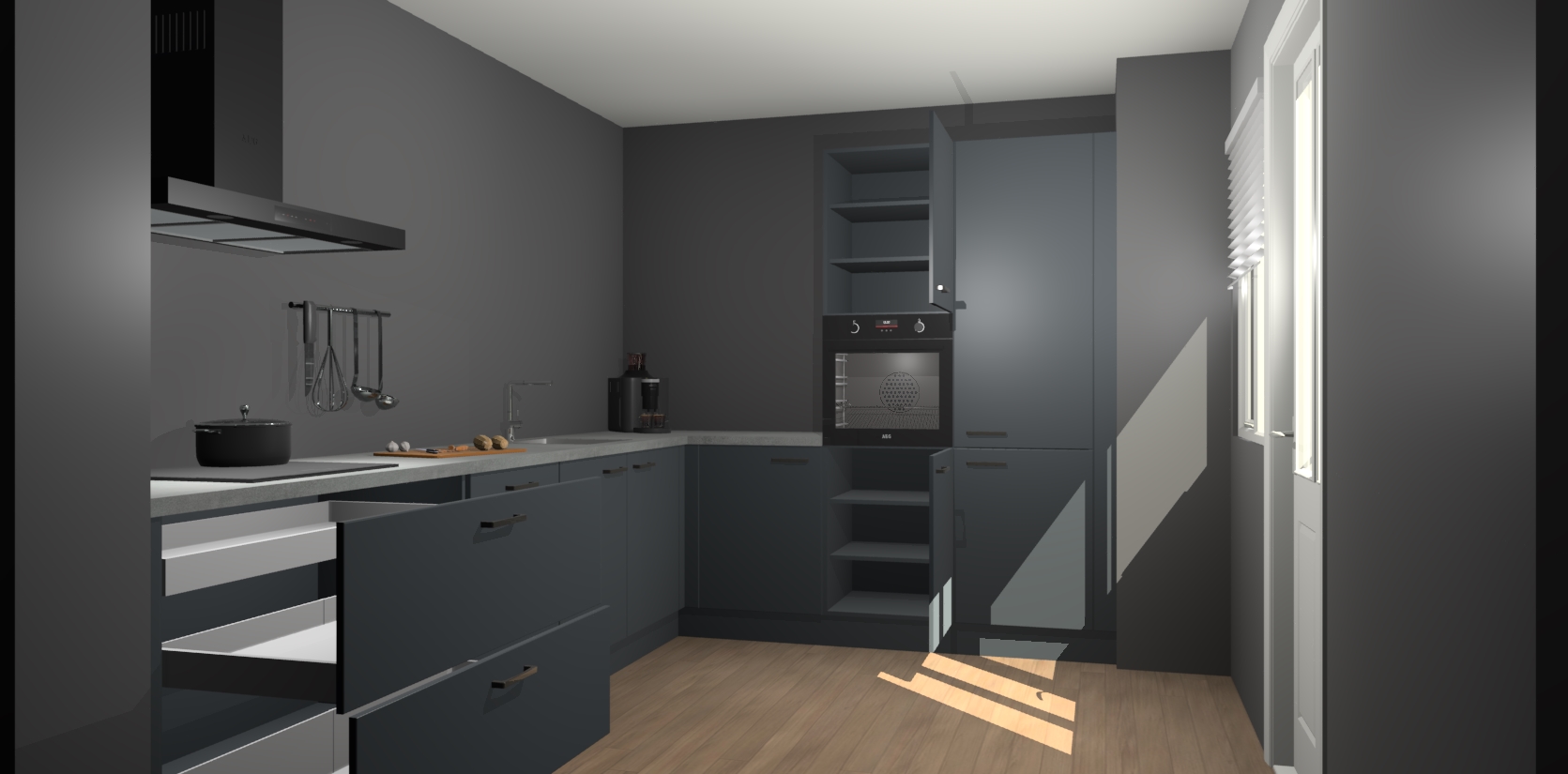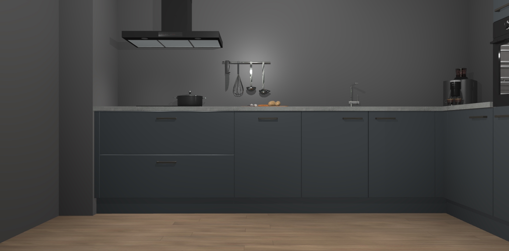 Welkom bij de onyxgrijze keuken Portland. Deze prachtige keuken zal de komende jaren het middelpunt van de belangstelling in uw huis zijn. Uitgerust met vijf inbouwapparaten komt u nooit kookgereedschap tekort. Bovendien geeft de warme houtlook elke ruimte een uitnodigende en tijdloze uitstraling.