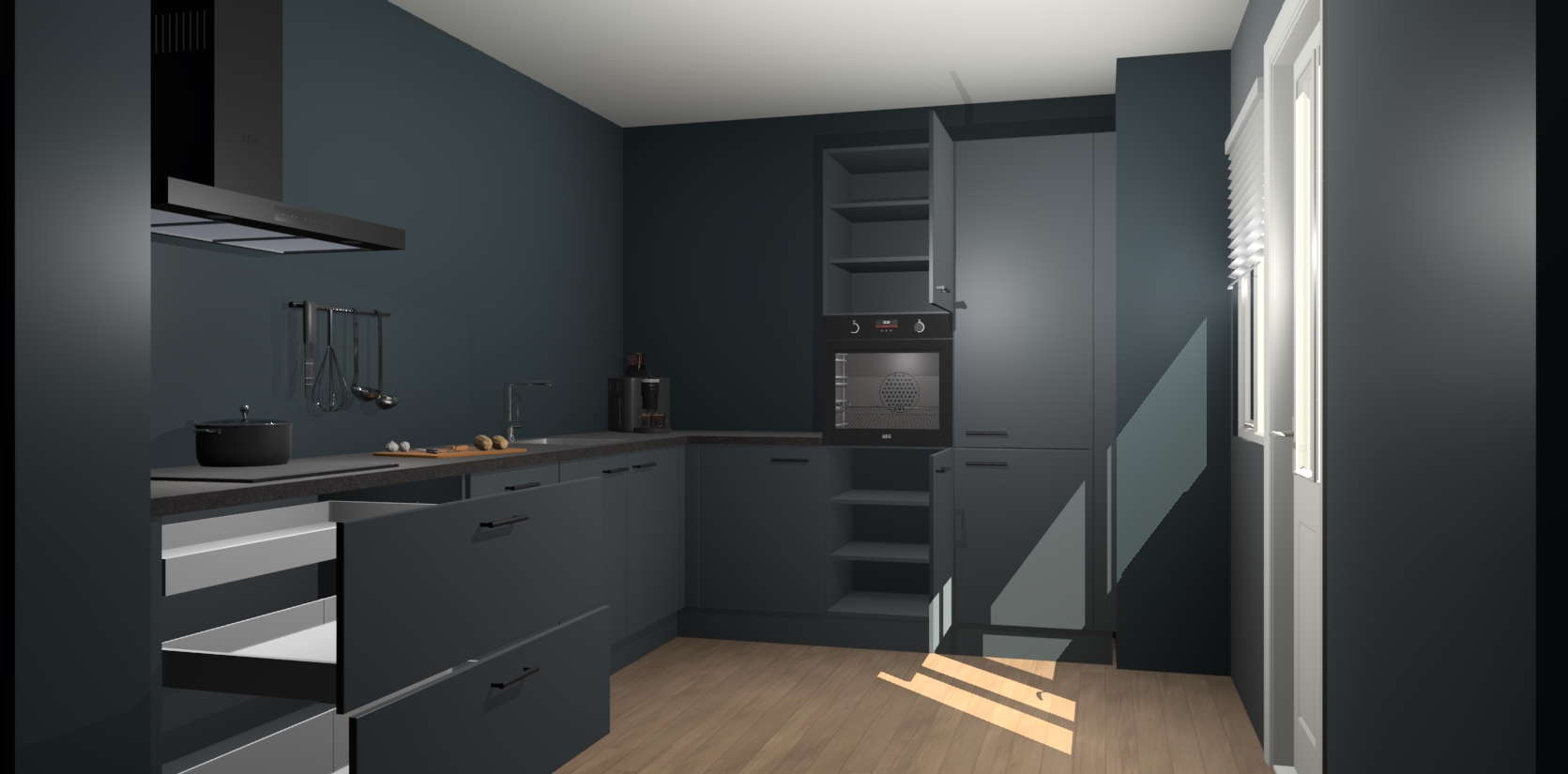 Welkom bij de onyxgrijze keuken Portland. Deze prachtige keuken zal de komende jaren het middelpunt van de belangstelling in uw huis zijn. Uitgerust met vijf inbouwapparaten komt u nooit kookgereedschap tekort. Bovendien geeft de warme houtlook elke ruimte een uitnodigende en tijdloze uitstraling.
