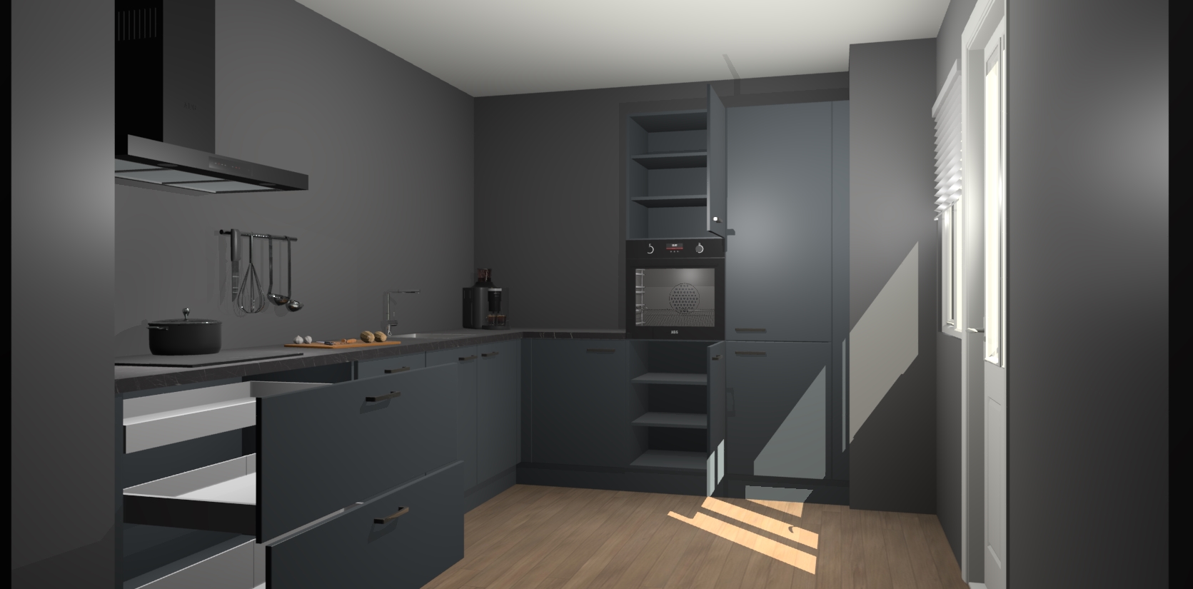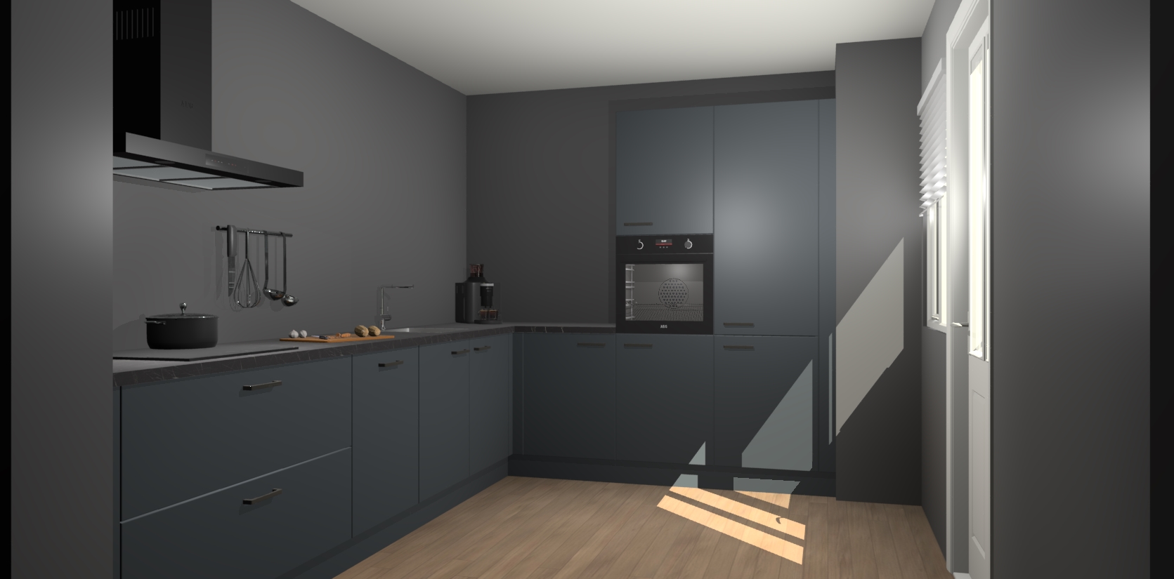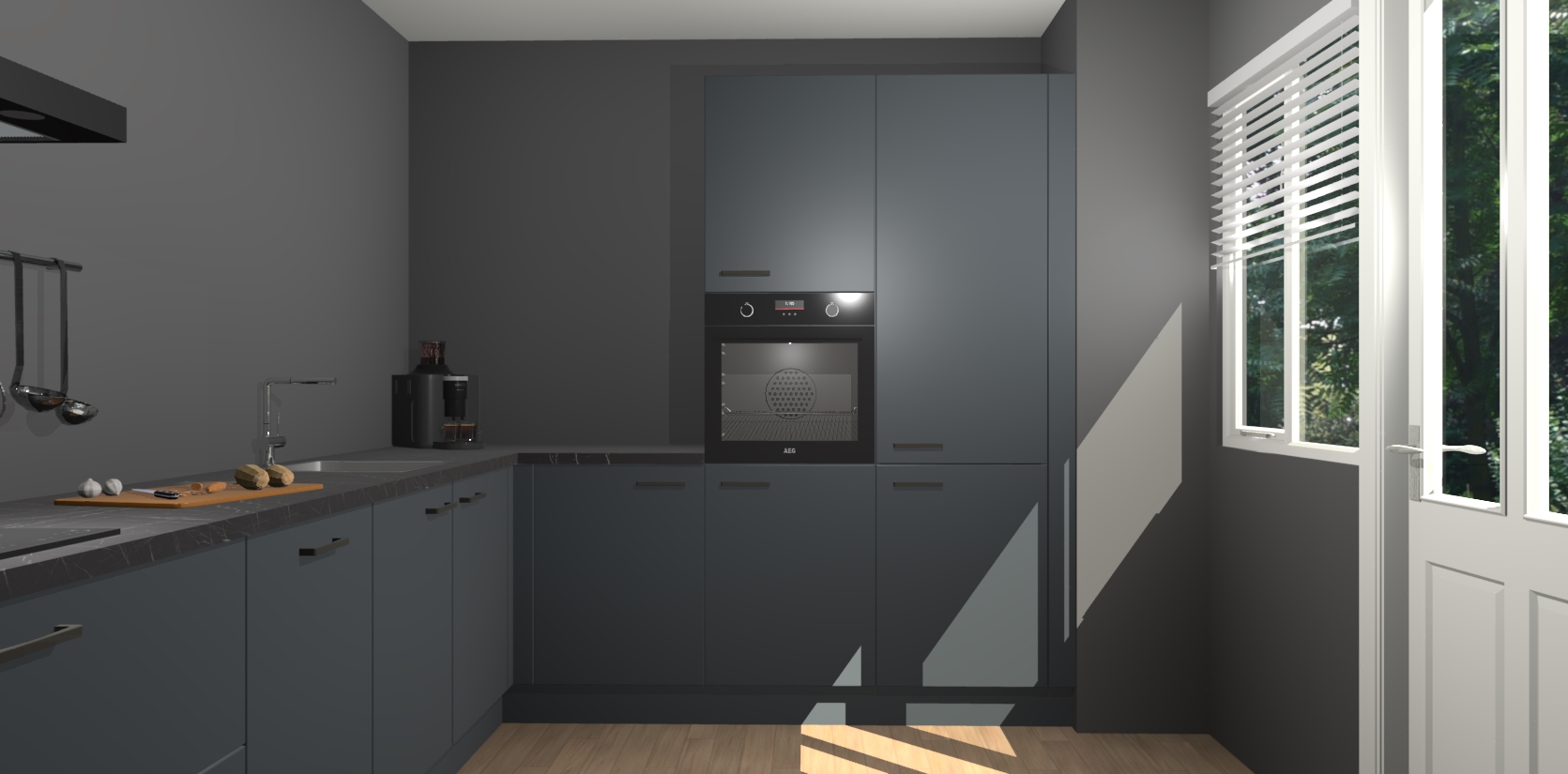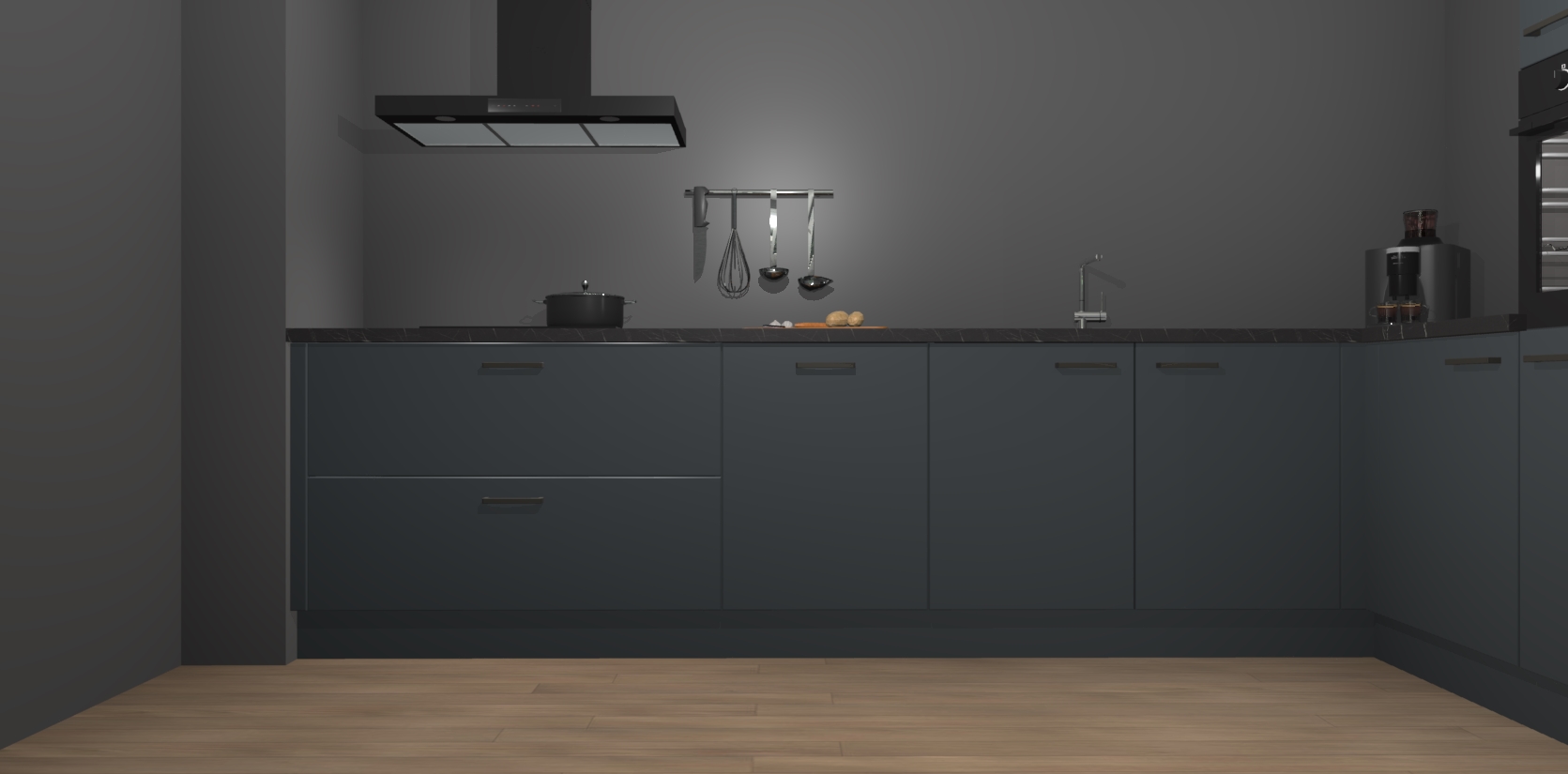 Welkom bij de onyxgrijze keuken Portland. Deze prachtige keuken zal de komende jaren het middelpunt van de belangstelling in uw huis zijn. Uitgerust met vijf inbouwapparaten komt u nooit kookgereedschap tekort. Bovendien geeft de warme houtlook elke ruimte een uitnodigende en tijdloze uitstraling.