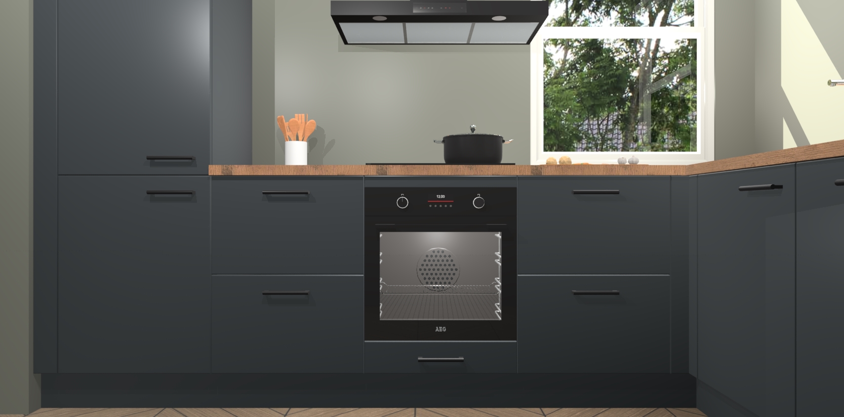 Wat maakt deze keuken zo bijzonder? Ten eerste geeft het houten werkblad uw ruimte een onmiskenbaar klassieke uitstraling. De natuurlijke afwerking roept warmte en elegantie op die nooit uit de mode zullen raken. Bovendien is het gemakkelijk schoon te houden en te onderhouden, zodat je er jarenlang plezier van kunt hebben. Als u op zoek bent naar extra gemak in uw keuken, dan heeft u bij het plaatsen van een bestelling bij ons ook de optie om uw toestellen te upgraden naar AEG-modellen - zo haalt u moderne innovatie van topmerken in apparatentechnologie rechtstreeks in huis.