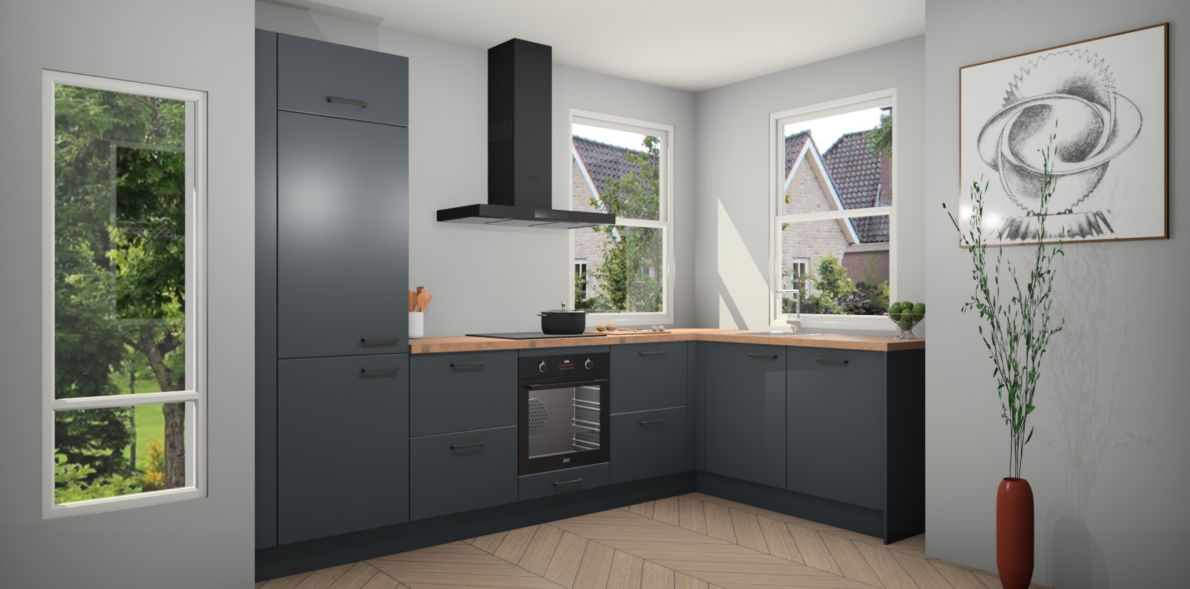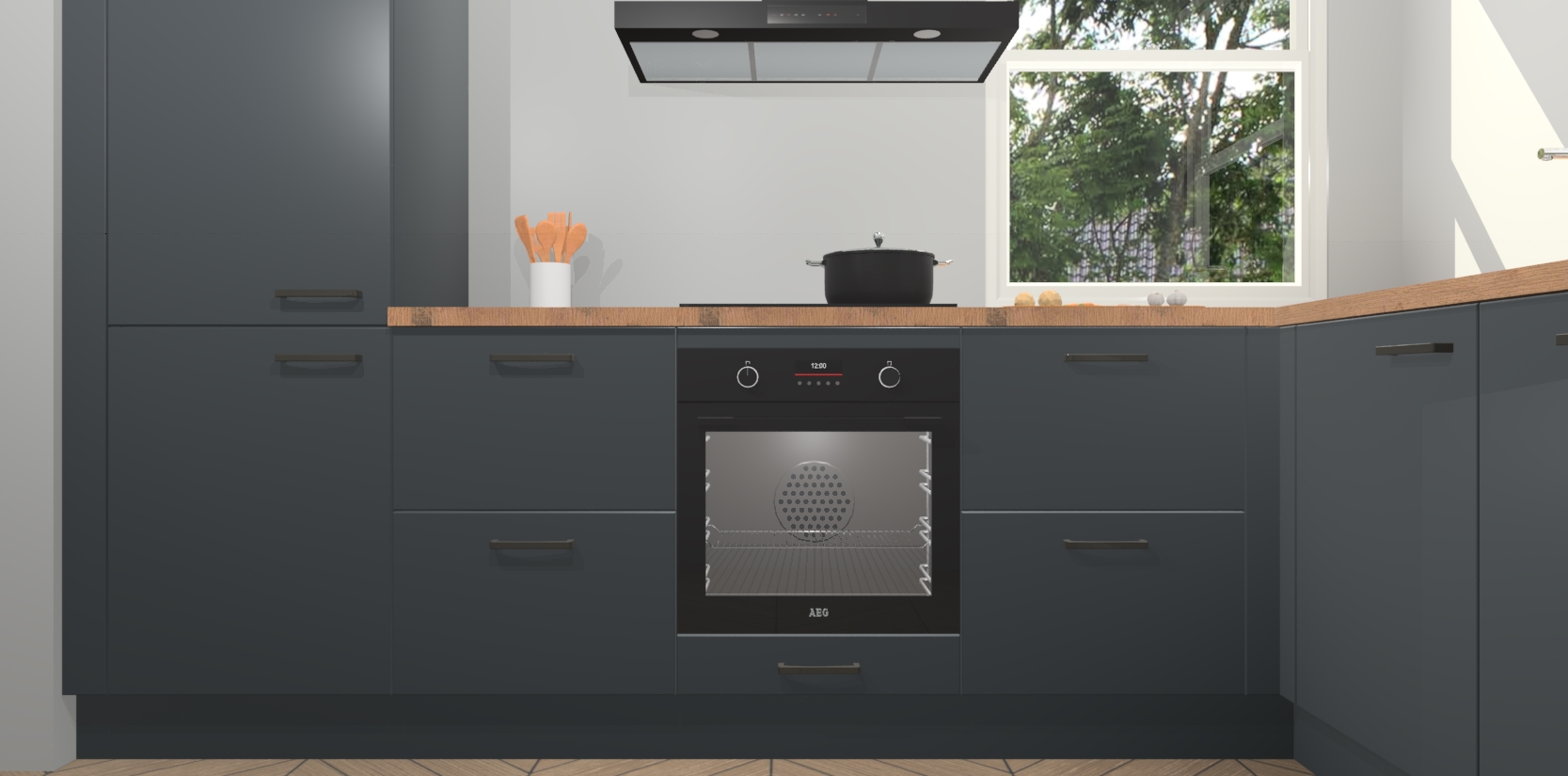 Wat maakt deze keuken zo bijzonder? Ten eerste geeft het houten werkblad uw ruimte een onmiskenbaar klassieke uitstraling. De natuurlijke afwerking roept warmte en elegantie op die nooit uit de mode zullen raken. Bovendien is het gemakkelijk schoon te houden en te onderhouden, zodat je er jarenlang plezier van kunt hebben. Als u op zoek bent naar extra gemak in uw keuken, dan heeft u bij het plaatsen van een bestelling bij ons ook de optie om uw toestellen te upgraden naar AEG-modellen - zo haalt u moderne innovatie van topmerken in apparatentechnologie rechtstreeks in huis.