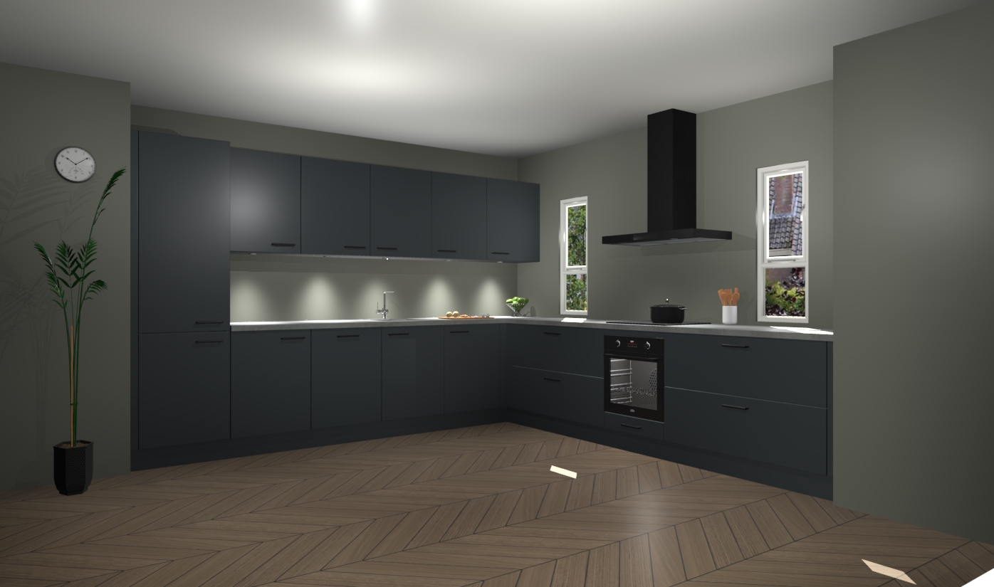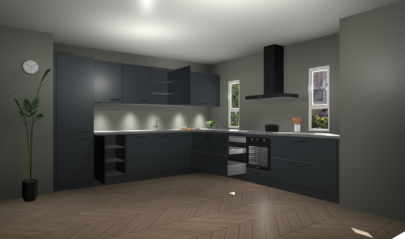 De onyxgrijze keuken is een ideale hoekkeuken en heeft alle functies en apparatuur die u maar nodig kunt hebben. Bij de bestelling krijgt u een oven, inductiekookplaat, afzuigkap, vaatwasser en koelkast - deze kunnen desgewenst eenvoudig worden uitgebreid naar AEG na bestellen. Elke kast wordt ook voor gemonteerd geleverd met soft close deuren die jarenlang gebruik beloven. Stelt u zich voor dat u geen gedoe heeft met vervelende montage - vanaf het moment dat u uw bestelling plaats, duurt het slechts 7 weken voor het bij u thuis geleverd wordt.