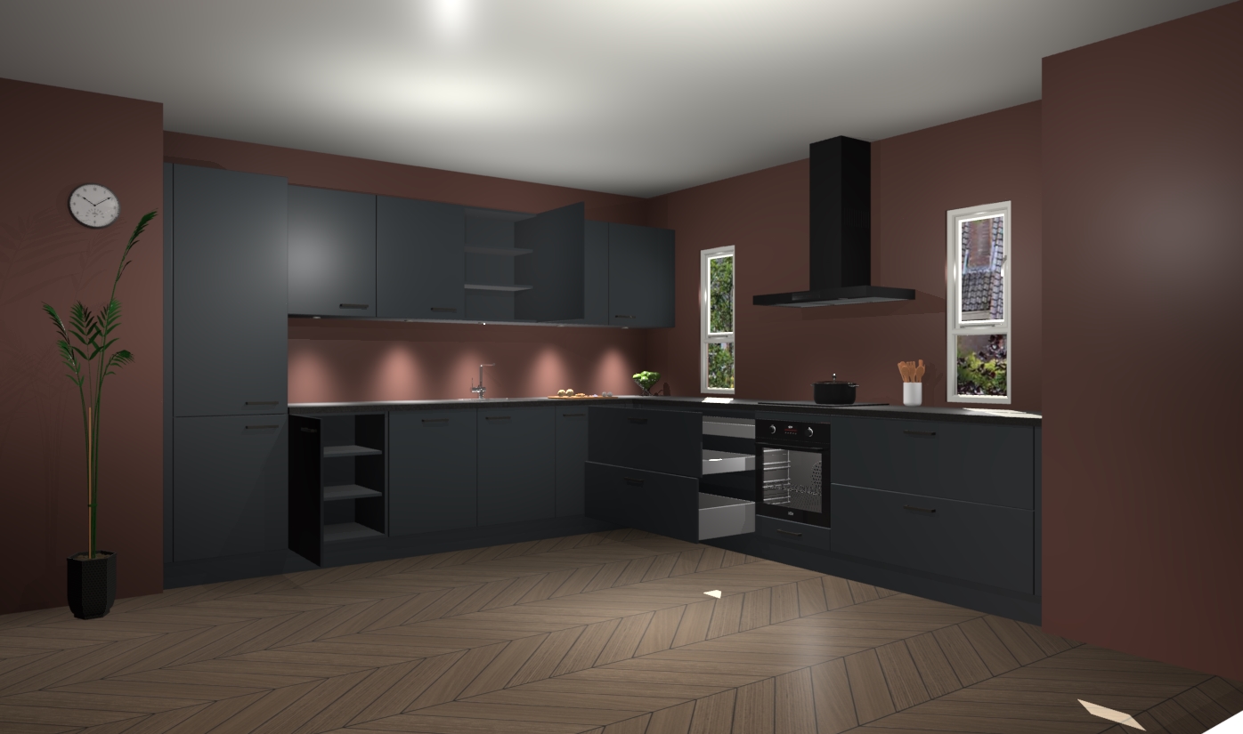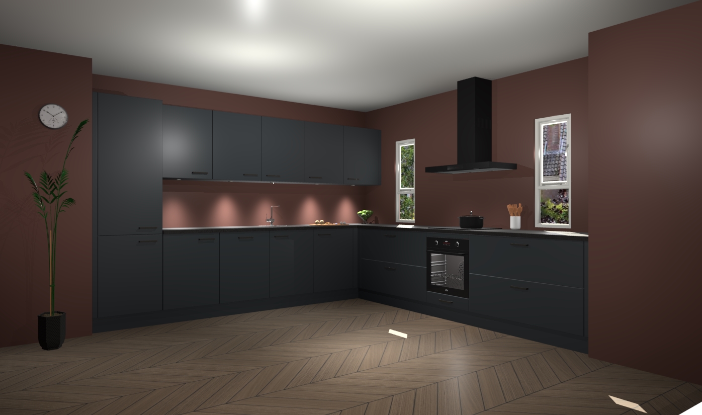 De onyxgrijze keuken is een ideale hoekkeuken en heeft alle functies en apparatuur die u maar nodig kunt hebben. Bij de bestelling krijgt u een oven, inductiekookplaat, afzuigkap, vaatwasser en koelkast - deze kunnen desgewenst eenvoudig worden uitgebreid naar AEG na bestellen. Elke kast wordt ook voor gemonteerd geleverd met soft close deuren die jarenlang gebruik beloven. Stelt u zich voor dat u geen gedoe heeft met vervelende montage - vanaf het moment dat u uw bestelling plaats, duurt het slechts 7 weken voor het bij u thuis geleverd wordt.
